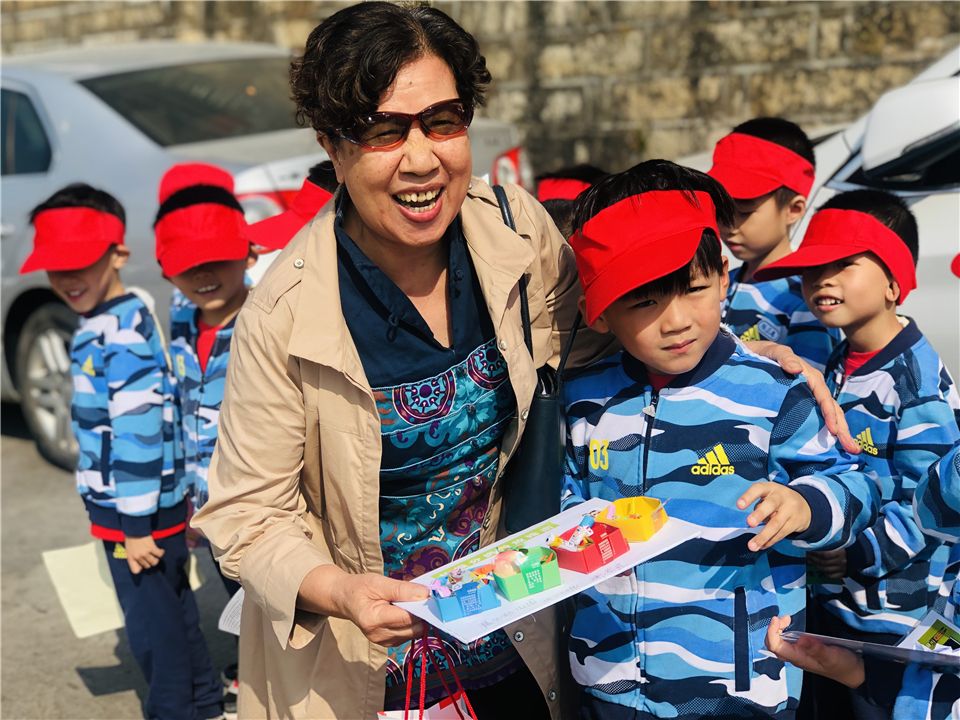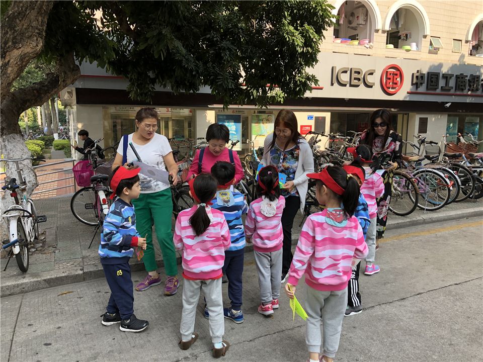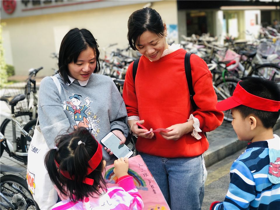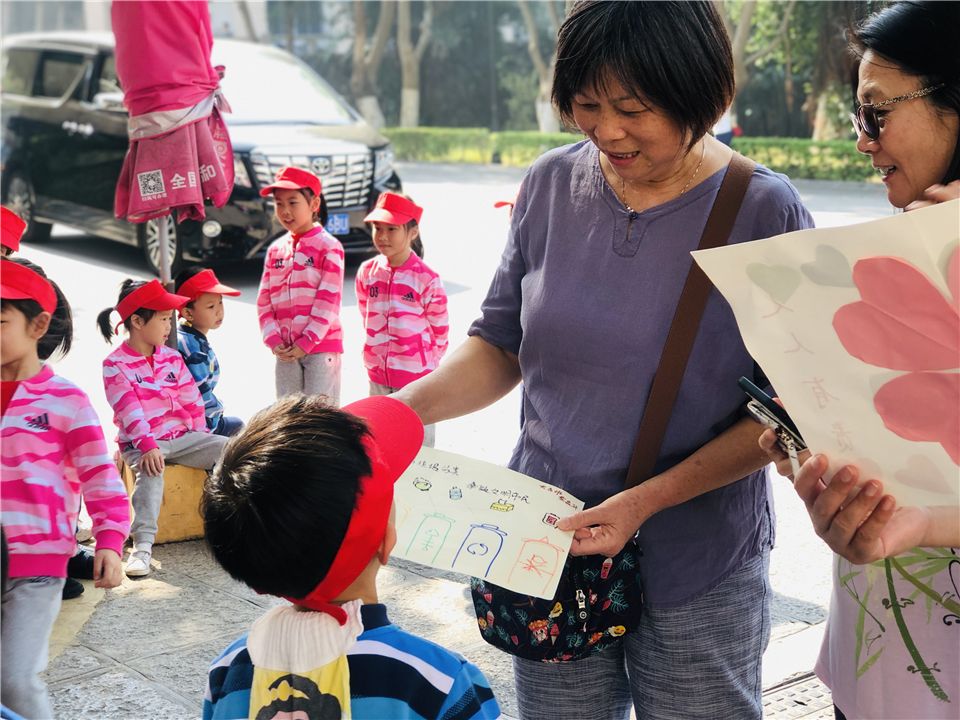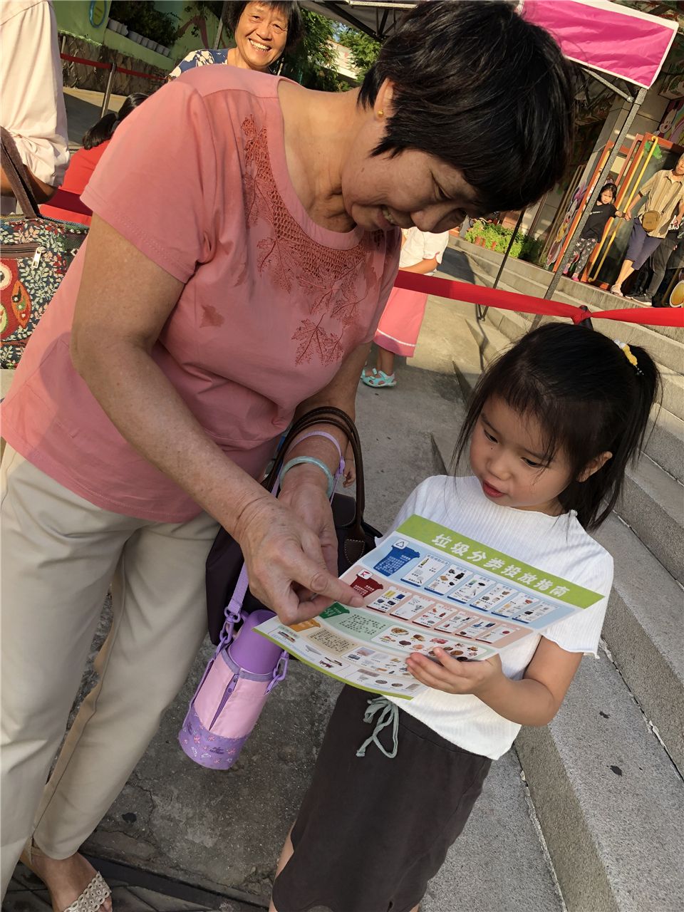 离园活动时,在幼儿园门口我们还向爸爸妈妈爷爷奶奶一起分享了我们的宣传单,向他们进行了宣传“垃圾分类”的小互动。
