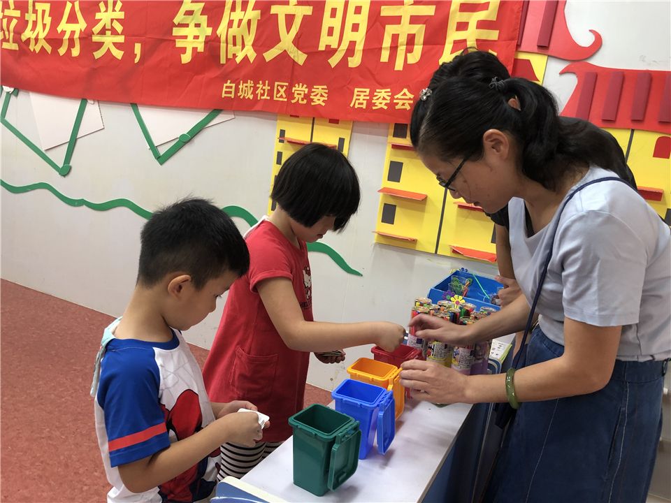 活动中,叔叔阿姨生动地给小朋友讲解垃圾分类的好处,怎么进行垃圾分类和投放,用垃圾分类箱告诉小朋友们如何对垃圾进行分类。