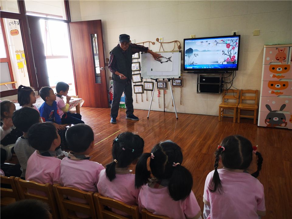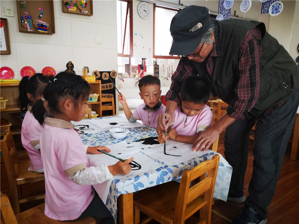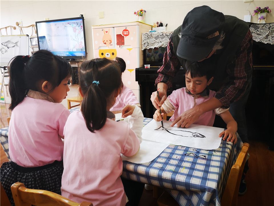 看,毕芃爷爷正耐心地给小朋友们讲解水墨画的技巧。开始作画啦!孩子们迫不及待地拿起了细长的竹毛笔,蘸上飘着幽香的墨汁,在毕芃爷爷的细心指导下有模有样的画起了水墨画。