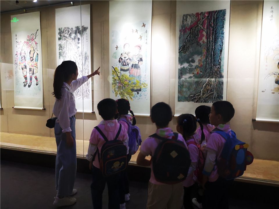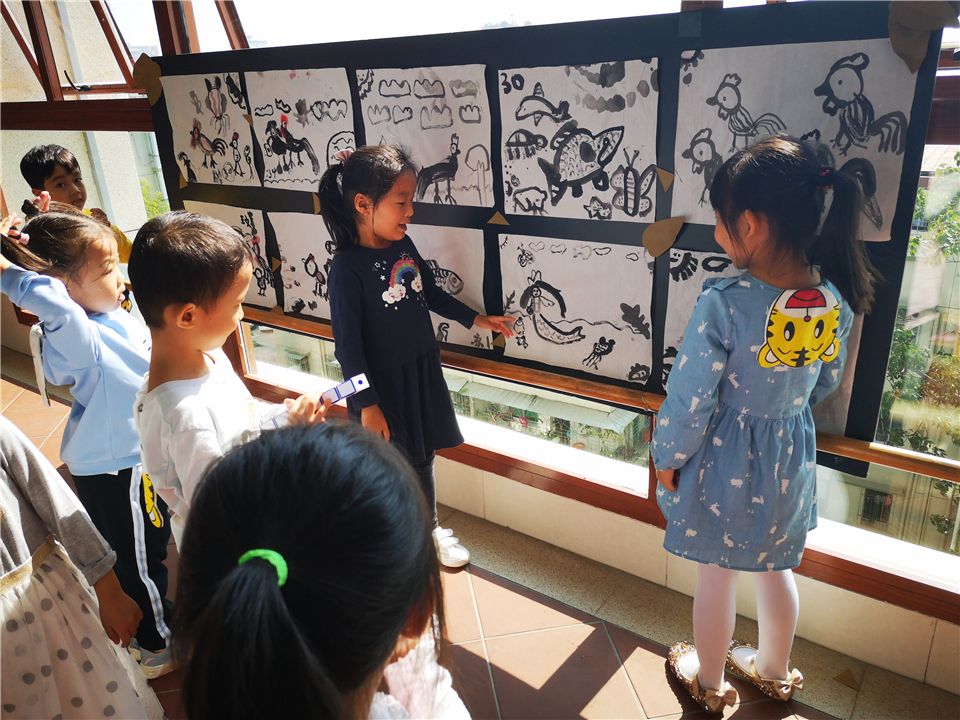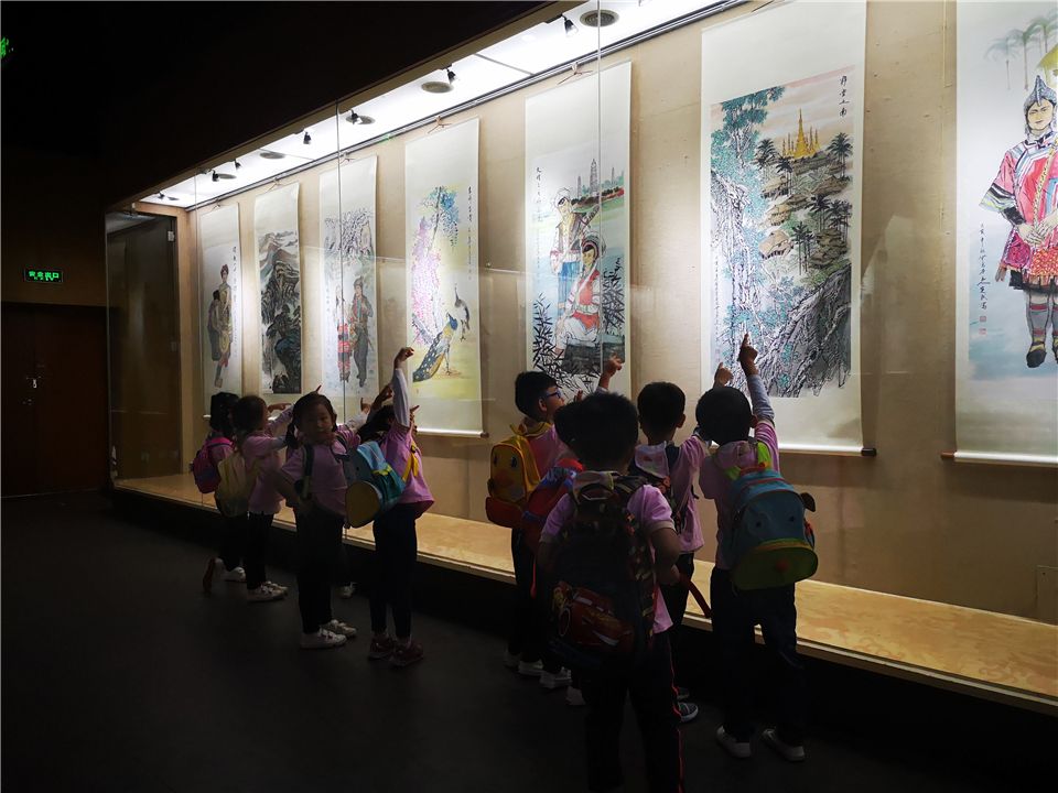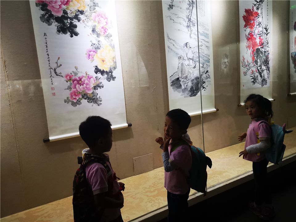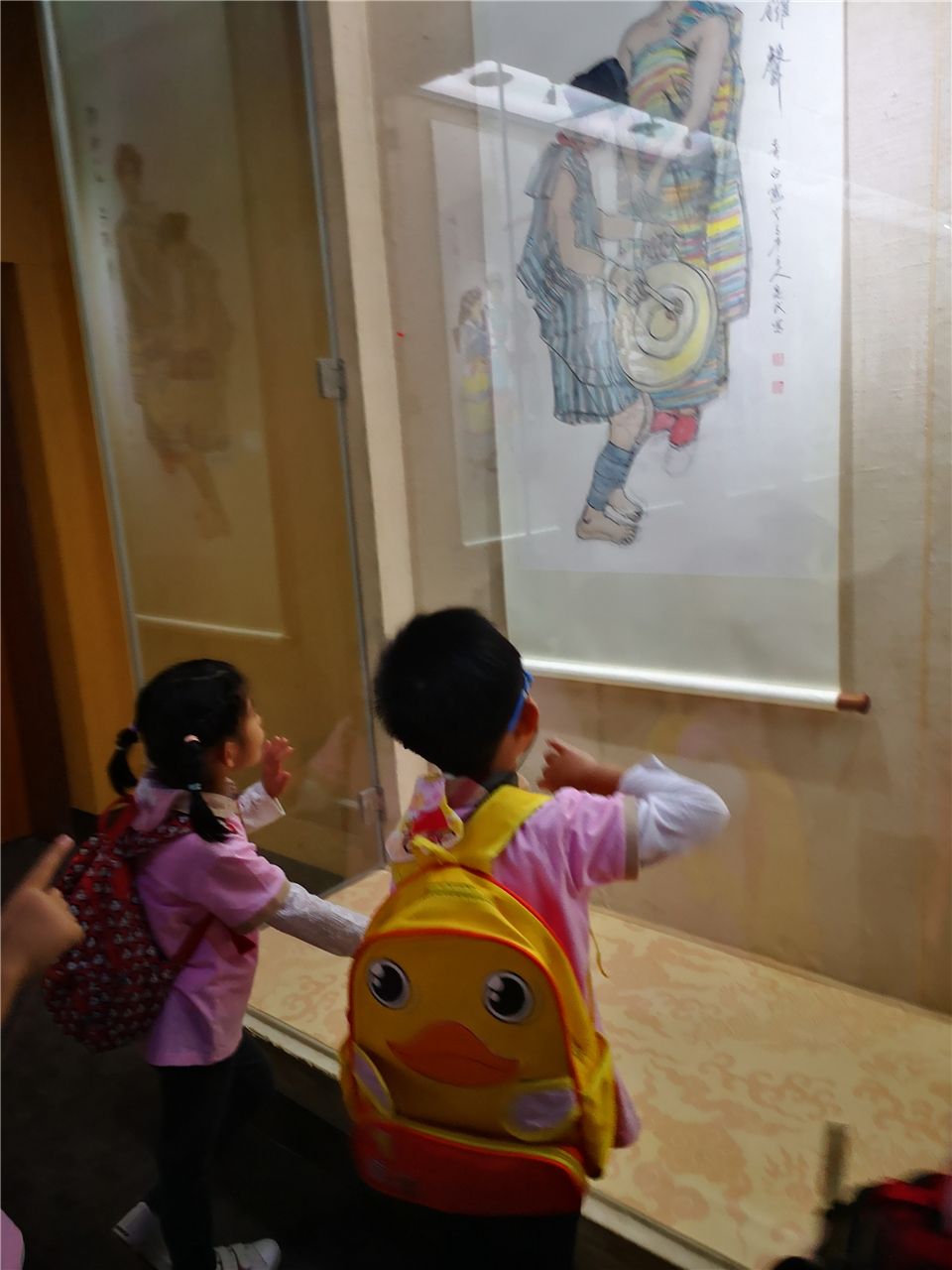 沐浴着温暖的阳光、唱着欢快的歌曲,大六班的孩子们开心地来到了文化艺术中心。走近书画展区时,几个孩子像发现新大陆似地说:老师,快看,这幅图上牡丹花。其它孩子听见了,兴奋极了!围着展示柜叽叽喳喳问题不断涌了出来:“这是什么画呢?”;“这种画画的纸张好像和我们平时绘画的不一样呀”孩子们七嘴八舌的议论着,还高高举起小手回答问题。