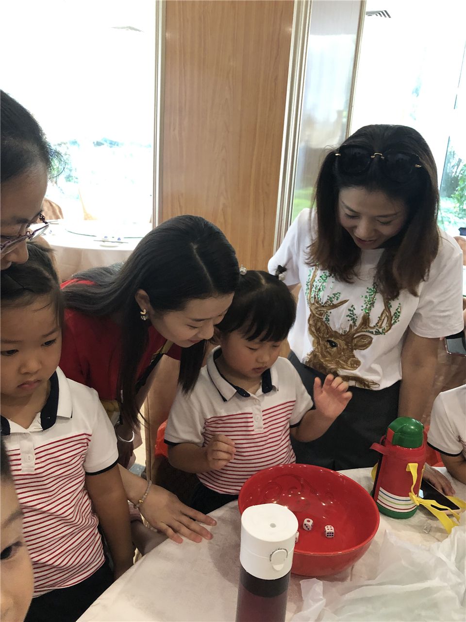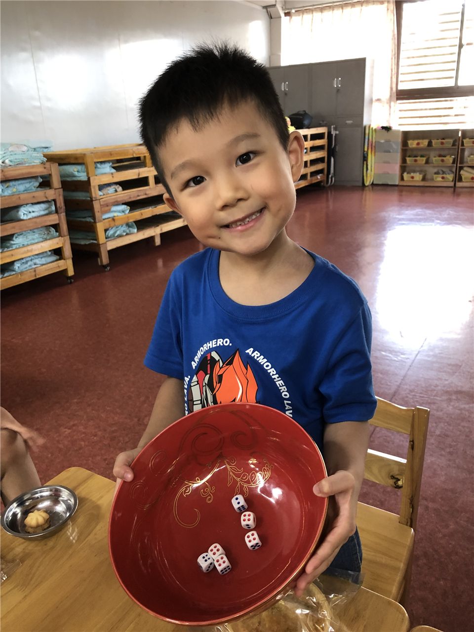 “锵锵锵 。。。锵锵锵。。。”随着一阵阵悦耳的骰子声,我们终于迎来了一年一度的中秋佳节。“老师,我博到三红了”“老师,我博到四进了”“老师,我博到对堂”,“老师,我博到状元啦。。。。。。”,为了让小朋友们更好地了解中秋佳节的来历和习俗,感受中秋节团圆的热闹气氛,我们大三班的小朋友开展了庆中秋系列活动,小朋友们与老师,与同伴,与爸爸妈妈们共同庆祝中秋节,感受着过节的快乐呦!跟随我们的镜头一起来看看吧!