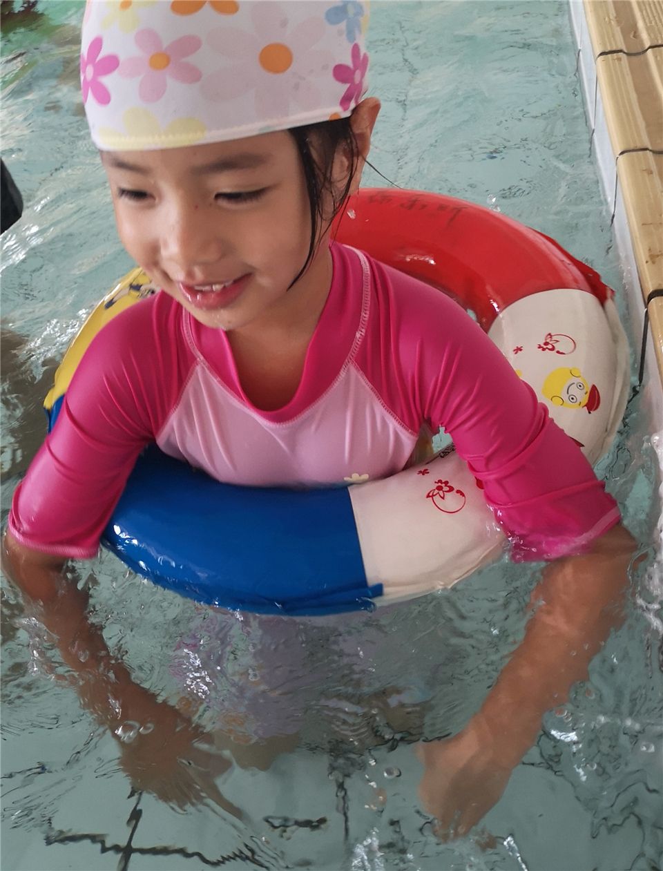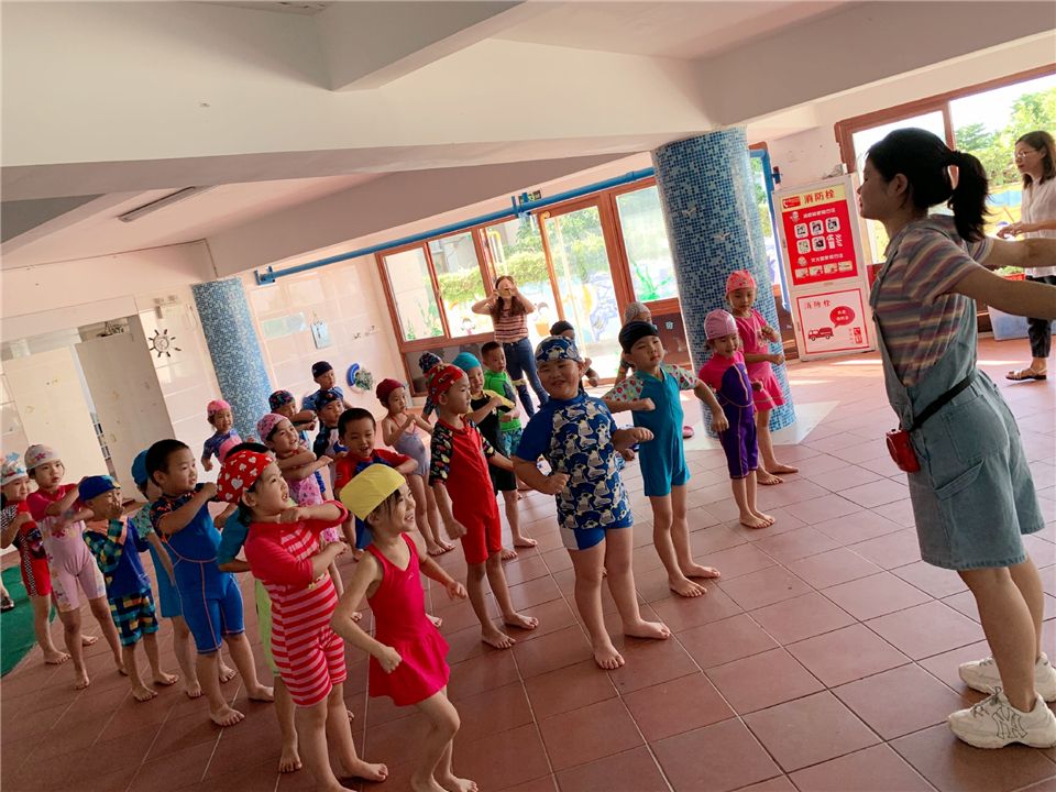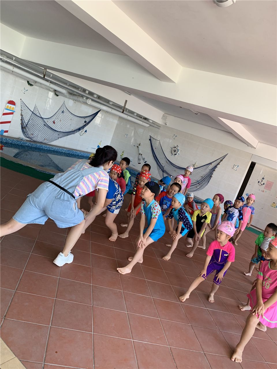 游泳之前的热身运动可以说是必不可少啦,“左三圈,右三圈,脖子扭扭屁股扭扭~”,光是准备运动就已经让宝贝们按捺不住想下水的激动心情了。