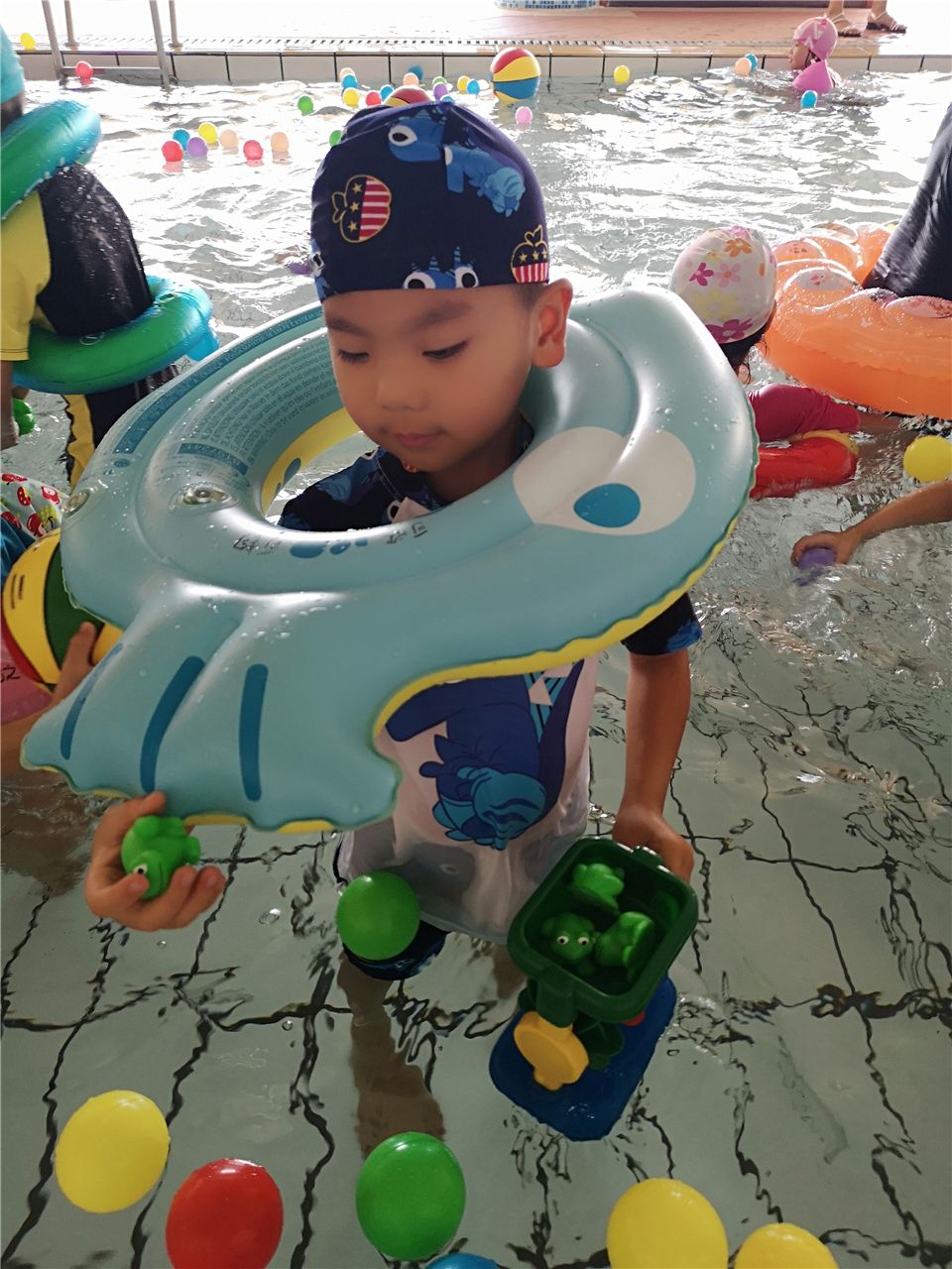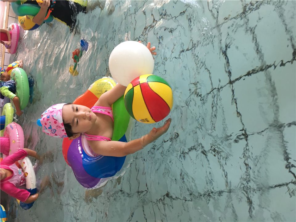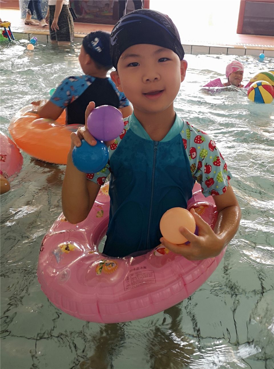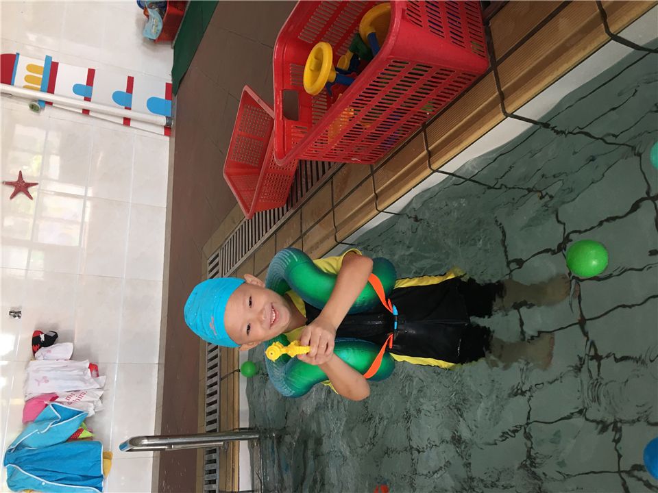 游泳池的一角是快乐的水上玩具总动员。铛铛拿着水枪的样子可真是神气,柳柳可以一下子捧着两个皮球前进。还有的在水下捞出了许多绿色的“小动物”。宝贝们脸上灿烂的笑脸是对今天戏水活动最好的评价。