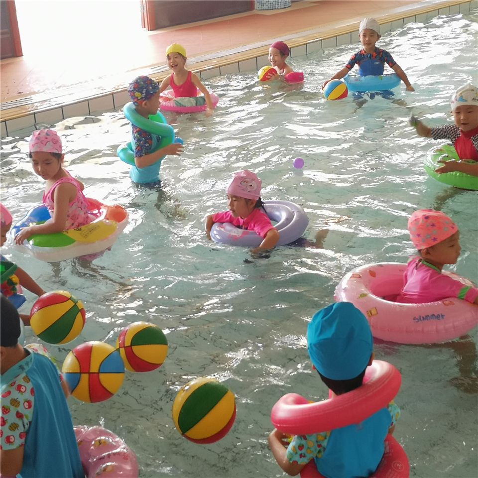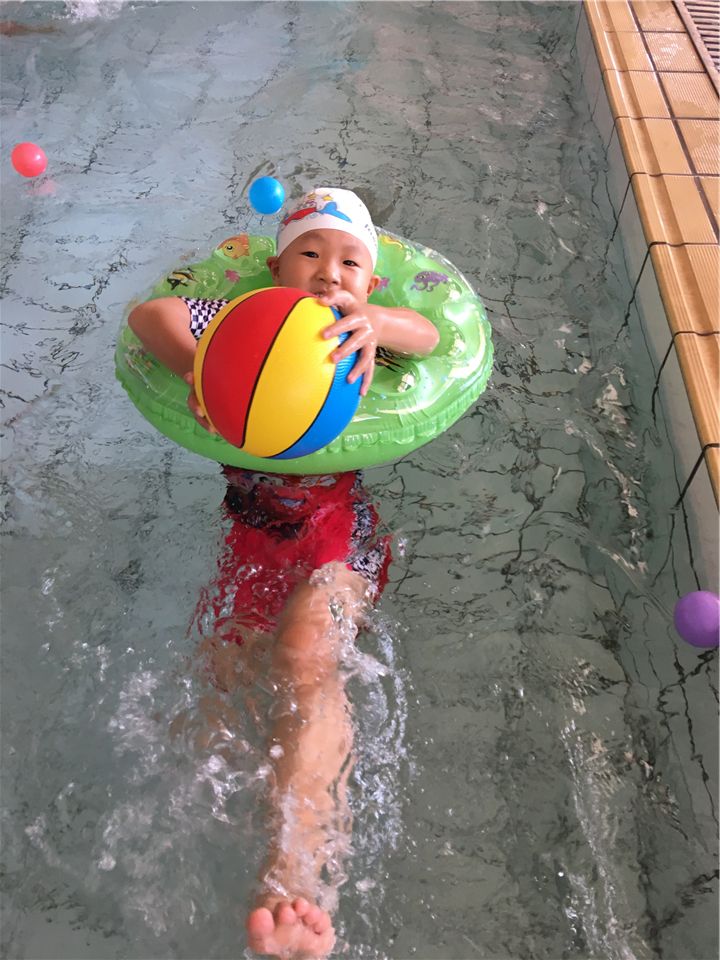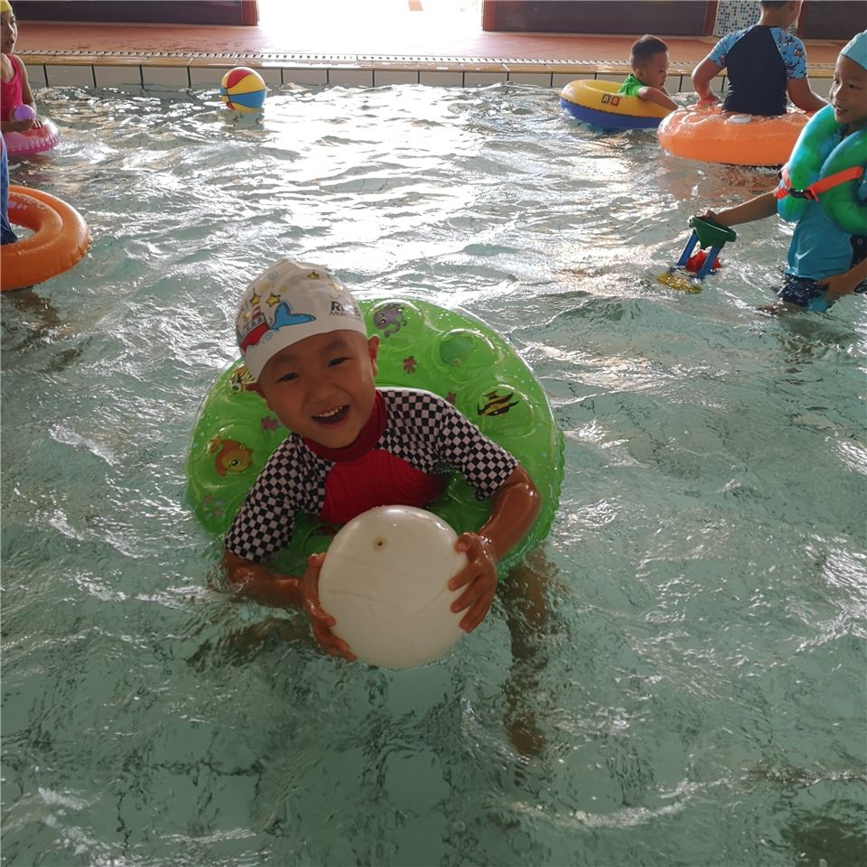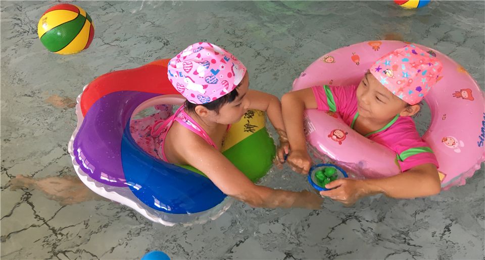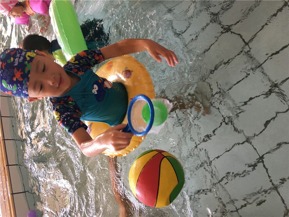 游泳池的一角是快乐的水上玩具总动员。铛铛拿着水枪的样子可真是神气,柳柳可以一下子捧着两个皮球前进。还有的在水下捞出了许多绿色的“小动物”。宝贝们脸上灿烂的笑脸是对今天戏水活动最好的评价。