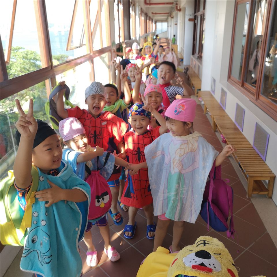 久违的戏水时光让孩子们的脸上洋溢着幸福的微笑。换好泳衣和拖鞋,戴上泳帽,最后披上我们的“战袍”浴巾。大四班的小朋友手拉着手一起向游泳池前进。