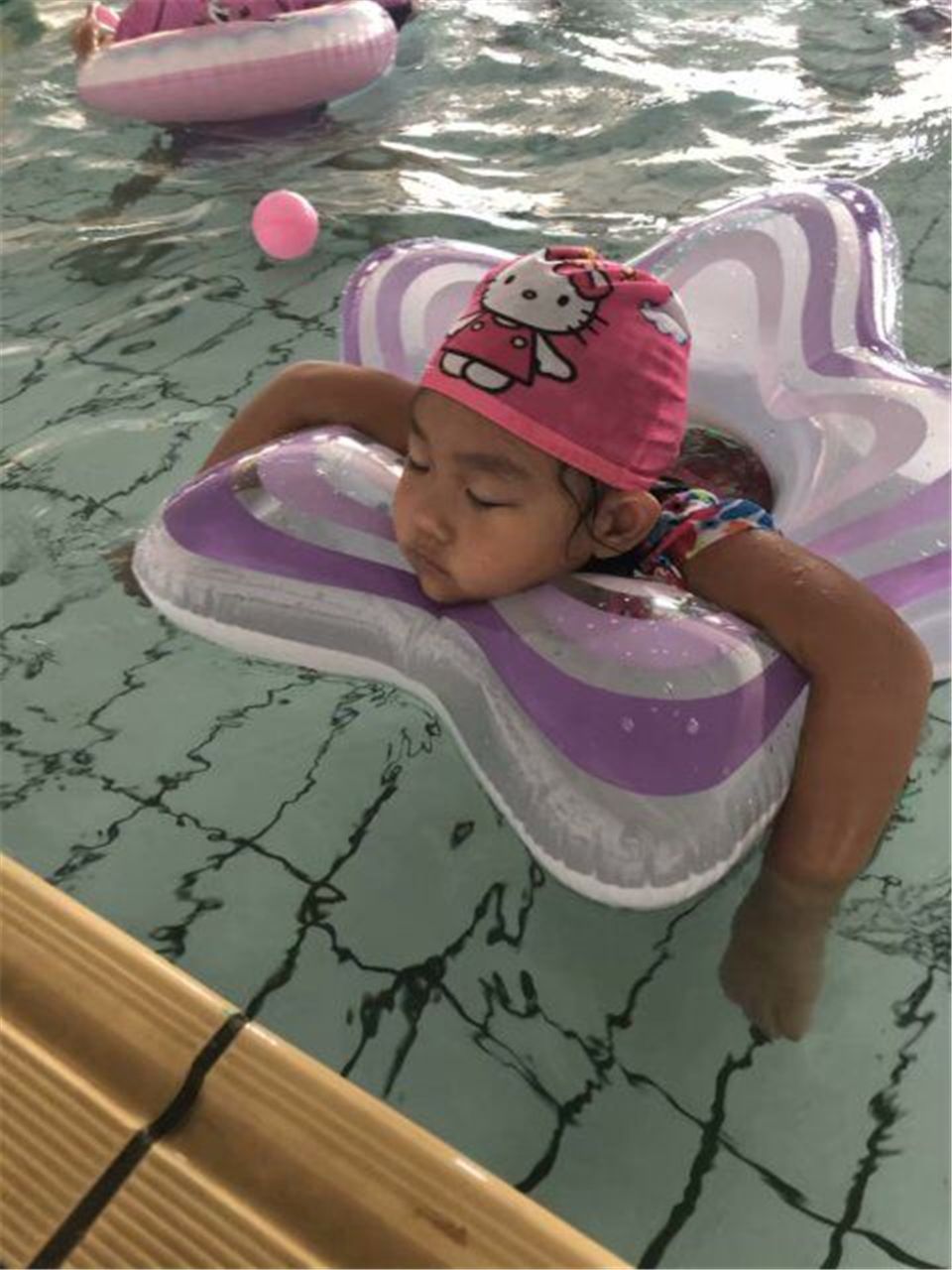 有点累了,趴在泳圈上,假装在睡觉,就像睡在一张柔软的床上。