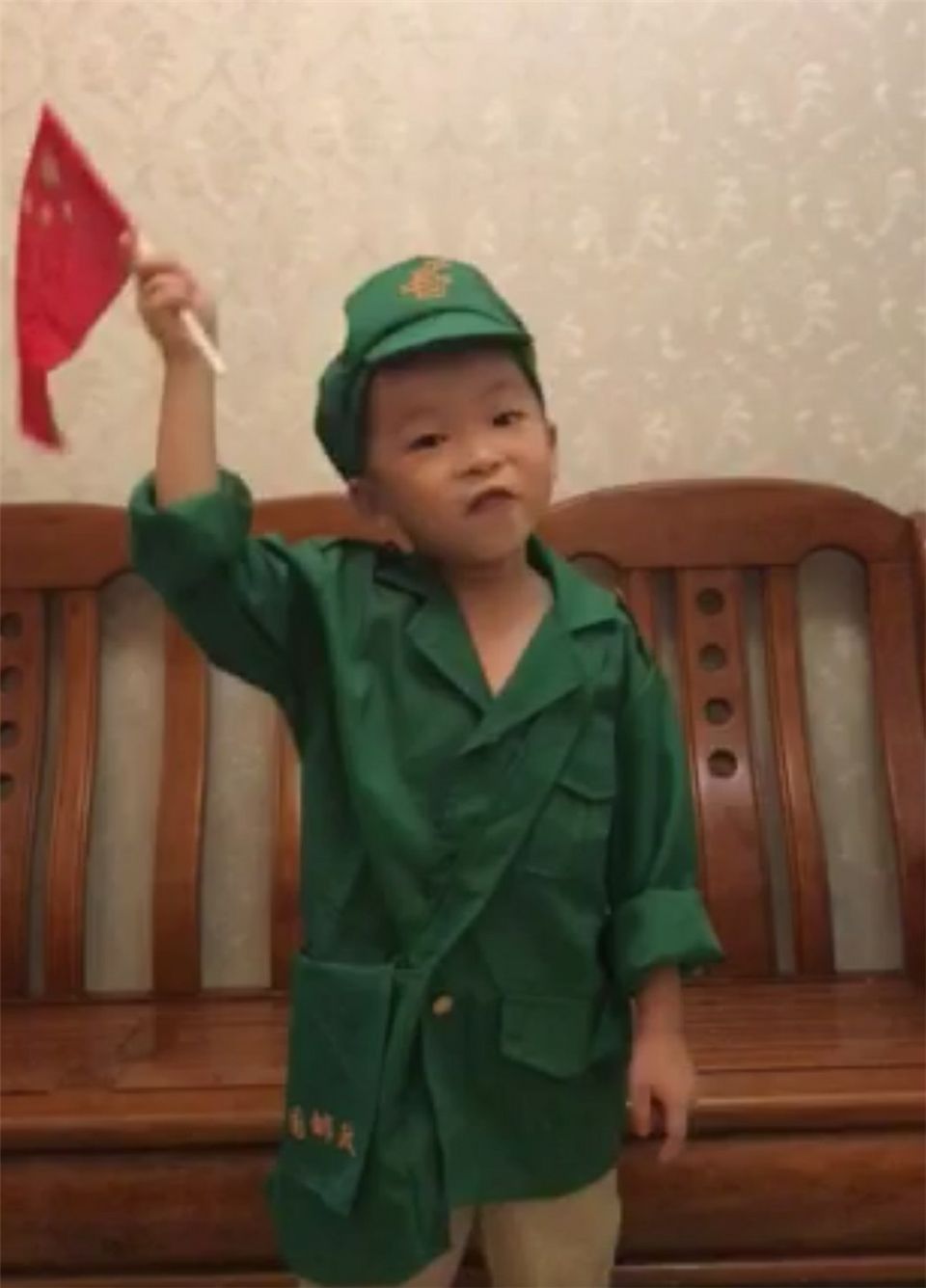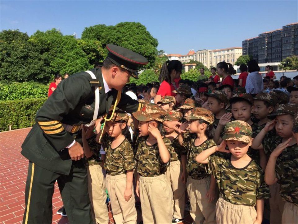 “终于迎来了国防生哥哥的到来,立正、敬礼、齐步走,国防生哥哥的眼神、每个动作都那么帅气,让我们也一起来学学吧!”