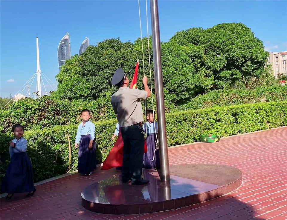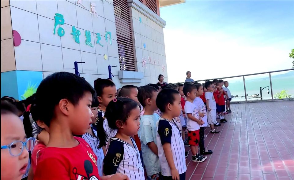 “升旗仪式现在开始,请全体小朋友行注目礼!”国旗冉冉升起。