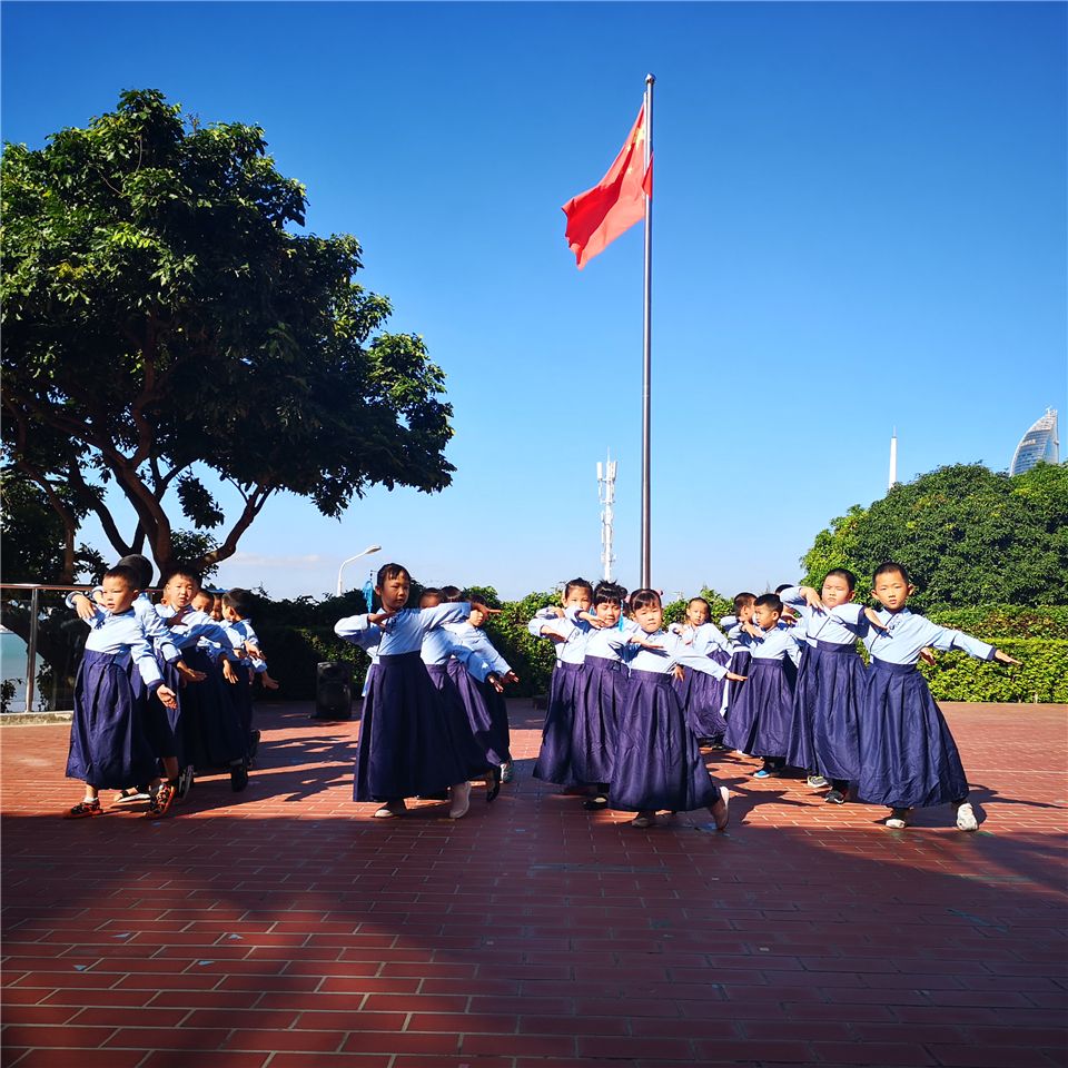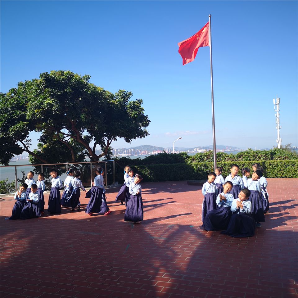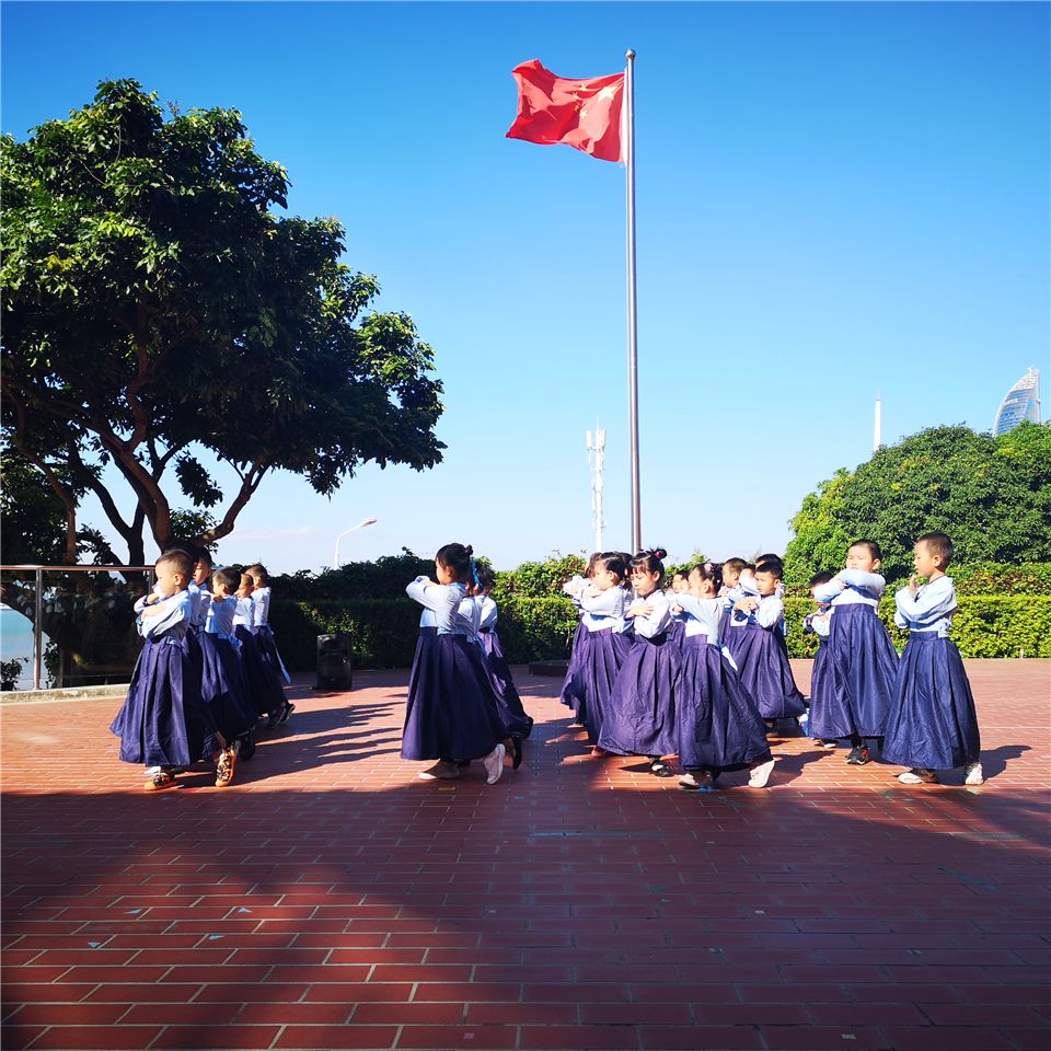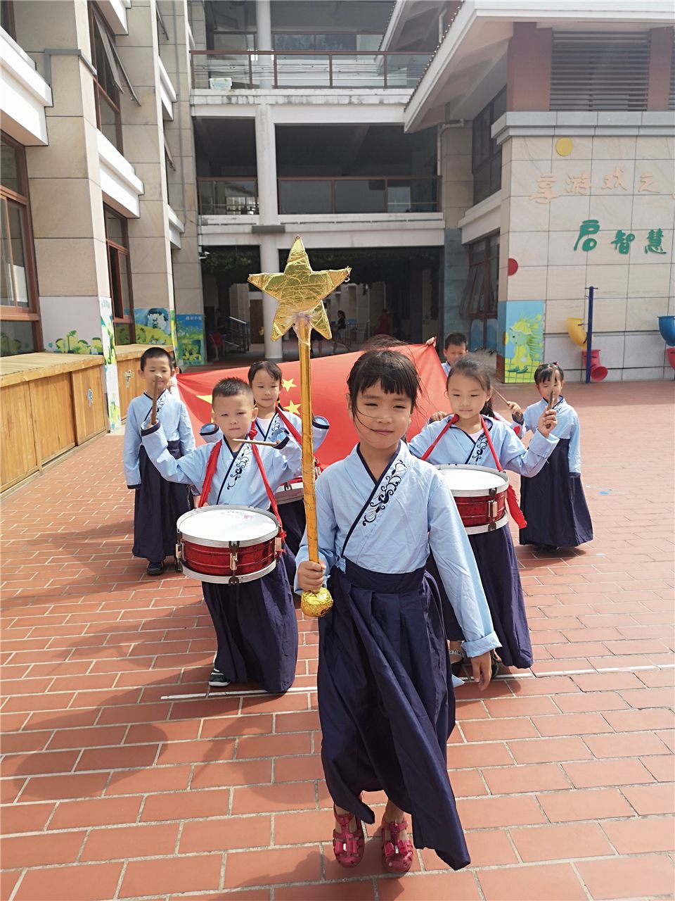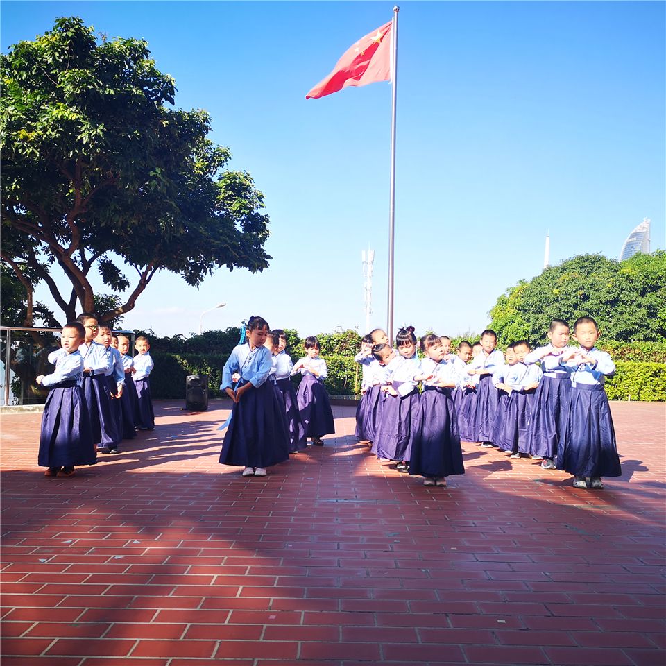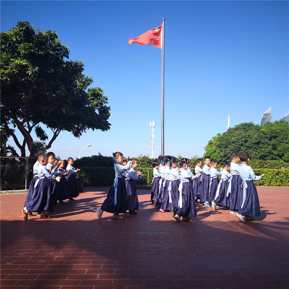 国旗下的小主持人早就已经迫不及待了,熟练的主持着升旗仪式的开场,没有胆怯,声音洪亮清澈,这还是我们幼儿园小朋友第一次穿汉服主持升旗仪式,想想都有点小激动呢。