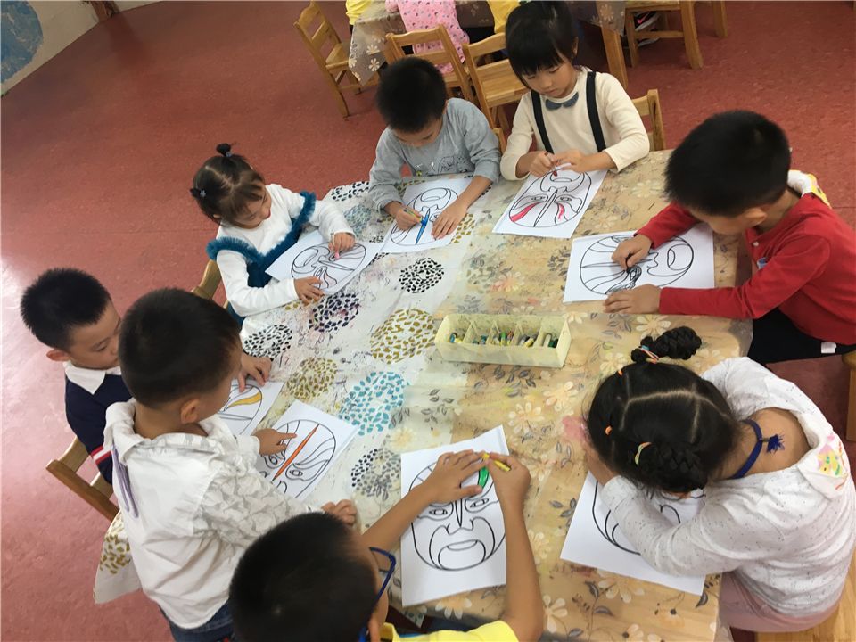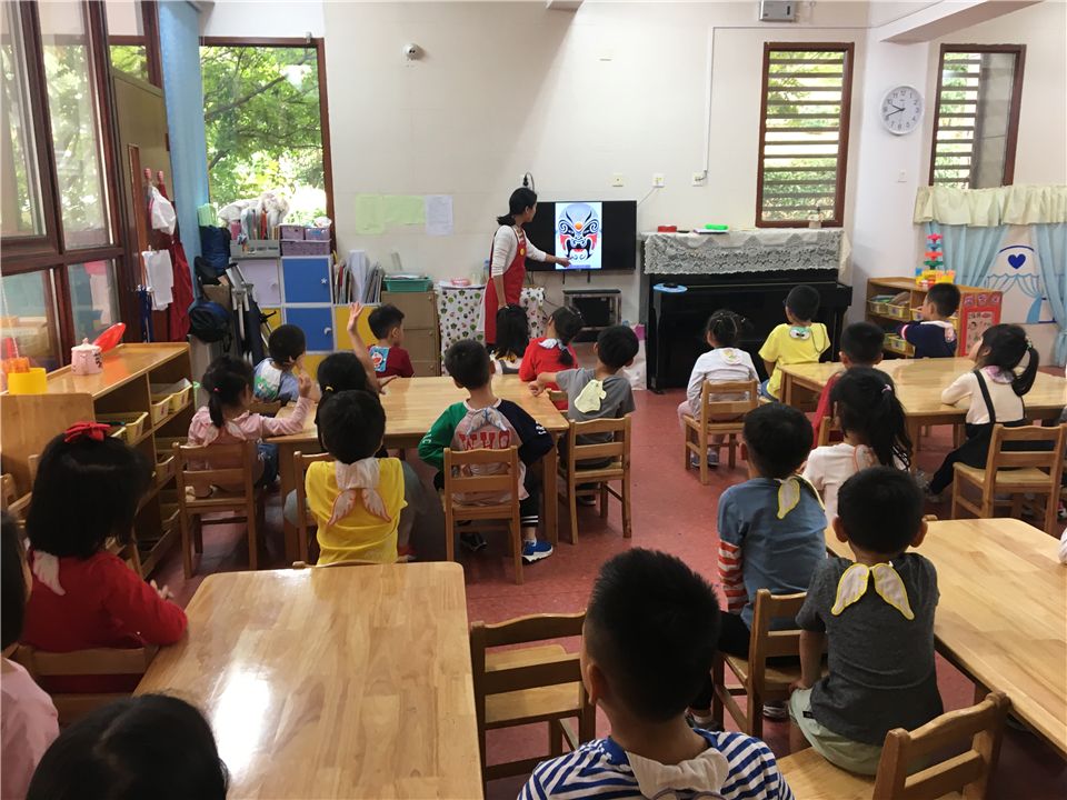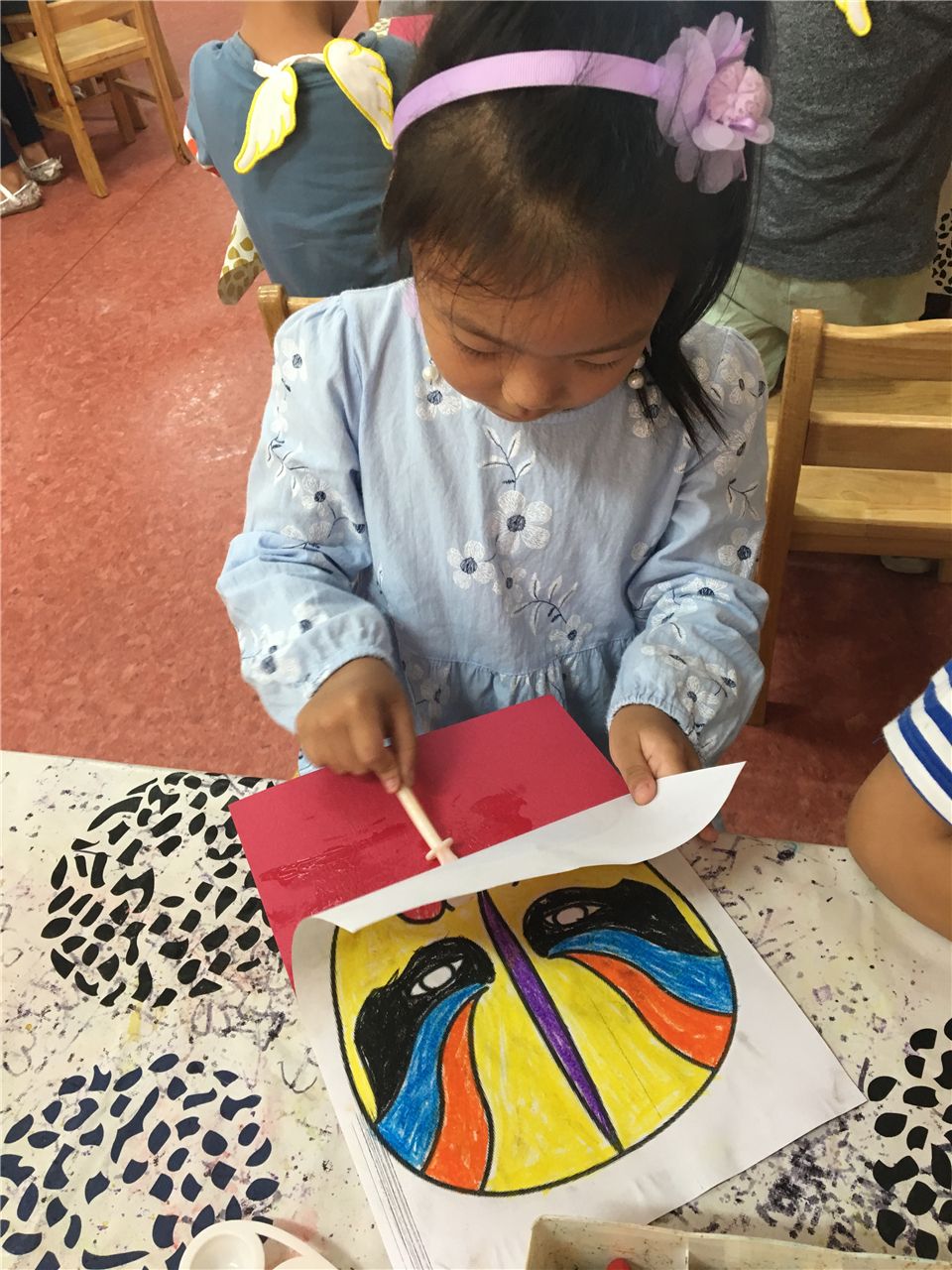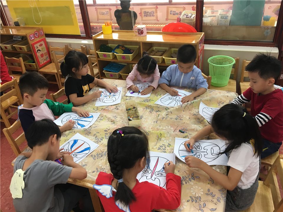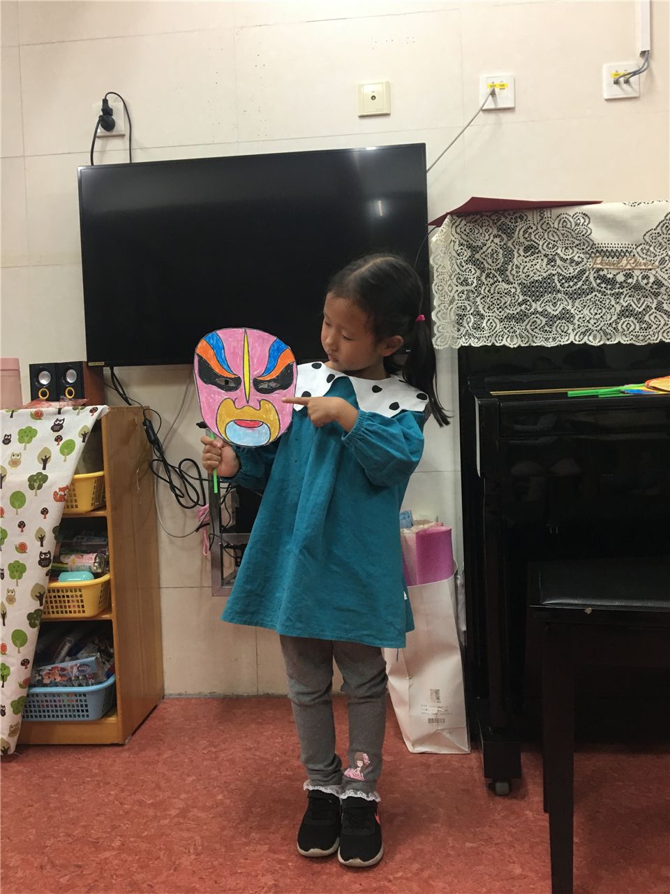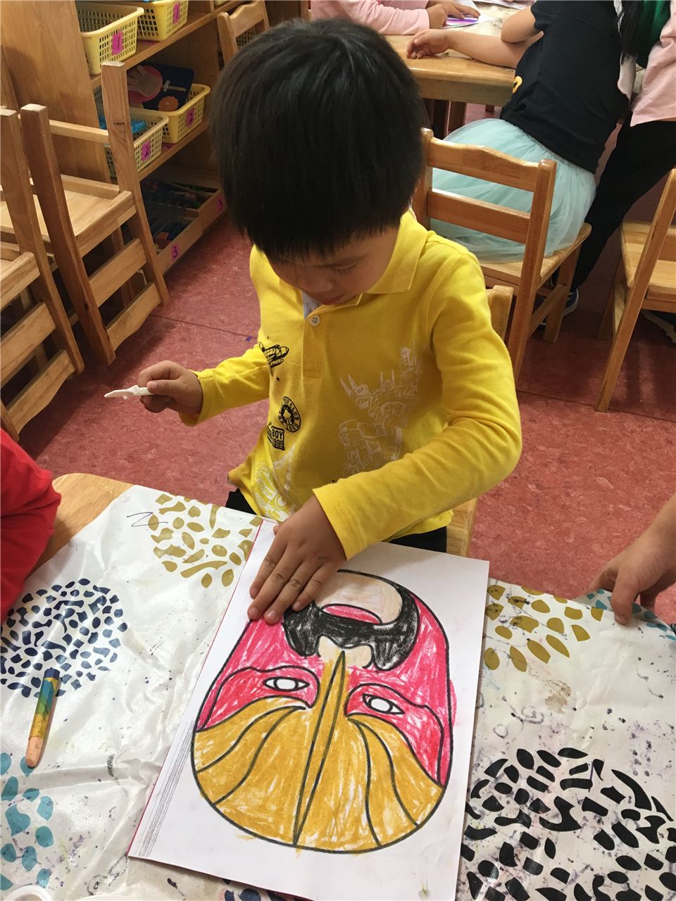 陈老师向我们介绍了京剧脸谱的起源、类别、特点以及各颜色代表的人物个性。我们聚精会神地听着,积极举起小手发表我们的新发现。