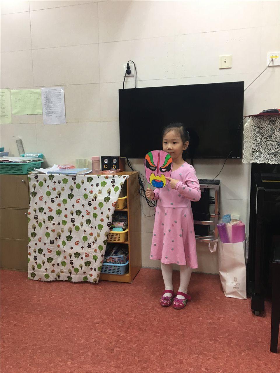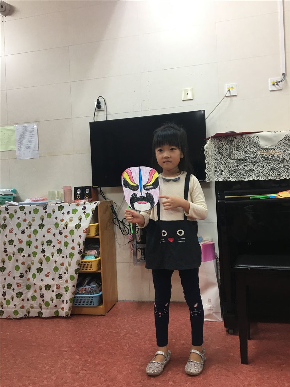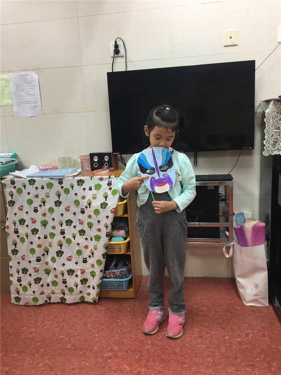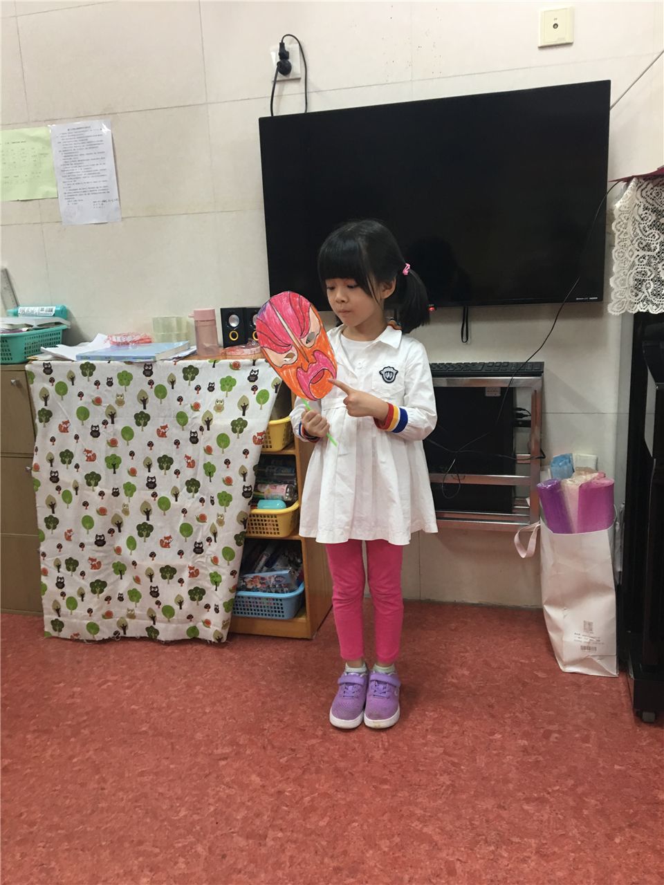 把脸谱的眼睛去掉,再黏上塑料棒,我们的作品就完成啦!接着,我们轮流上台落落大方地向小伙伴们介绍自己的作品。