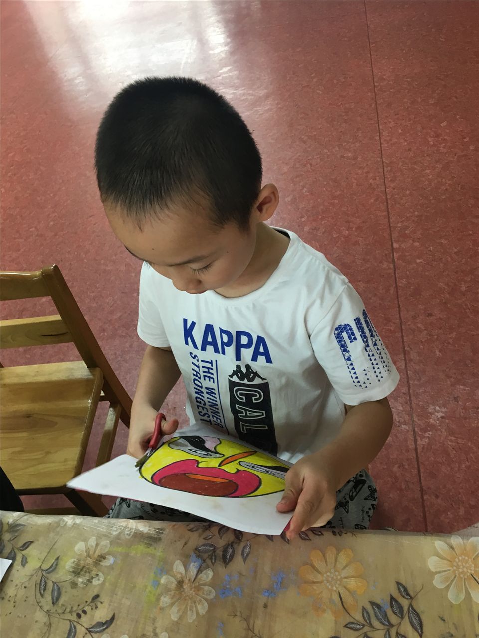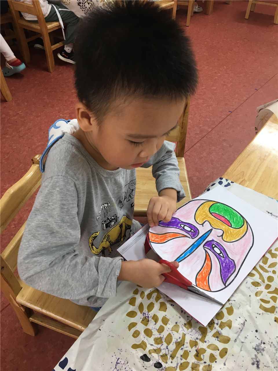 接下来,我们要把脸谱剪下来咯,上了大班后我们的小手更加灵巧了,很快就把脸谱剪下来了。