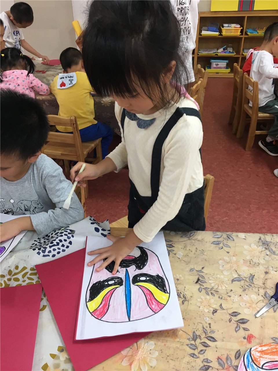 上完颜色后,我们细心地在红色卡纸上涂上胶水,然后把脸谱贴上去。