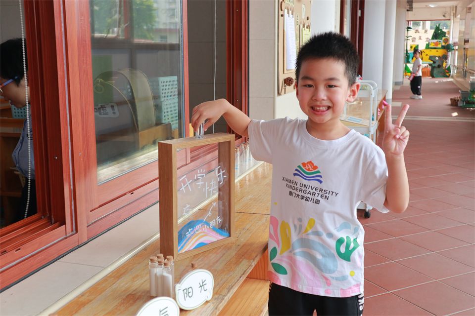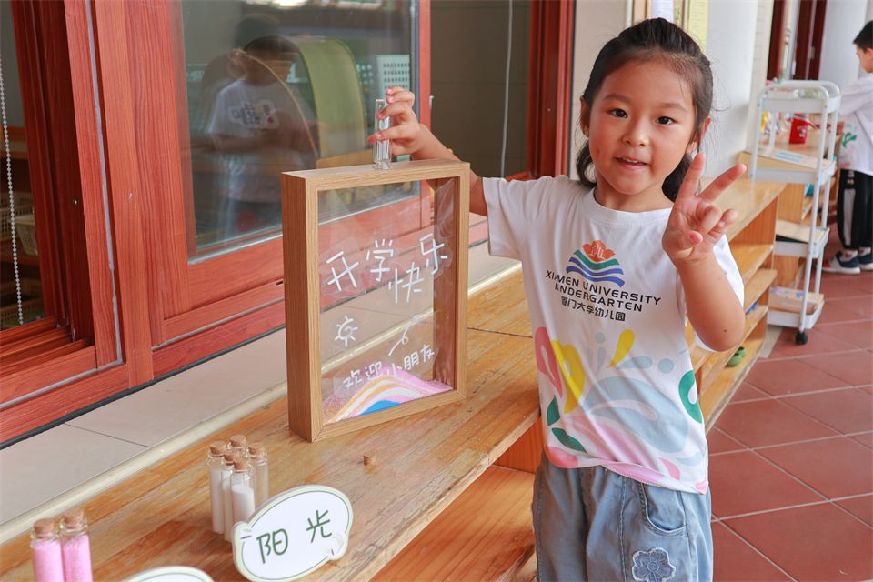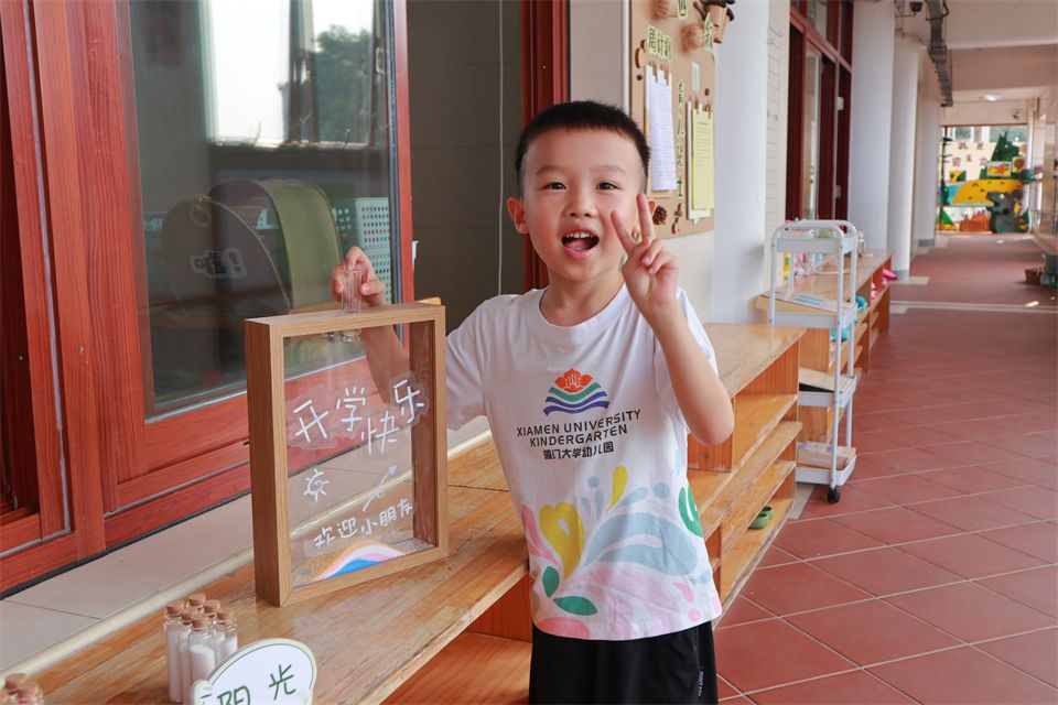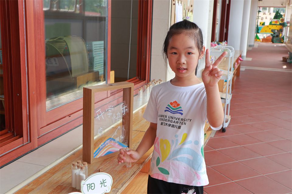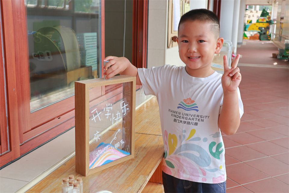 装着五彩细沙的小瓶子成了全场焦点,彩色细沙缓缓流淌,萌娃们睁着好奇的眼睛盯着沙漏,看不同颜色的沙粒慢慢交融,小脸上满是对新学期的期待。