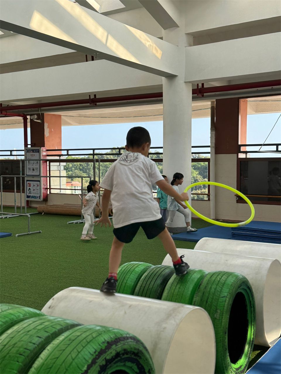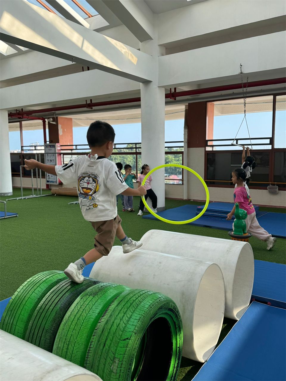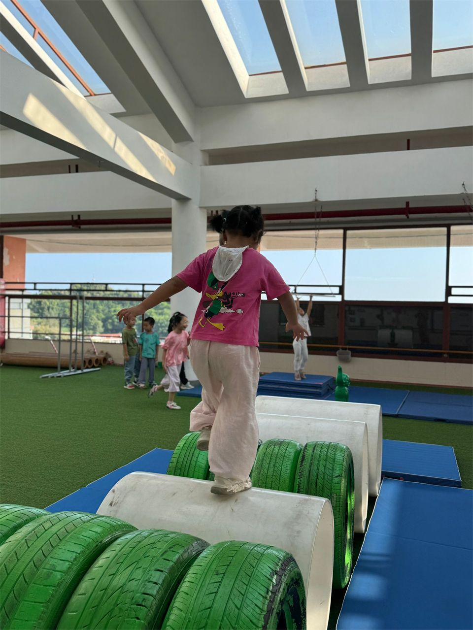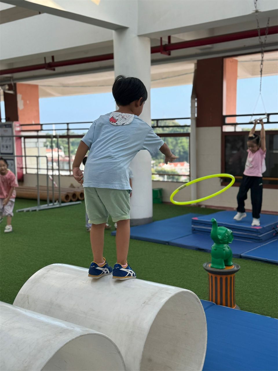 瞧!滚筒区的萌娃们化身“小小运动健将”,只见他们小心翼翼地站在滚筒上,脚步跟着滚筒节奏慢慢调整,从一开始的跌跌撞撞到后来能稳稳控制方向,笑声随着滚筒滚动的轨迹洒满天台!