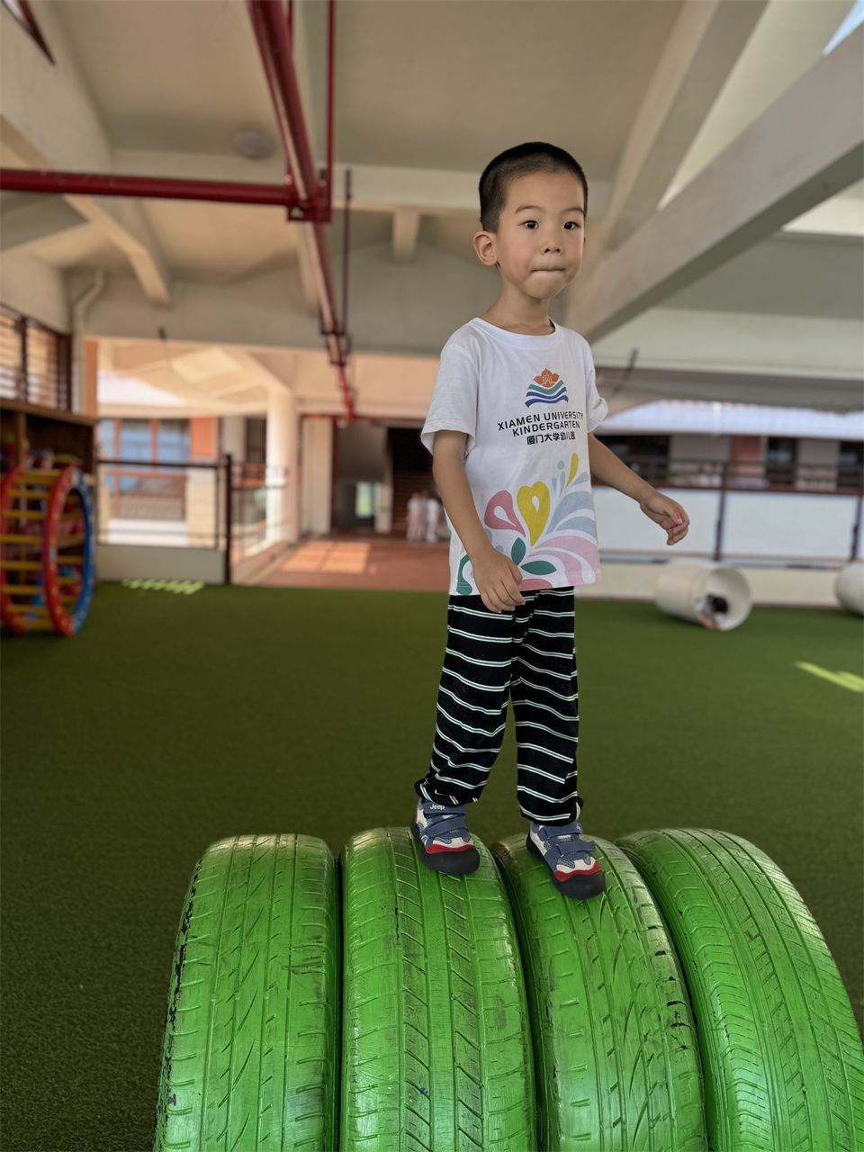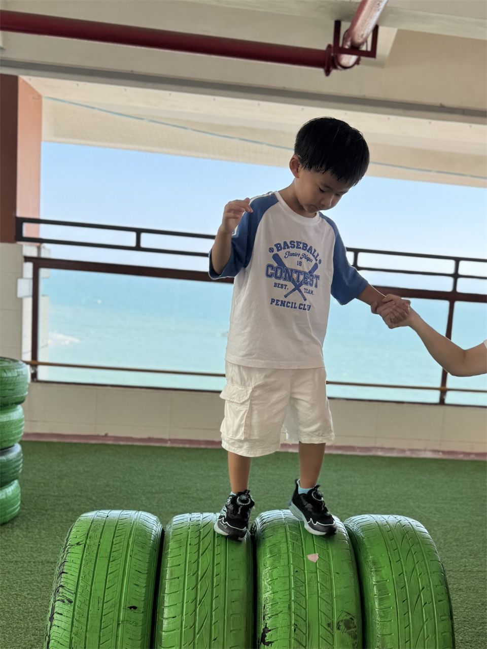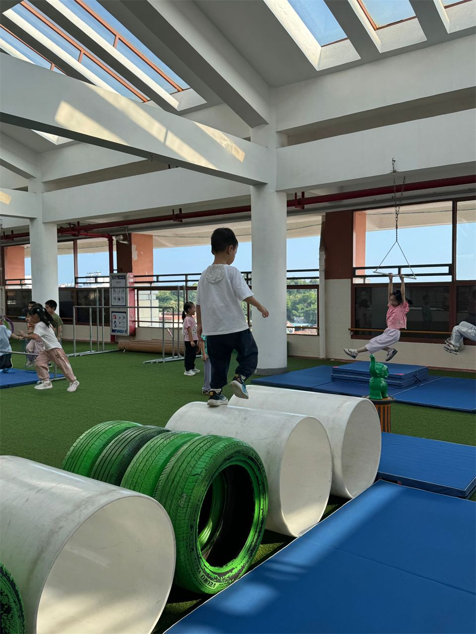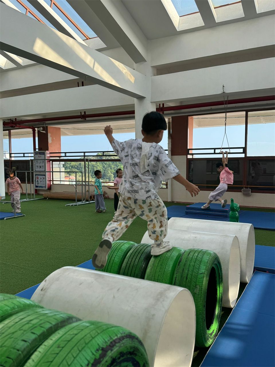 瞧!滚筒区的萌娃们化身“小小运动健将”,只见他们小心翼翼地站在滚筒上,脚步跟着滚筒节奏慢慢调整,从一开始的跌跌撞撞到后来能稳稳控制方向,笑声随着滚筒滚动的轨迹洒满天台!