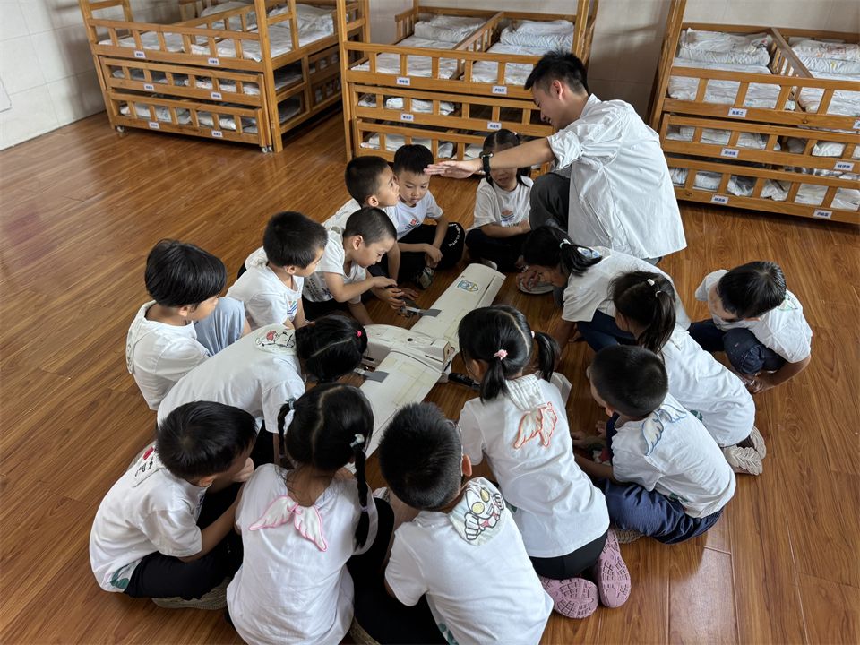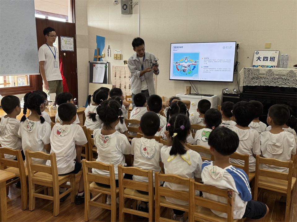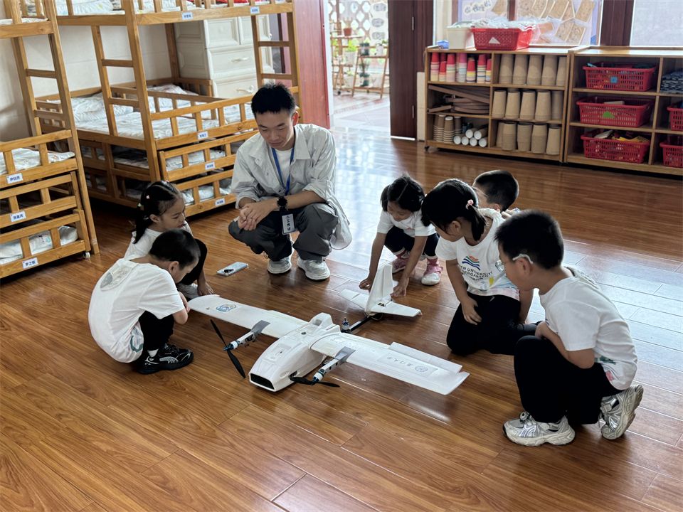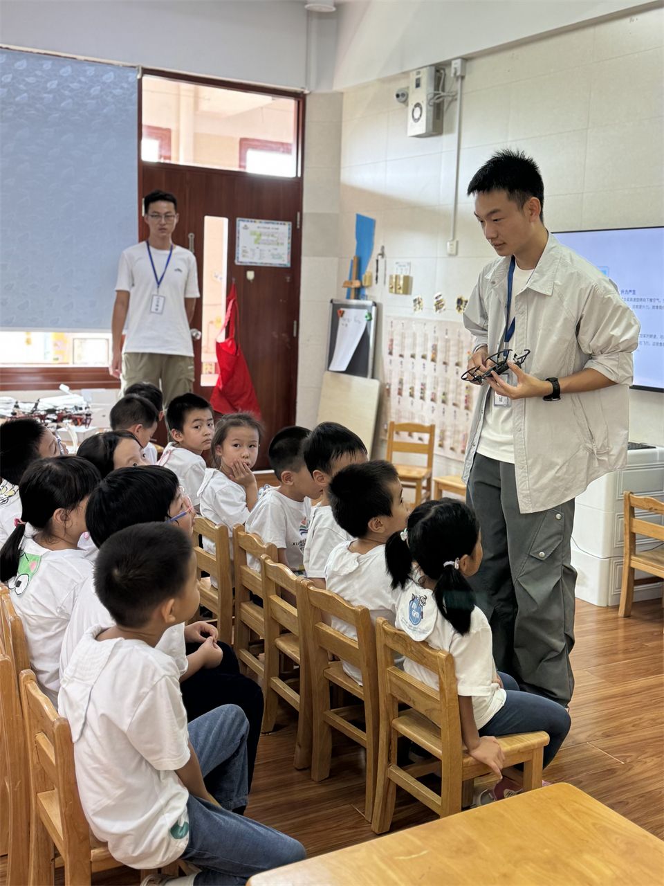 快看!大四班还迎来了特别的“老师”——大学生助教哥哥们。他们带来了神奇的无人机,用萌娃们能听懂的语言讲解关于无人机的小知识,比如“它有四个螺旋桨,就像小鸟的翅膀一样能飞起来”。