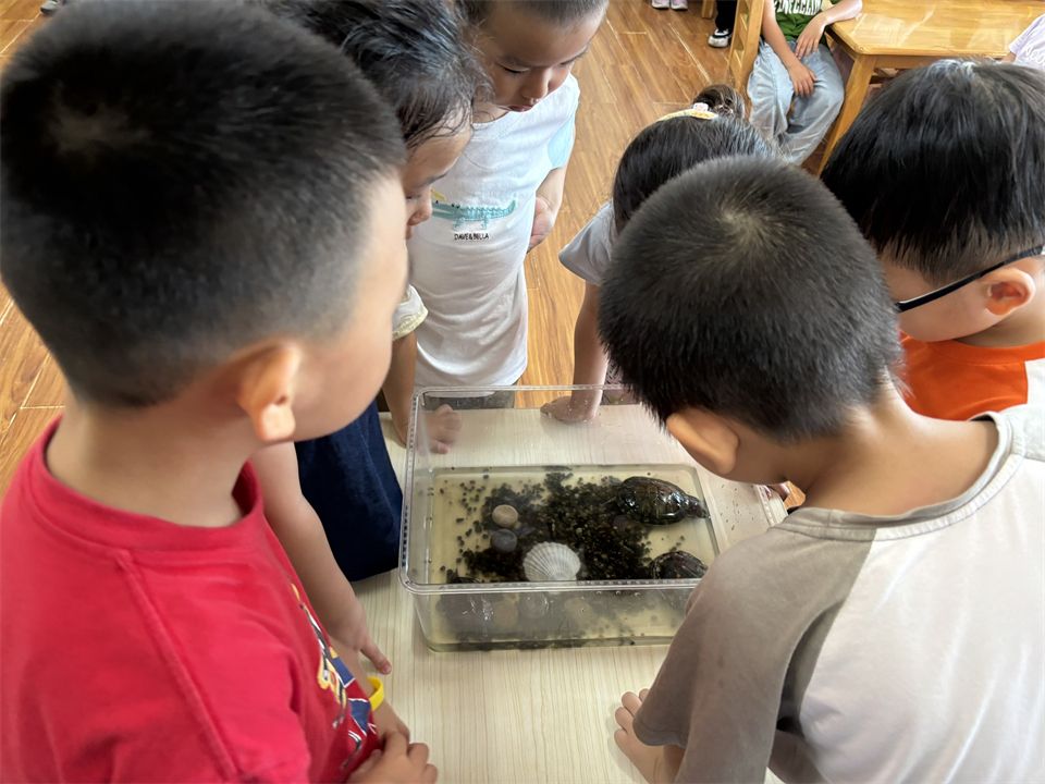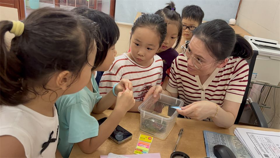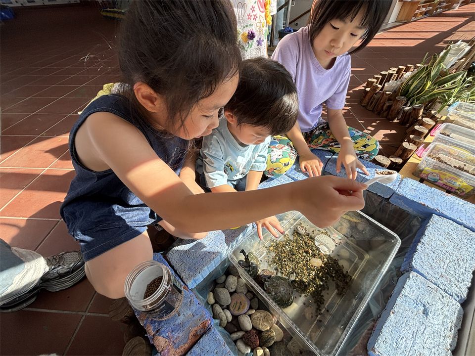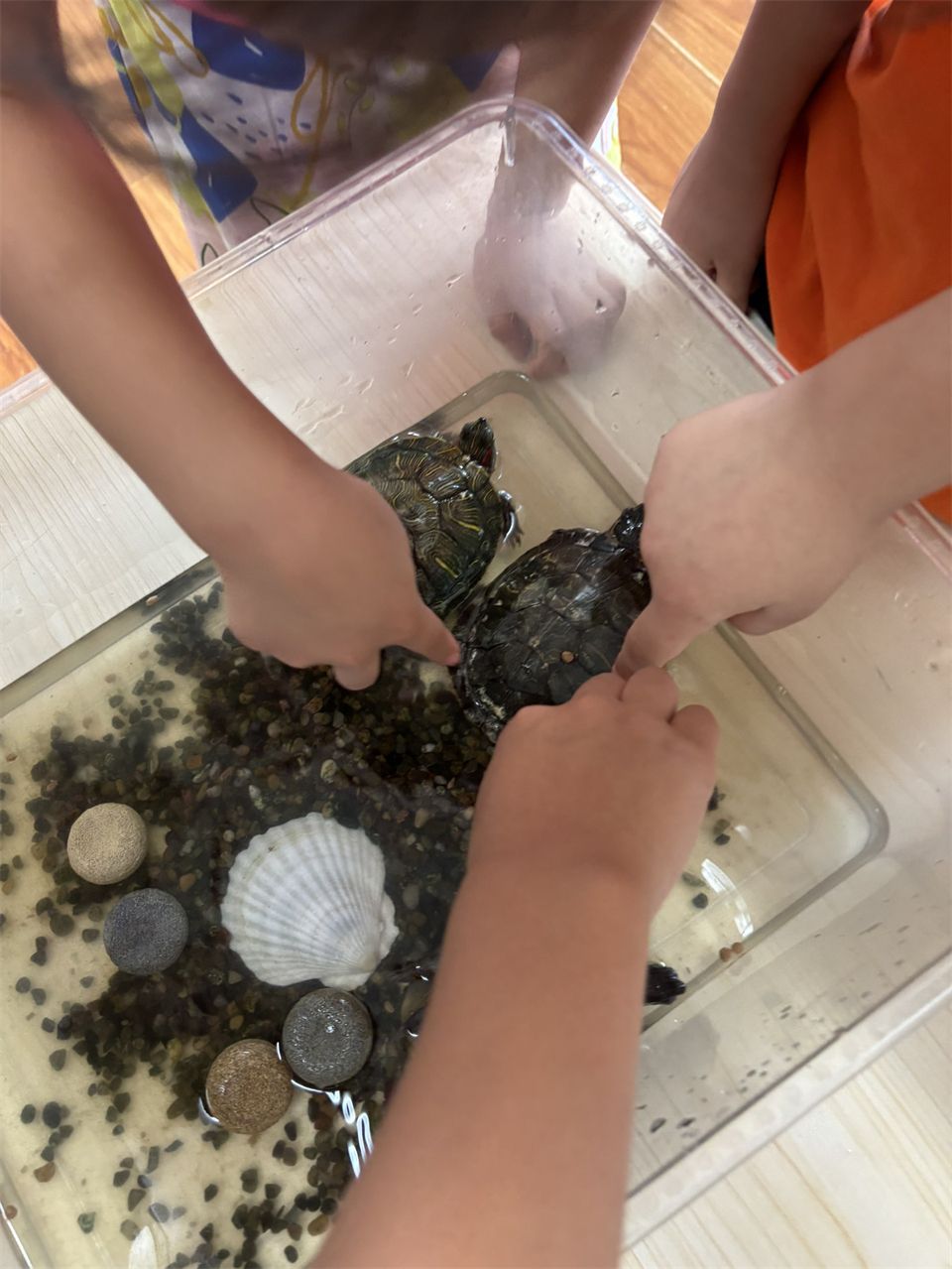 可喜悦过后,孩子们发现了新的问题:小乌龟的壳上有一条大大的裂口,还带着血渍。大家瞬间紧张起来,小心翼翼地捧着小乌龟,一起送到园医室。园医一边温柔地给小乌龟消毒、冲洗伤口,一边和孩子们讲解护理注意事项:“要每天观察它的伤口,给它喂新鲜的食物哦。”从那以后,孩子们每天都会轮流来看小乌龟,给它换水、喂食,轻轻观察伤口的变化。
