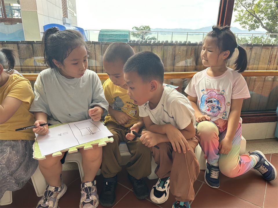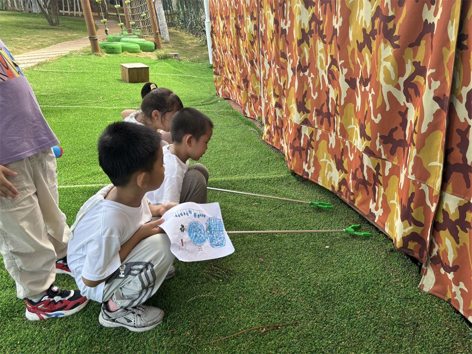 孩子们围坐在一起,你一言我一语地讨论:“乌龟喜欢躲在阴暗的地方,木箱子里肯定要找!”“它会不会爬去戏水池了?那里有水!”“小乌龟可能还会去淘气堡玩耍,因为那边有很多洞洞可以爬!”顺着这些想法,他们一笔一画地画出一张张“寻龟路线图”,还从家里带来了寻找工具:手电筒、放大镜、望远镜、长夹杆。于是,孩子们整装待发,寻龟小分队出发寻找吧!