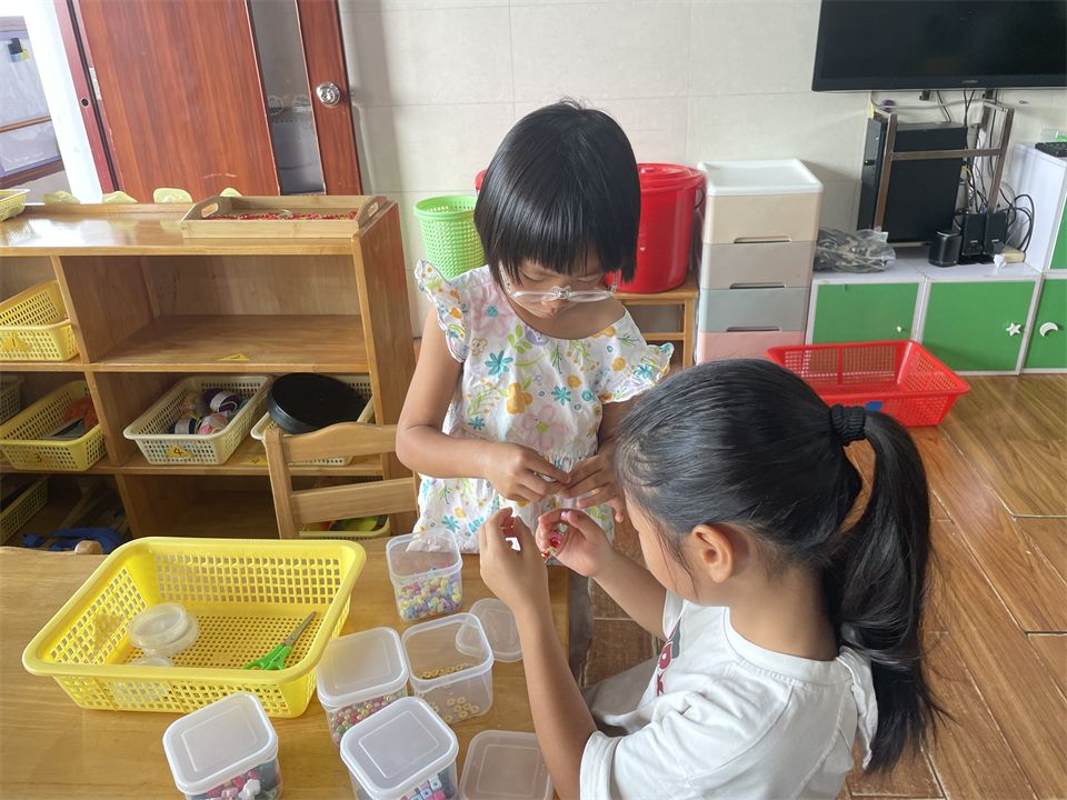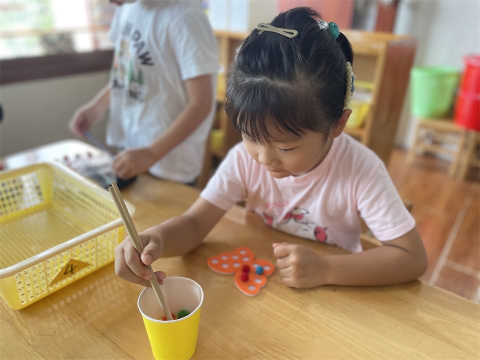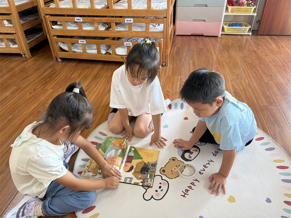 区域游戏,是孩子们奇思妙想、尽情绽放的地方;有的捧着图画书,跟着画面里的故事轻声念叨,沉浸在文字与图像的奇妙世界;有的对着彩色方块和数字卡片认真摆弄,互相讨论着搭配的方法;还有的拿着画笔、彩纸专注创作,指尖翻飞间变出各式小作品。大家或独自探索,或结伴交流,整个空间里热闹又有序,每一处都藏着专注与收获。
