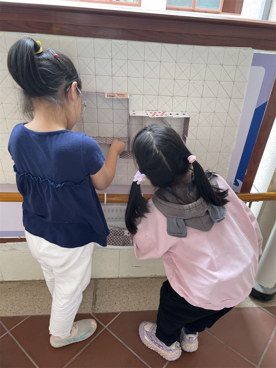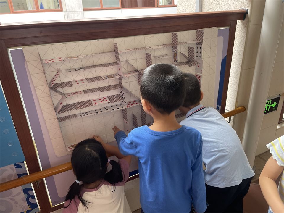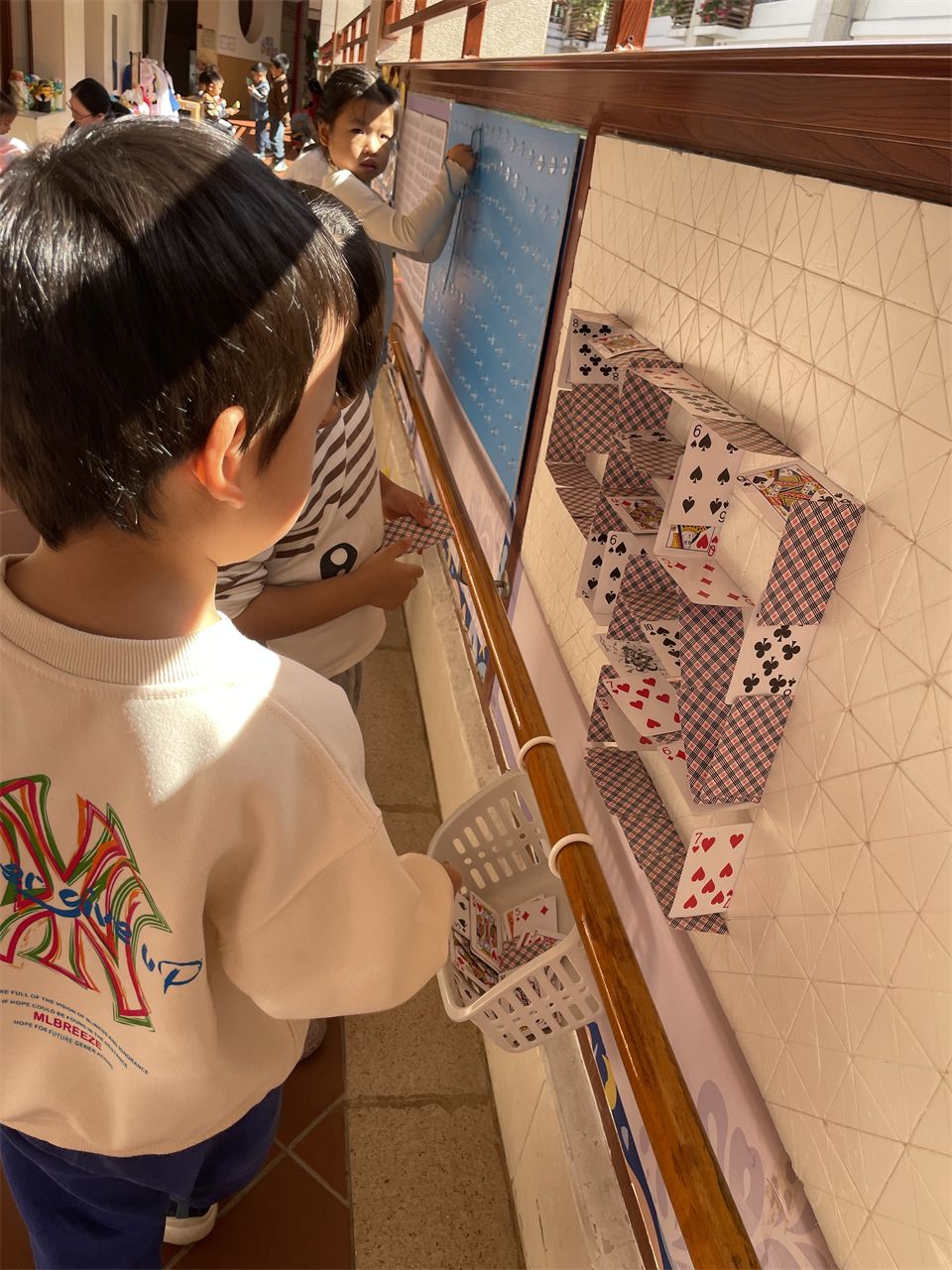 最热闹的要数扑克牌创意墙:墙面的缝隙成了天然“支架”,孩子们攥着扑克牌,一会儿横着叠出“小楼梯”,一会儿竖着拼出“花朵”,连纸牌的花色都成了装饰元素,小手摆弄间,普通的扑克牌变成了立体小装置,每次路过都能看到新图案。