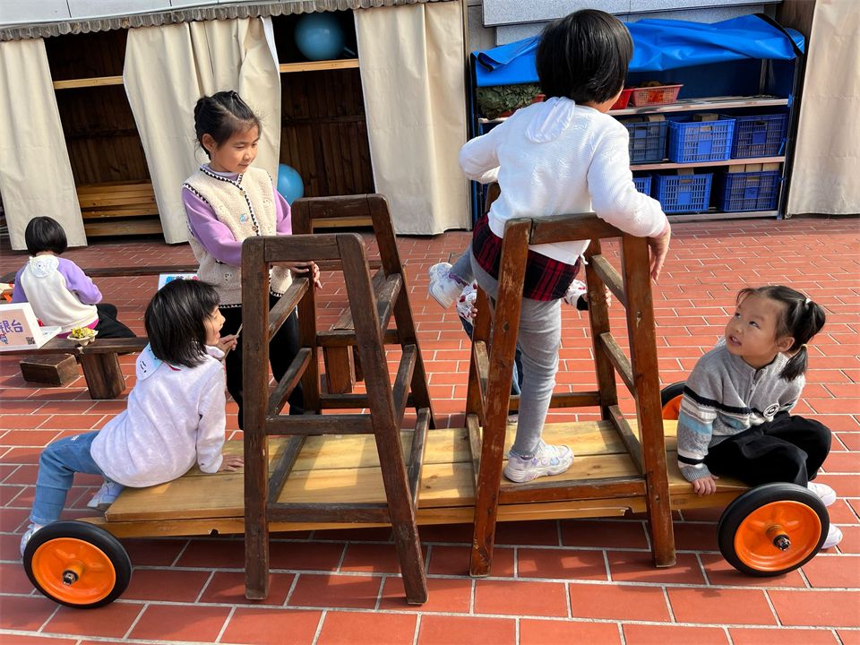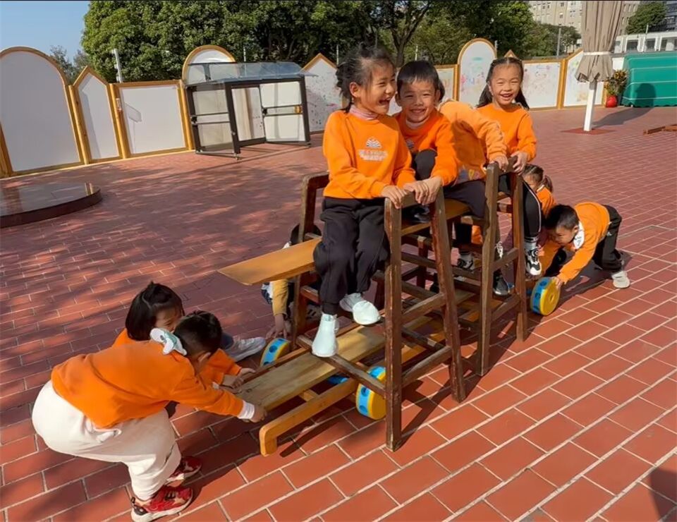 最让人惊喜的,是孩子们的“造车记”。他们利用万能工匠、各种木梯和木板,大胆尝试、反复搭建,有的车高一点,有的车长一点,有的还加上了“车厢”和“座位”。在亲手搭建的过程中体验到“从无到有”的成就感。一辆辆“自制小车”,不仅承载着孩子们的创意,更记录着他们的专注与坚持。
