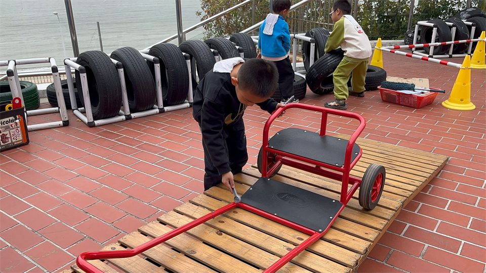 另一边,孩子们又搭建起了“洗车修理厂”和“加油站”。他们用轮胎、木板和布置出“洗车区”“维修区”和“加油区”,有的拿着“抹布”给小车擦一擦,有的拿着“扳手”装模作样地修车,还有的负责给车子“加油”。孩子们分工合作,从“洗车”到“修车”再到“加油”,一条龙服务“到位”,在游戏中体验不同职业的角色,感受劳动的价值。