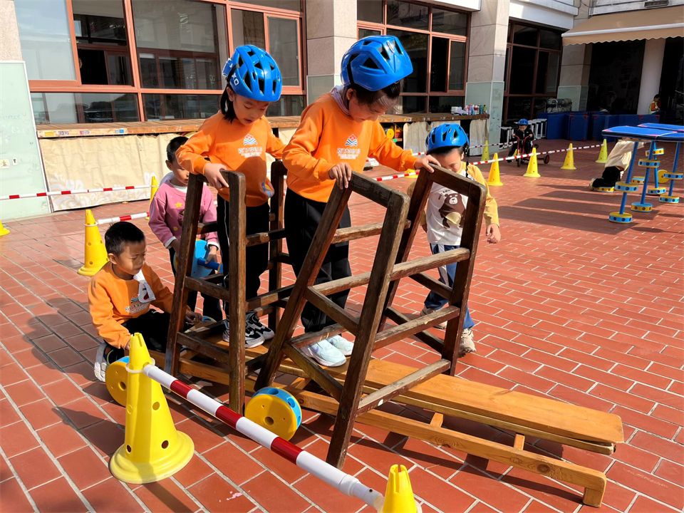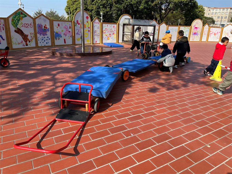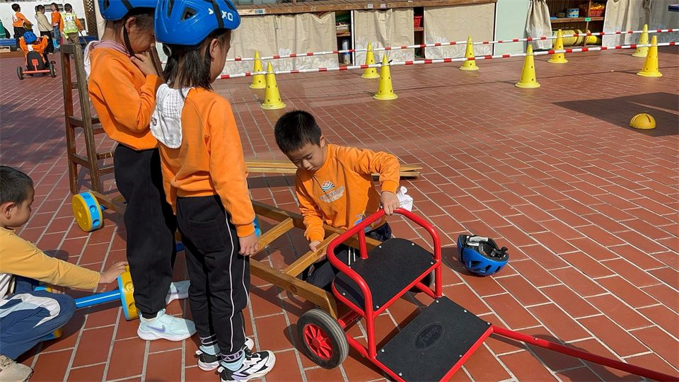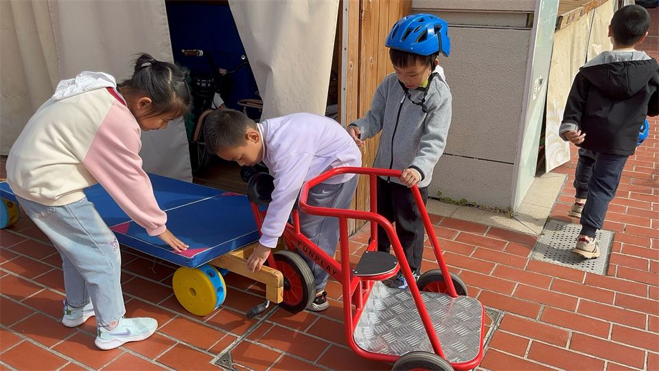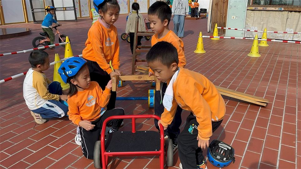 发现问题后,宝贝们立刻围成一圈开动小脑筋。孝泽眼睛一亮:“我们找辆车来当车头吧!” 大家火速行动,找来小三轮车、平衡车,小心翼翼地把木板、木梯和车头稳稳连接起来,推着 “新车” 一试,果然顺利拐弯啦!欢呼声瞬间在骑行区响起!