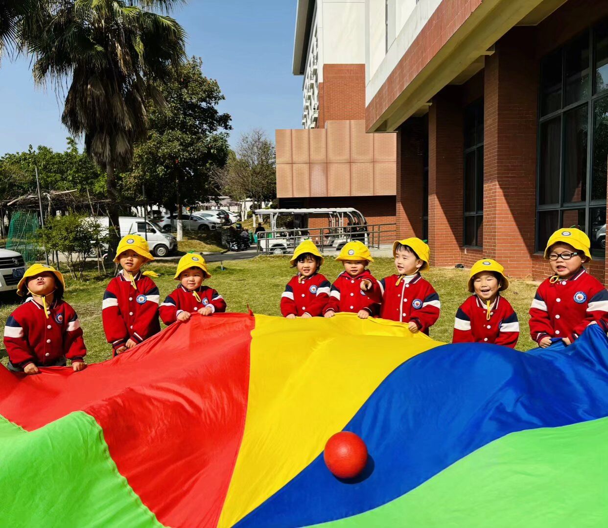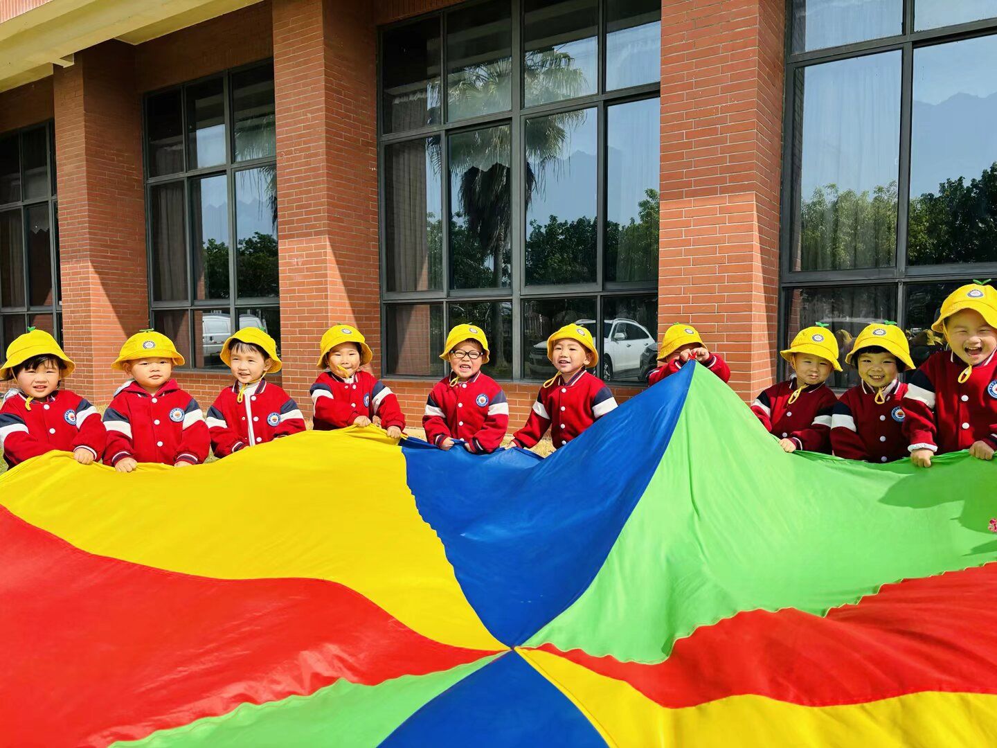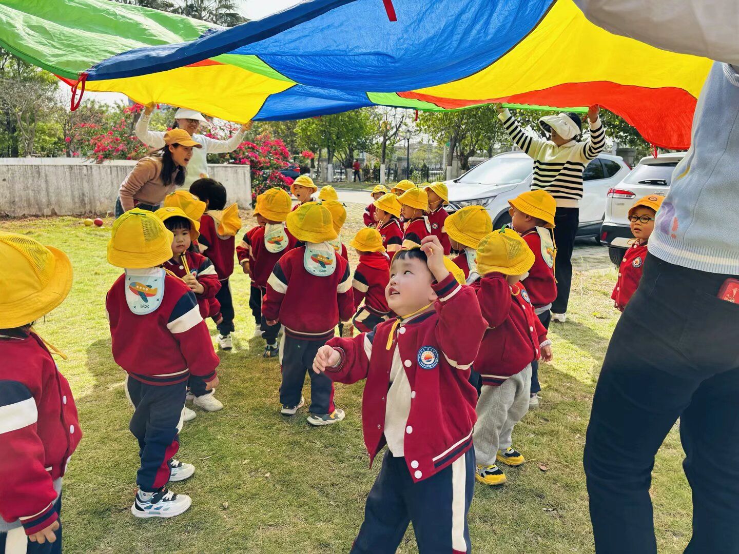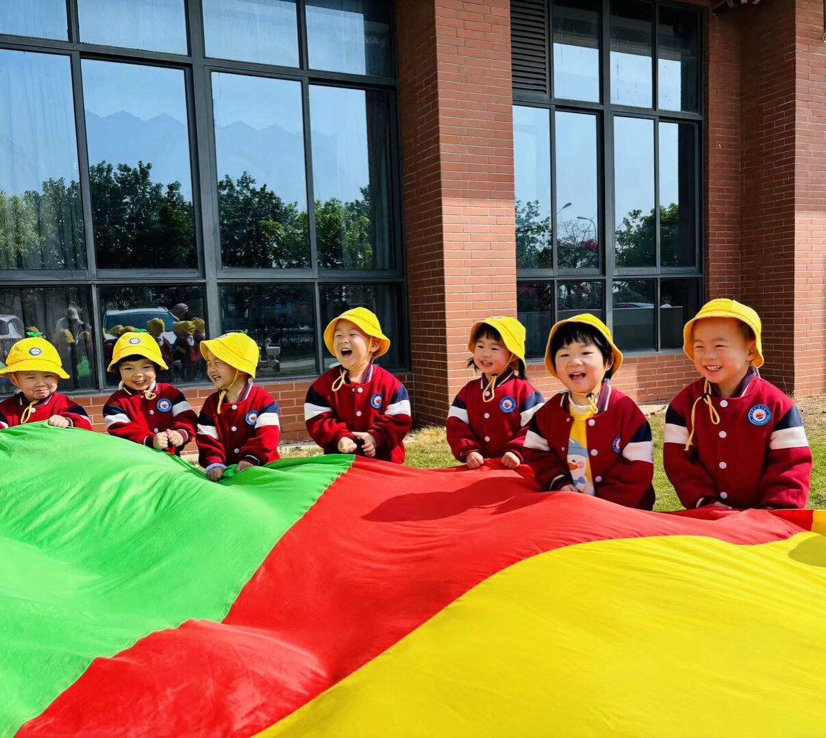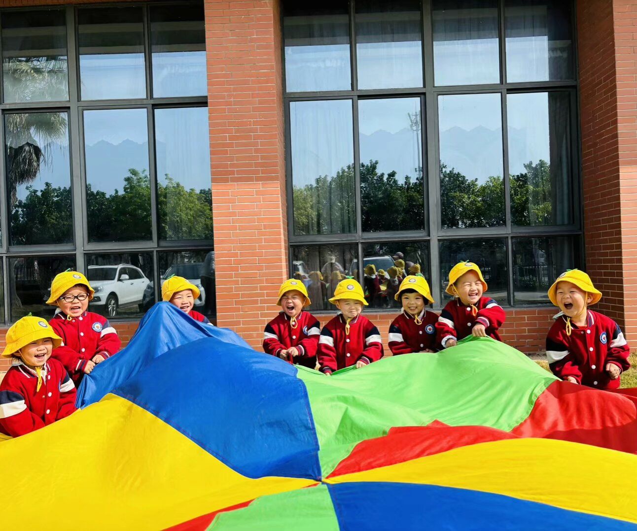 看,孩子们开心的笑脸、时不时的笑声,最受欢迎的要数彩虹伞游戏环节了。