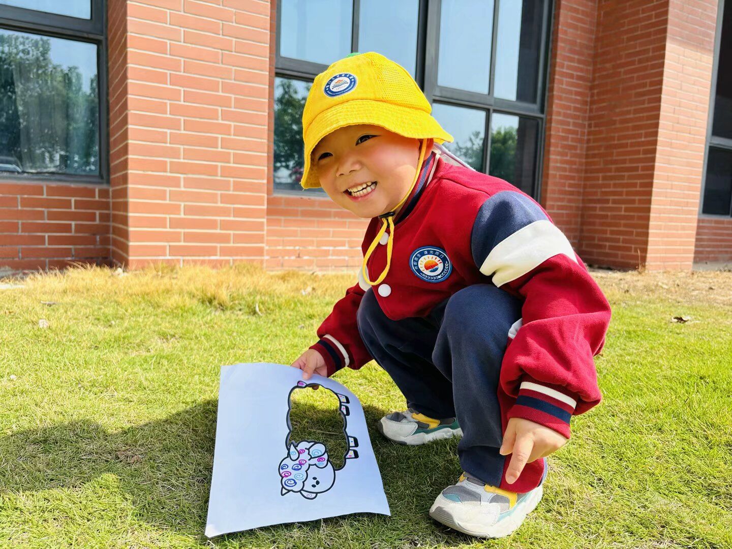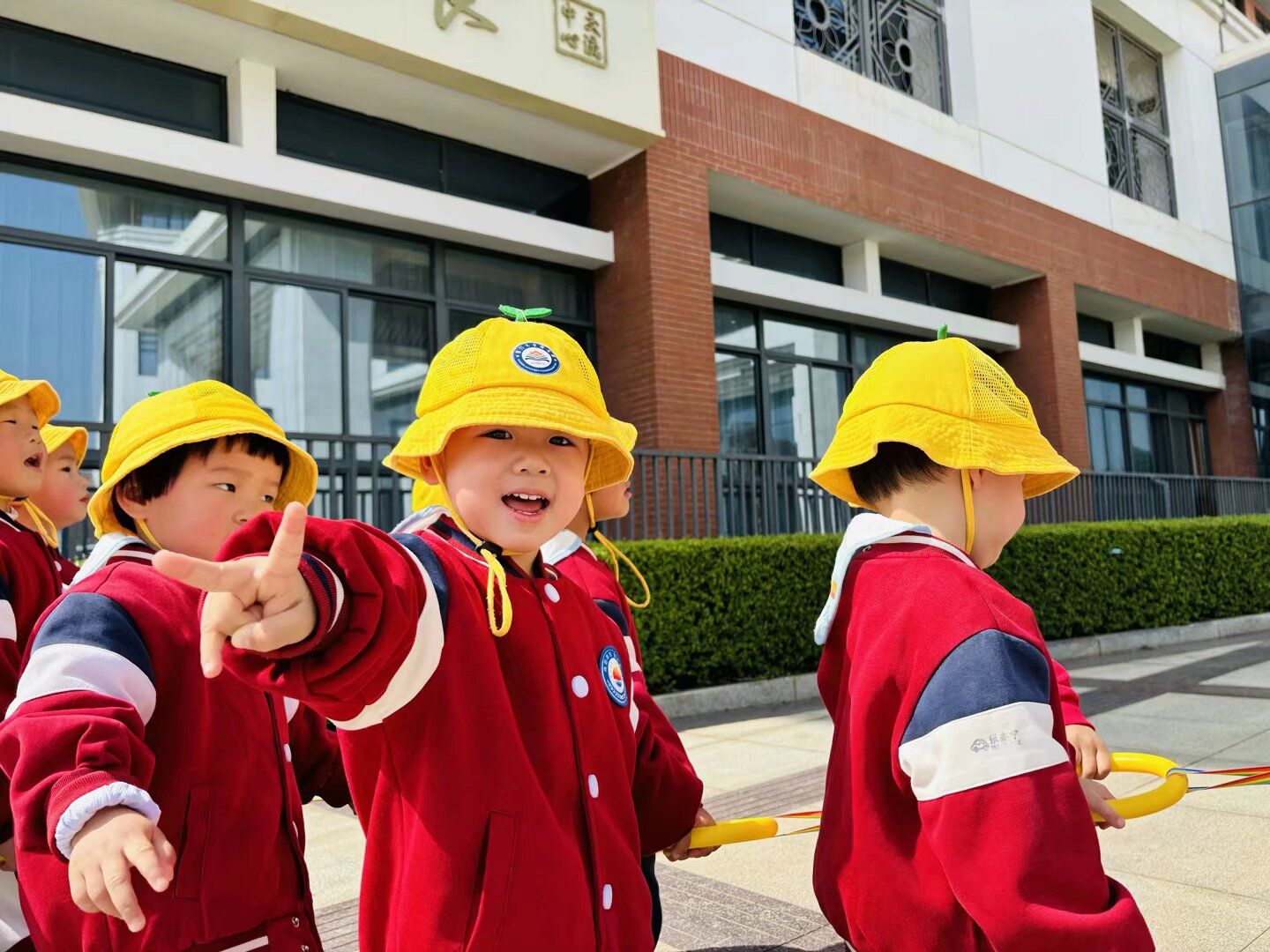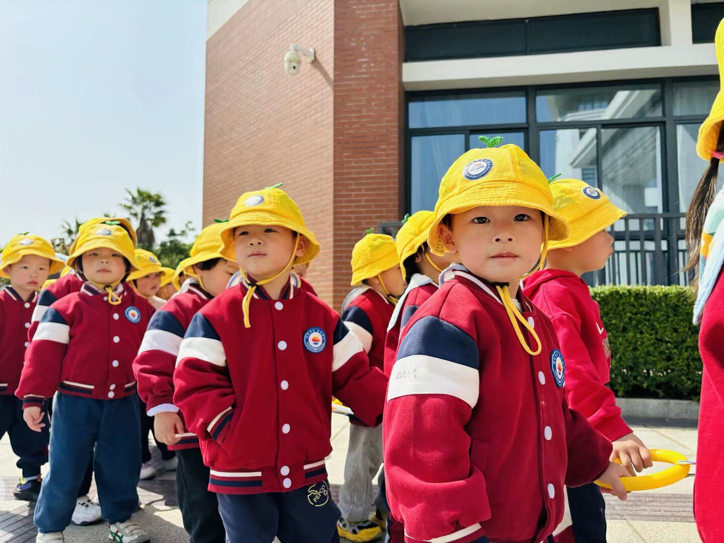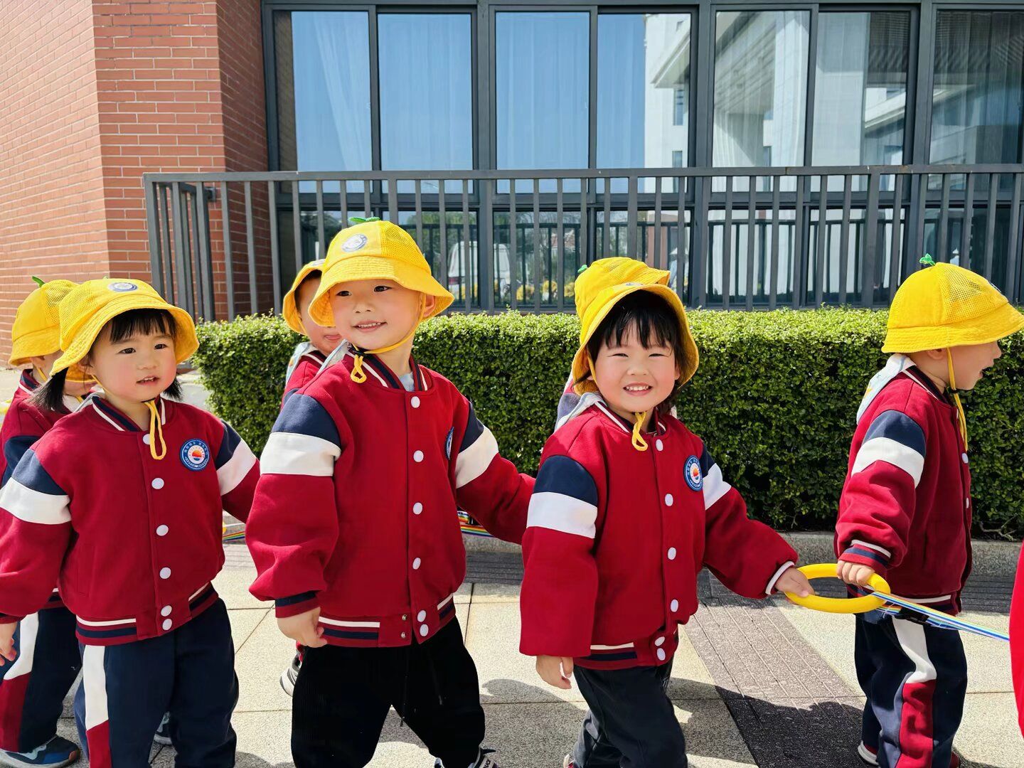 小火车开动啦!随着老师欢快的口号声,孩子们戴好小黄帽,开心地出发啦!
