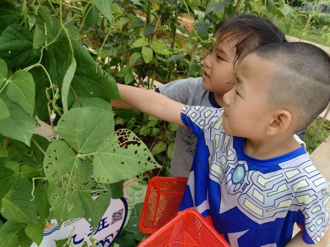 终于,我们等来了丰收的这一天。早上来幼儿园的时候我们发现豆角都成熟了。于是我们迫不及待地拿上袋子、筐子以及摘豆角的工具兴高采烈的出发去摘豆角了啦!来到菜地,我们争先恐后地采摘起来。“我摘的豆角最大!”“我摘的豆角最多。”我们一边摘着豆角,一边和伙伴们讨论着豆角的形状和大小。不一会儿,我们就摘了满满一大筐豆角带回了班级。