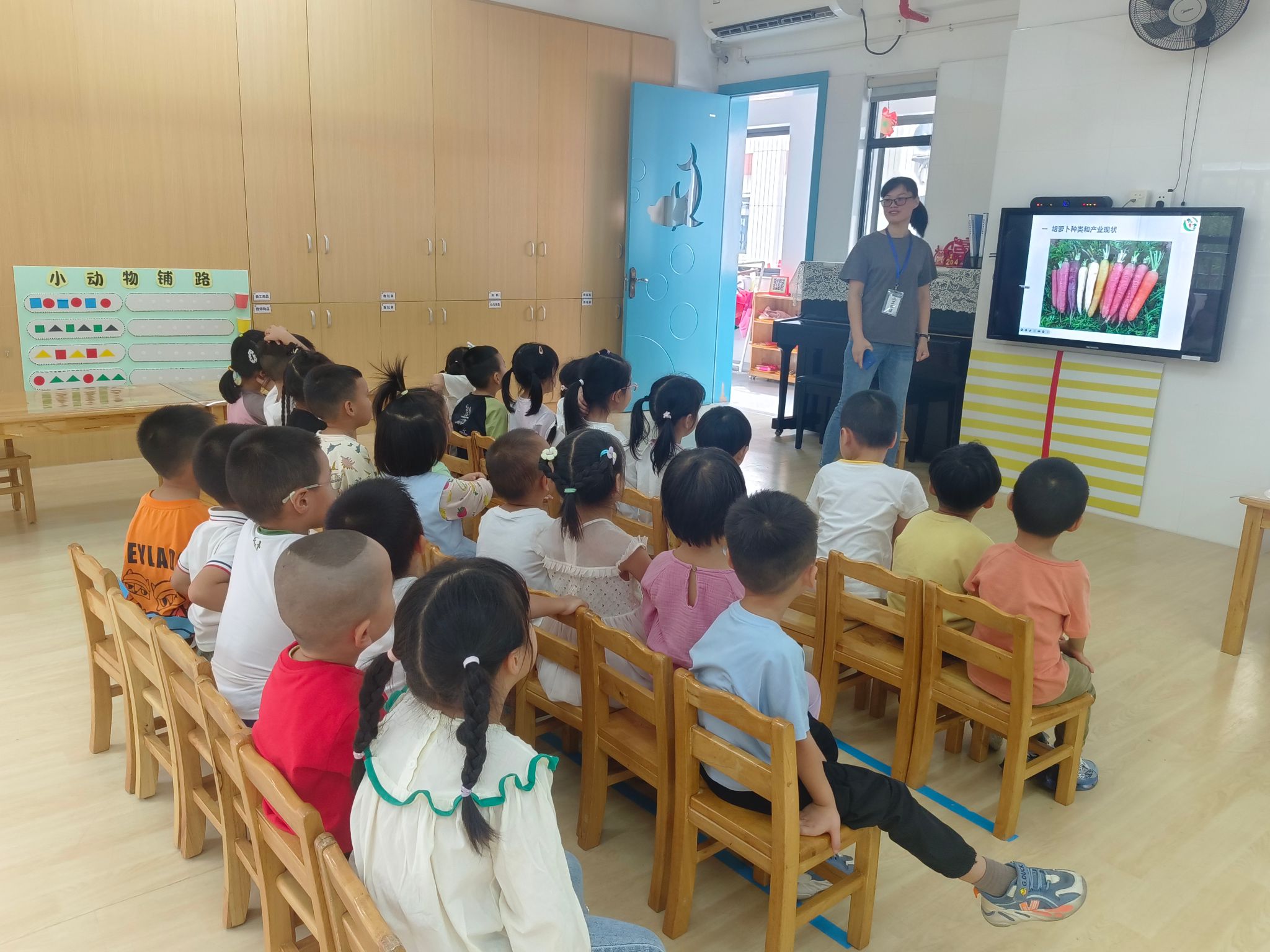 幼儿园迎来了一位特别的客人—— 新农人-彭雪娟。孩子们热情的叫她“彭老师”,彭老师向中九班的小朋友们分享胡萝卜的营养价值和魅力以及胡萝卜的种植和种植后期的照顾方法,让孩子们爱上这个橙色的“小人参”。