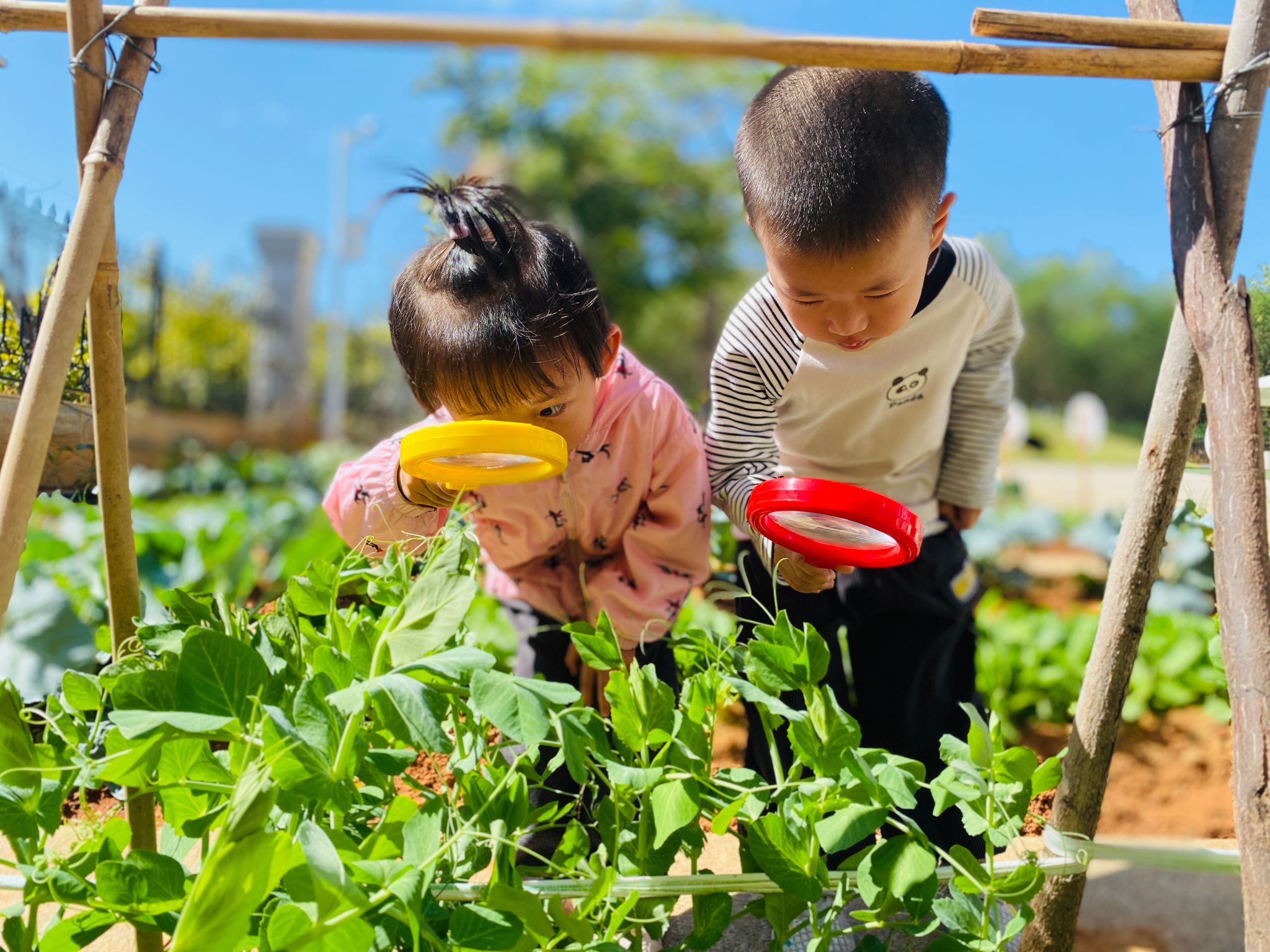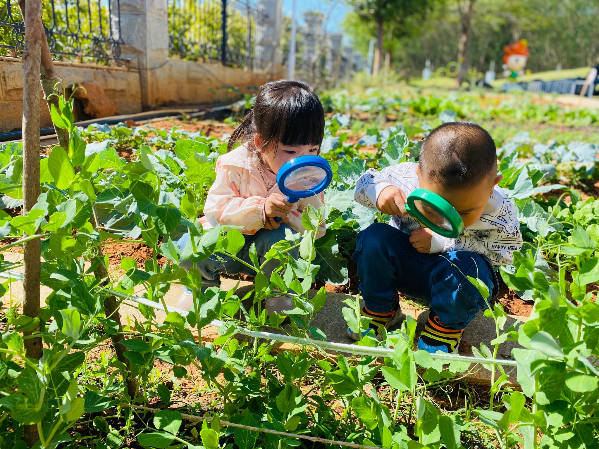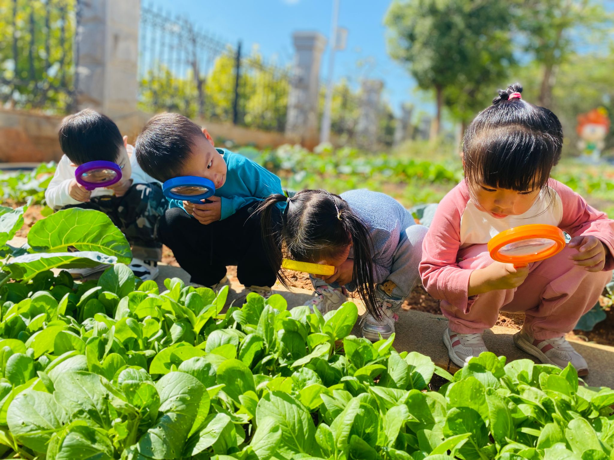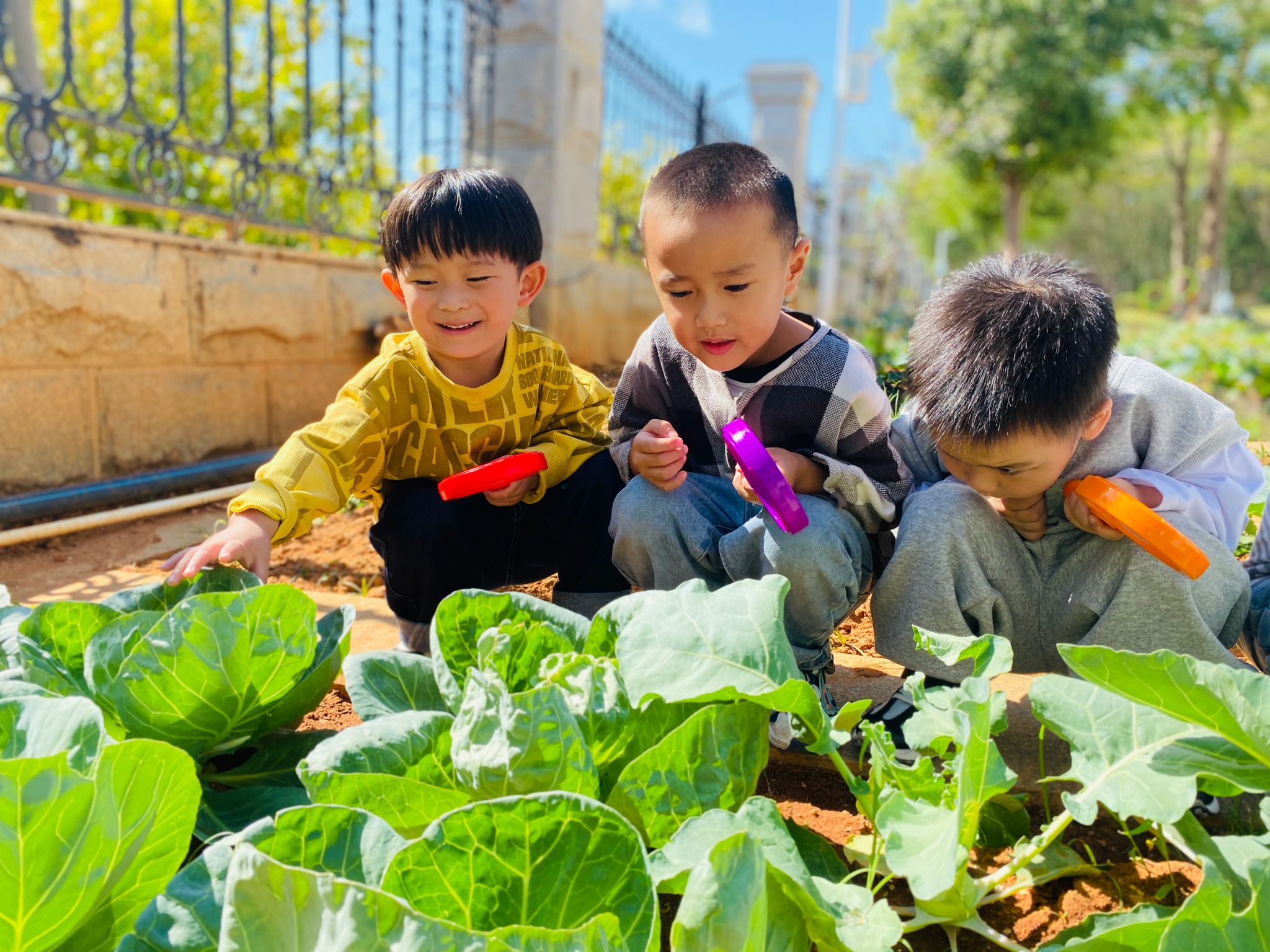 瞧瞧,菜地里的蔬菜长得饱满、鲜亮,萌娃们手握放大镜,开始了他们的大探秘。