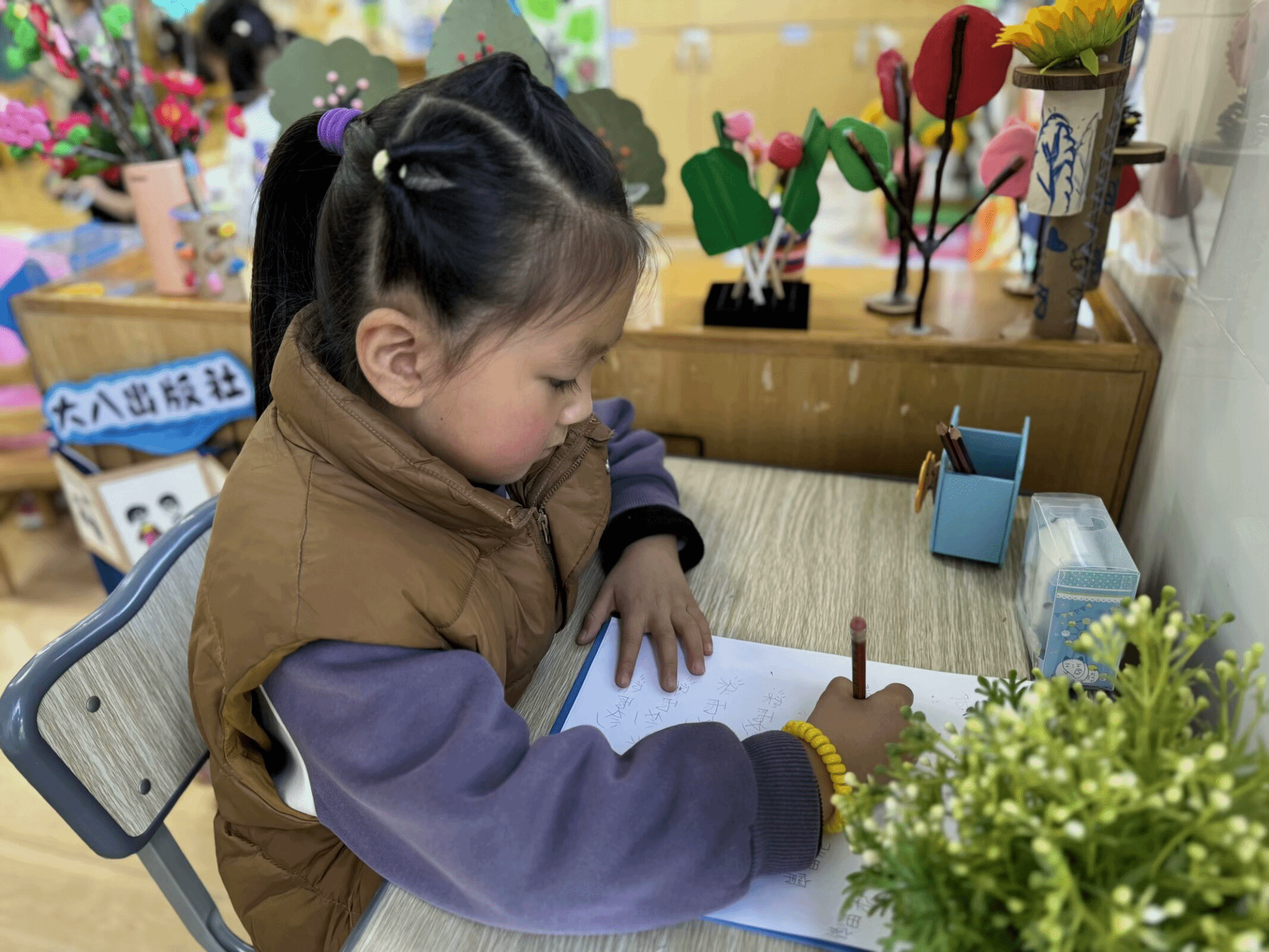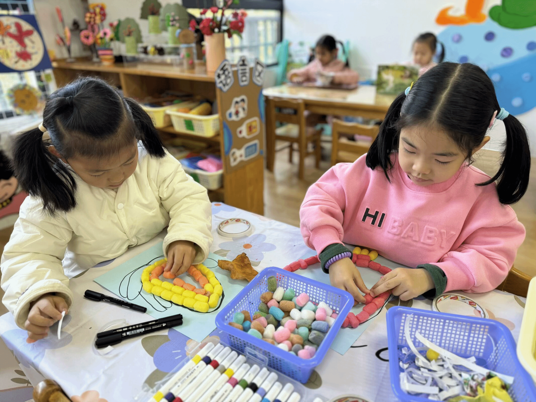 美工区内,孩子们围坐在一起,小手沾满五彩的颜料,正在专注地作画。他们有的用水彩笔在纸上勾勒出美丽的花朵,有的用彩泥捏出可爱的小动物。老师轻轻走过,耐心地指导着,孩子们脸上洋溢着创作的喜悦。