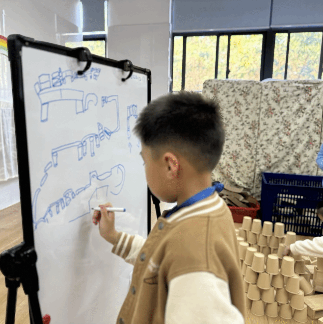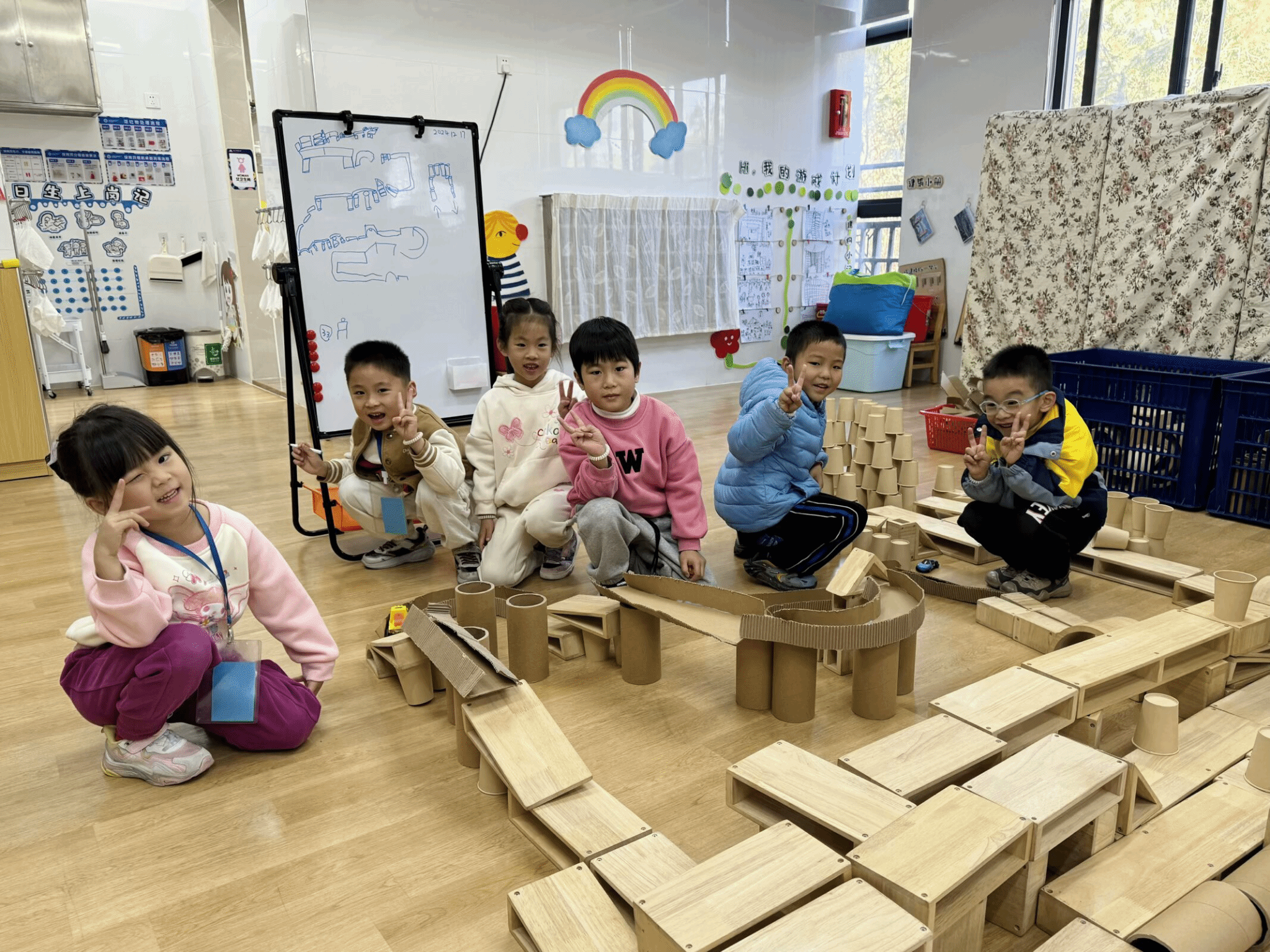 建构区里,孩子们正忙碌地搭建着属于他们的城堡。他们有的搬动积木,有的调整形状,时而思考,时而讨论。城堡逐渐成形,孩子们的眼中闪烁着成就感的光芒。