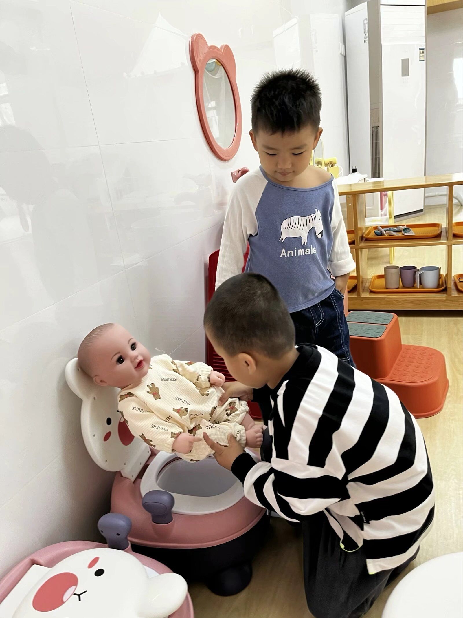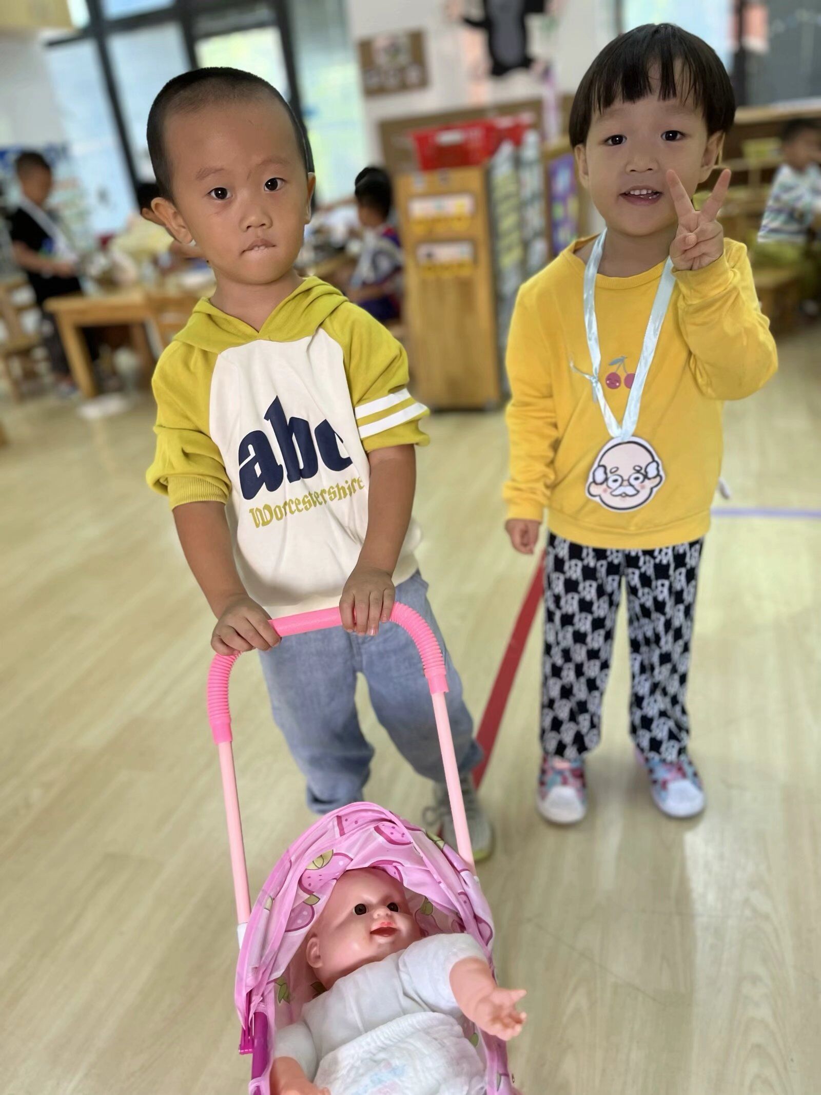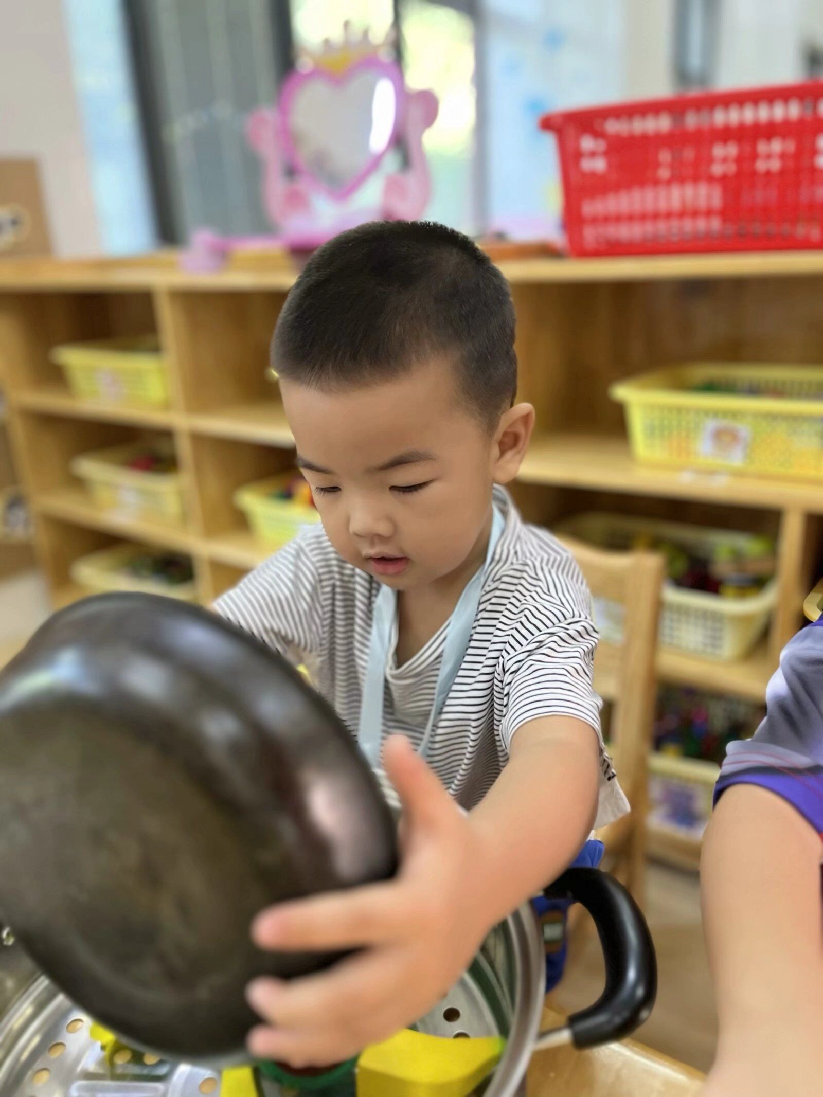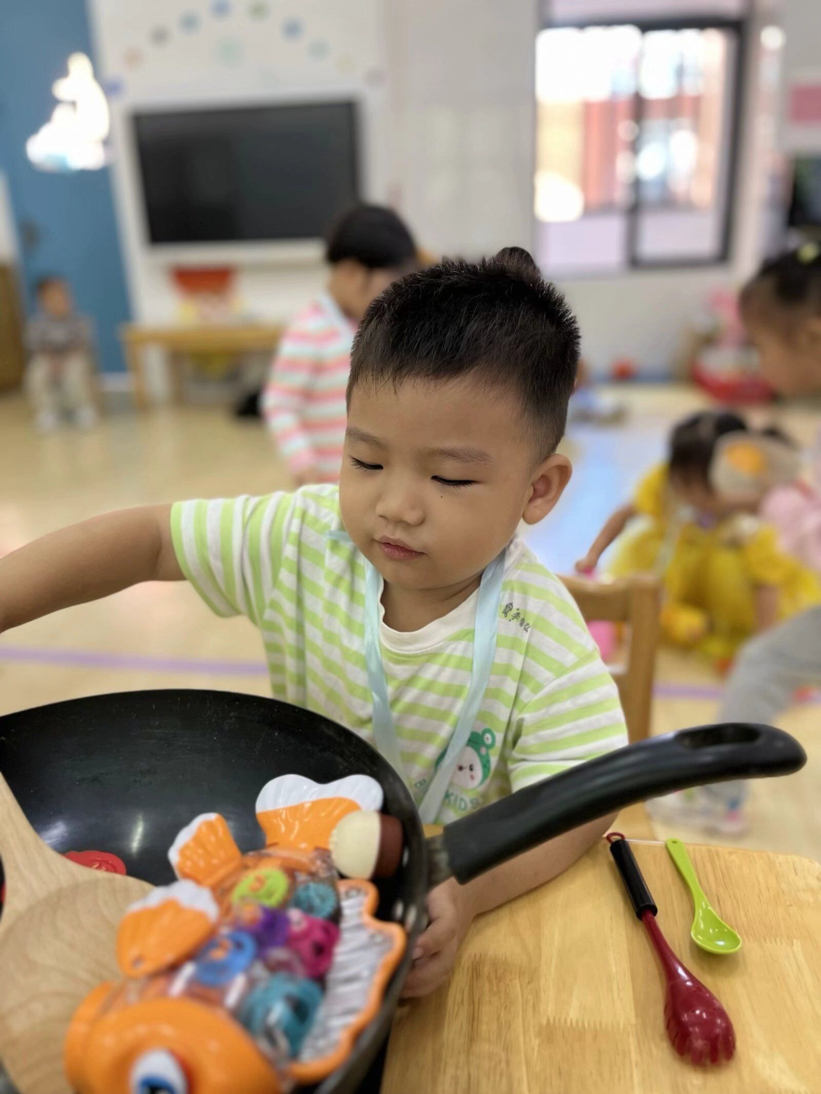 在角色游戏中,孩子们可以自由地发挥其想象力和创造力,因而他们对角色游戏的兴趣最为浓厚,瞧瞧,他们煮饭、喂宝宝来还有模有样的!大家玩得不亦乐乎,角色游戏真好玩~
