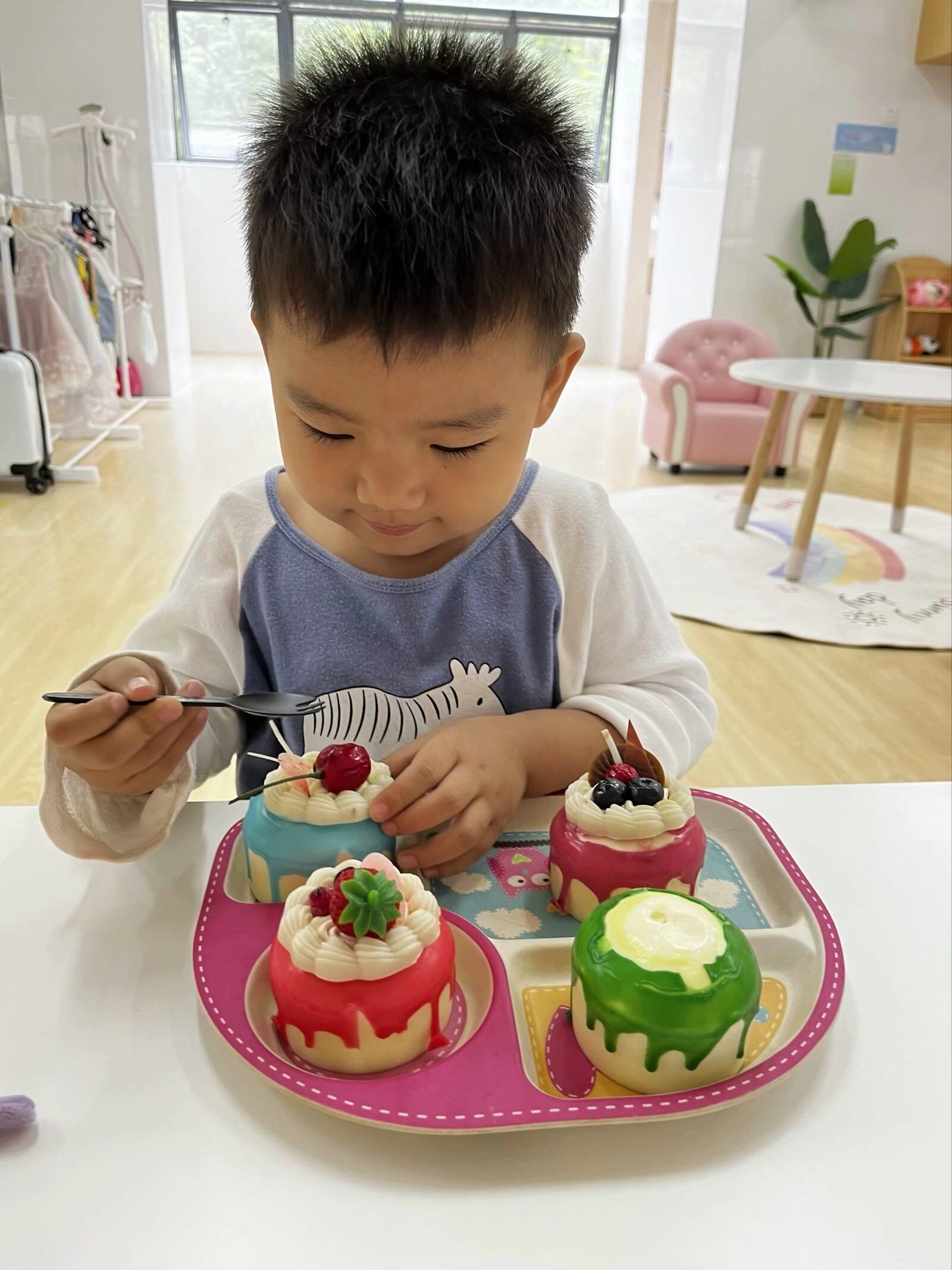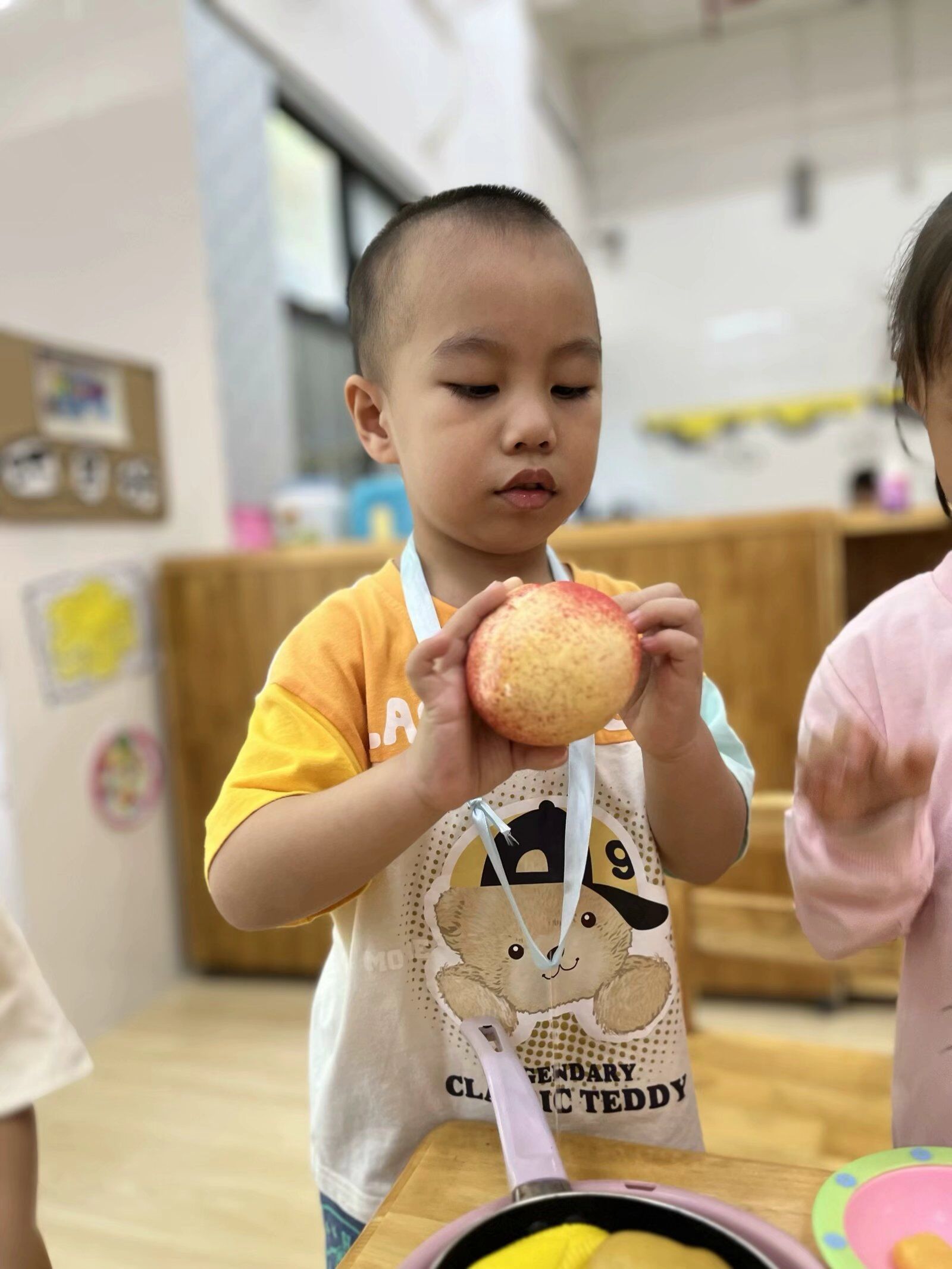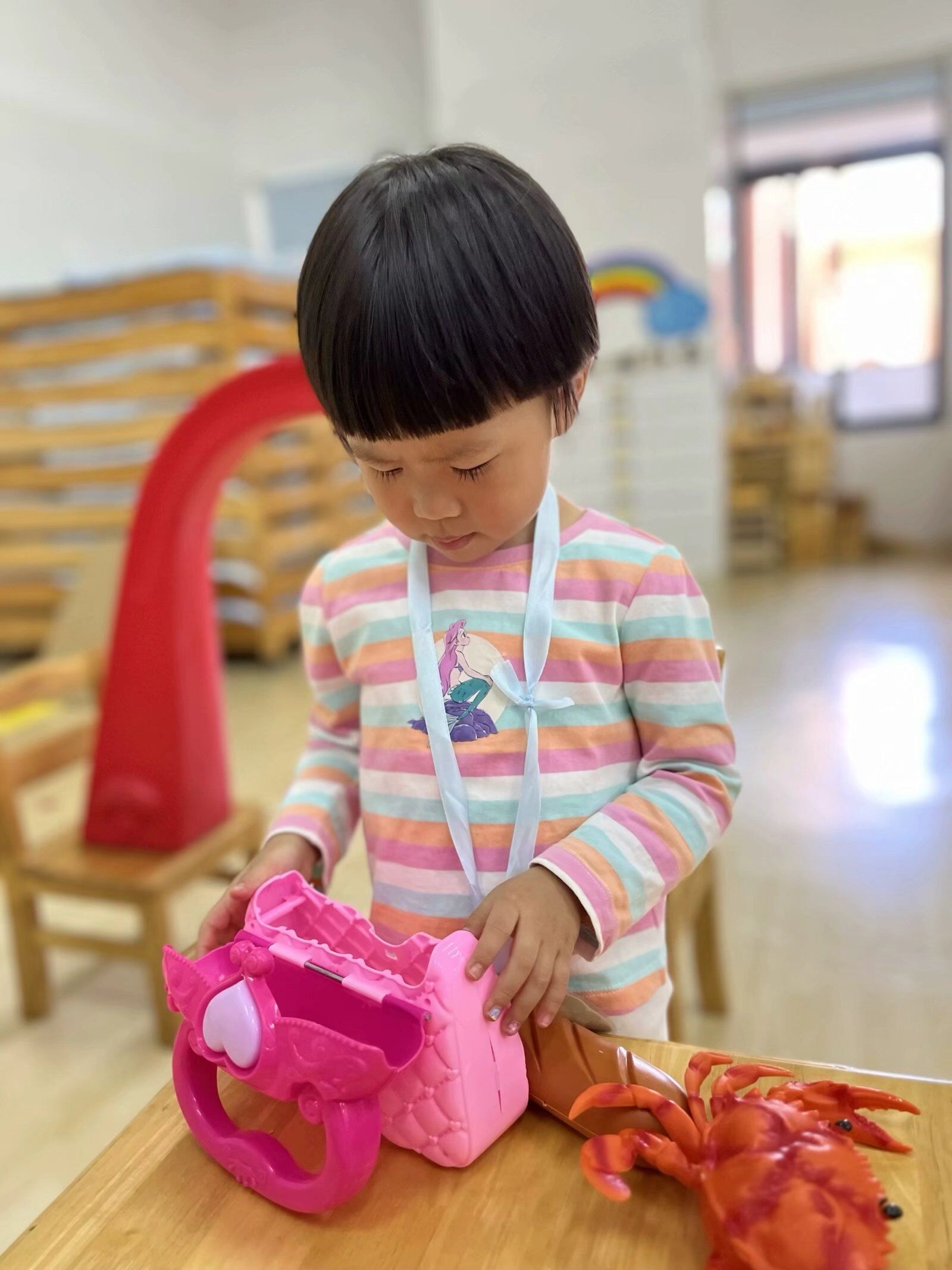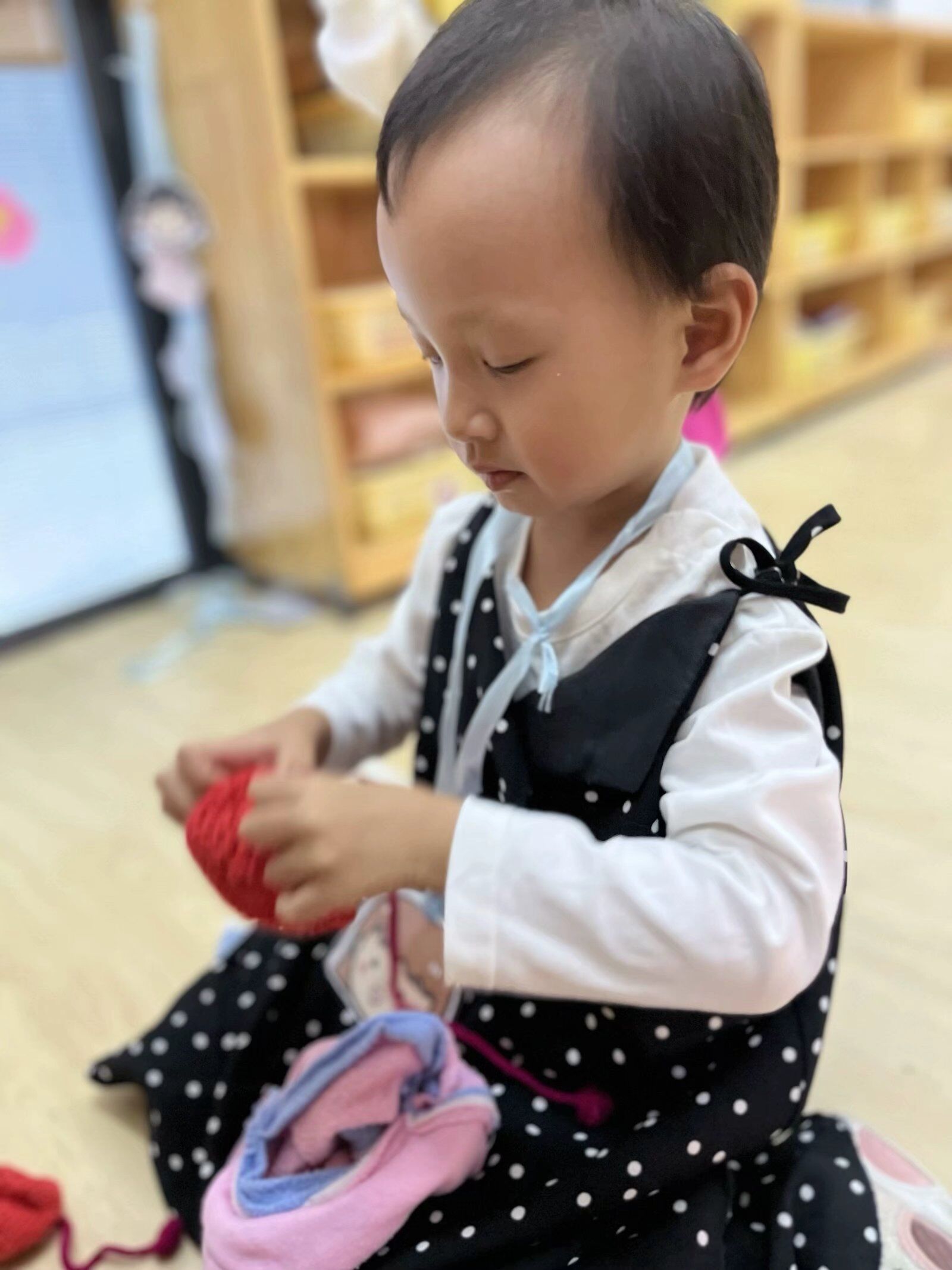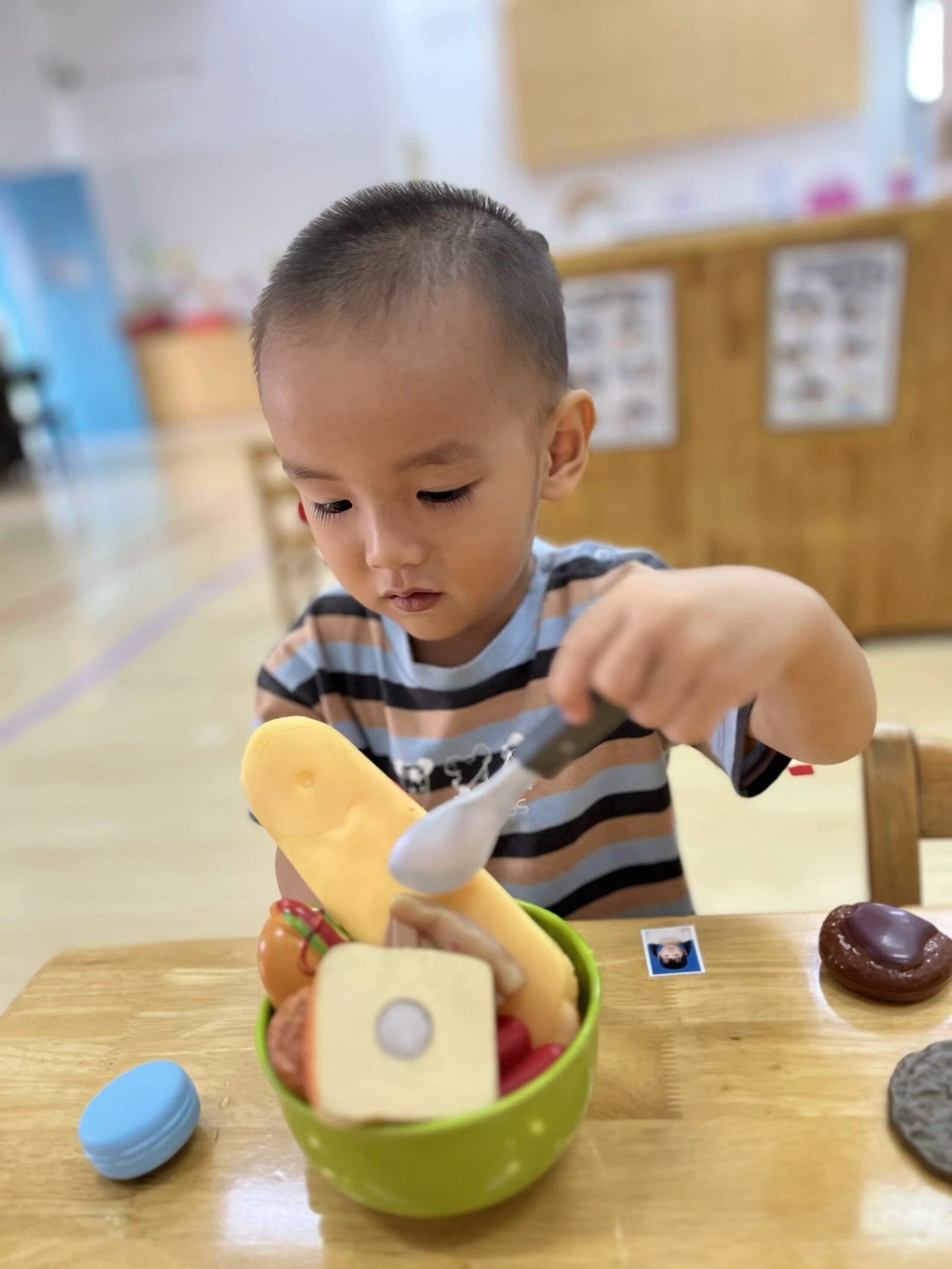 在角色游戏中,孩子们可以自由地发挥其想象力和创造力,因而他们对角色游戏的兴趣最为浓厚,瞧瞧,他们煮饭、喂宝宝来还有模有样的!大家玩得不亦乐乎,角色游戏真好玩~