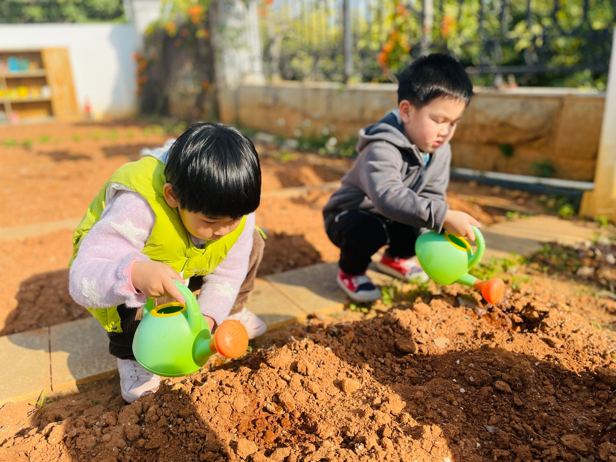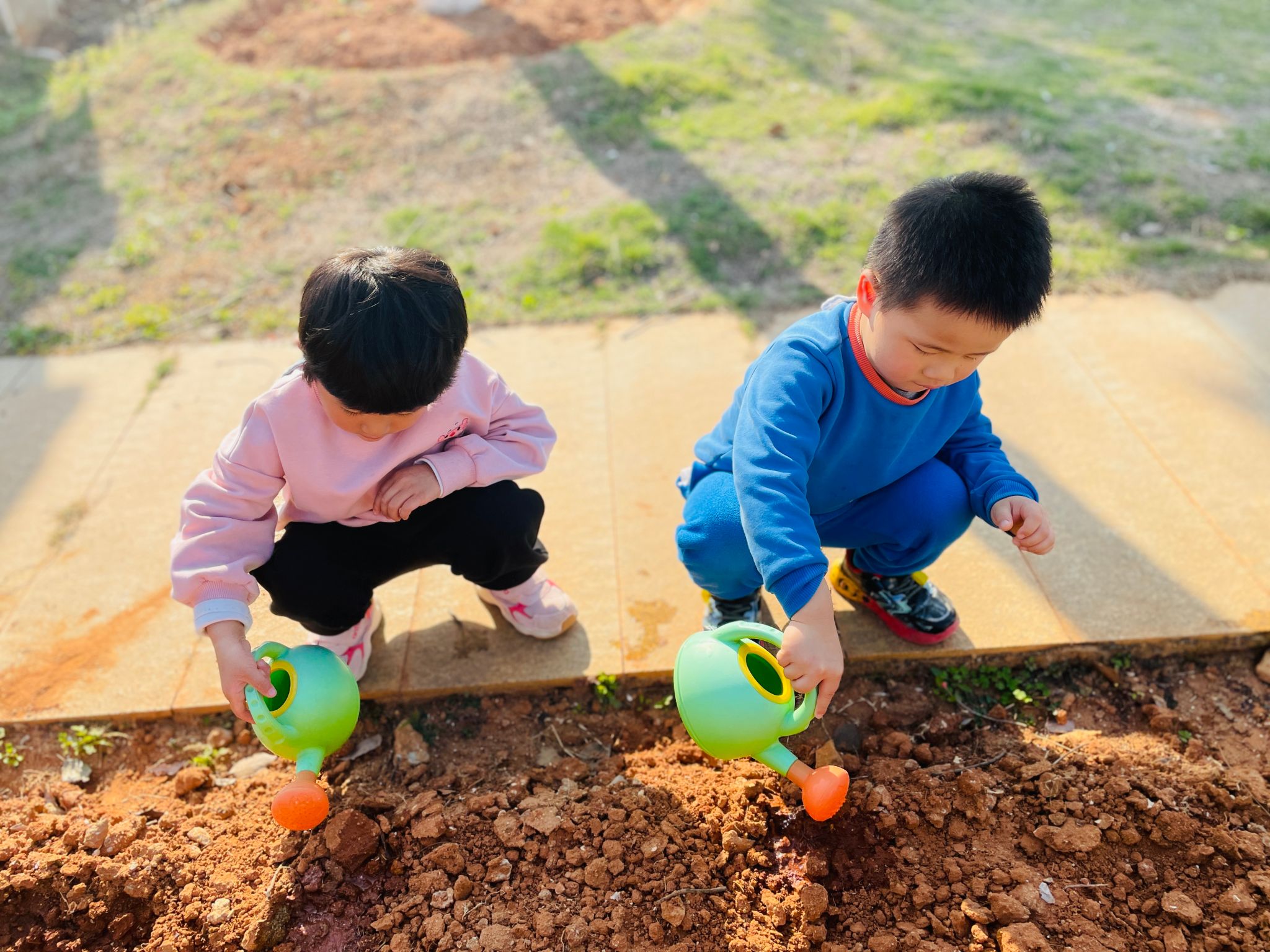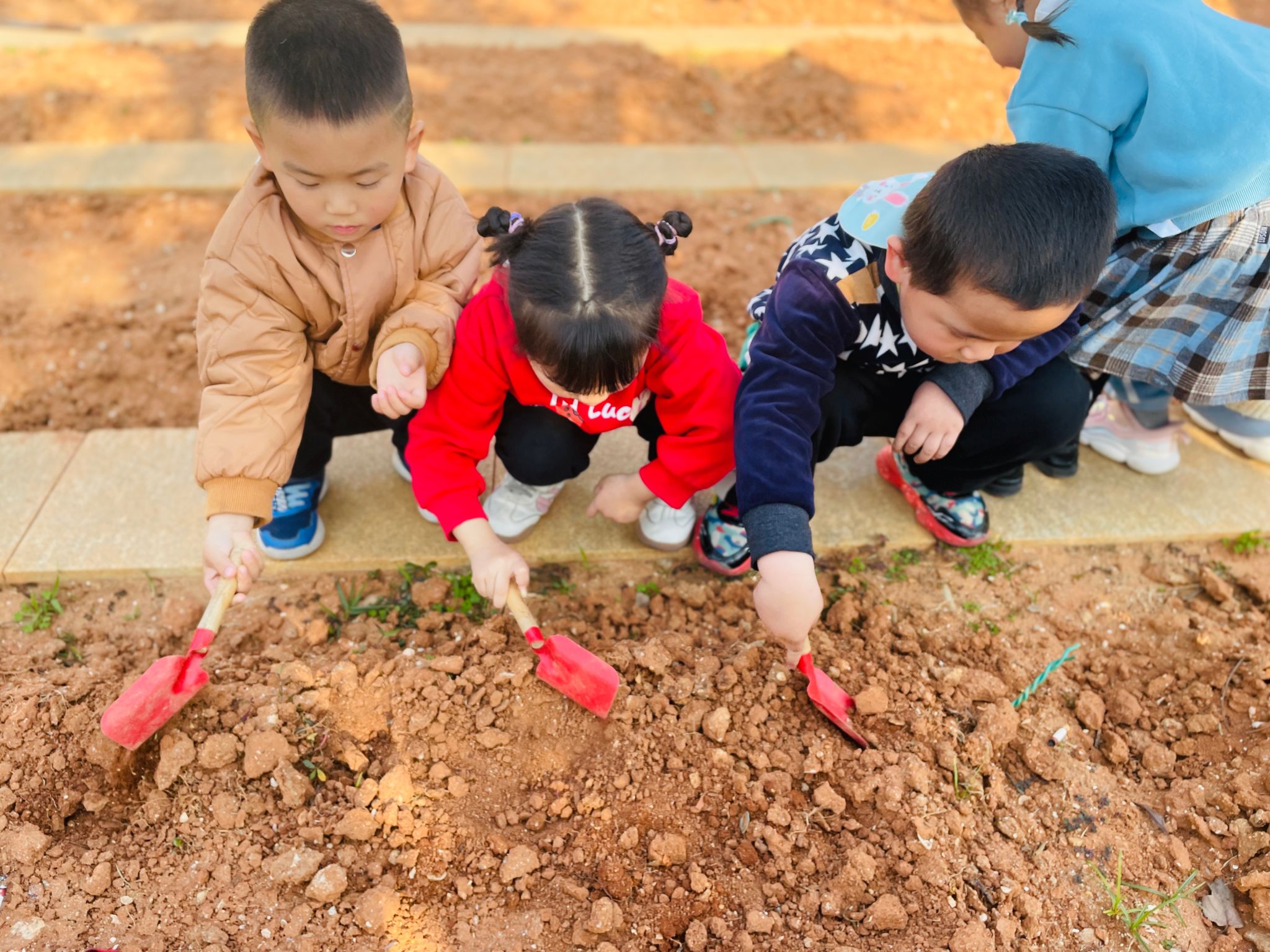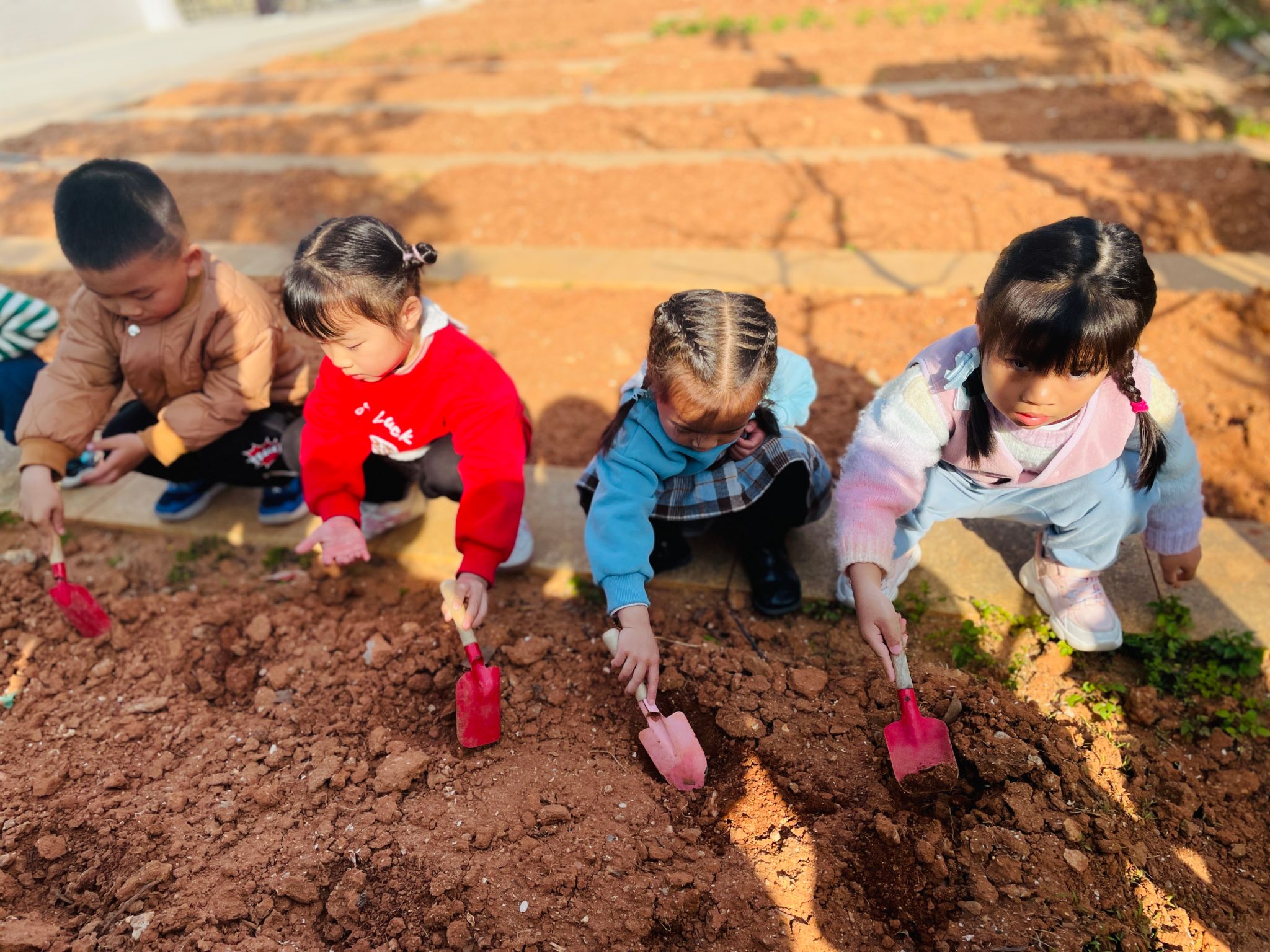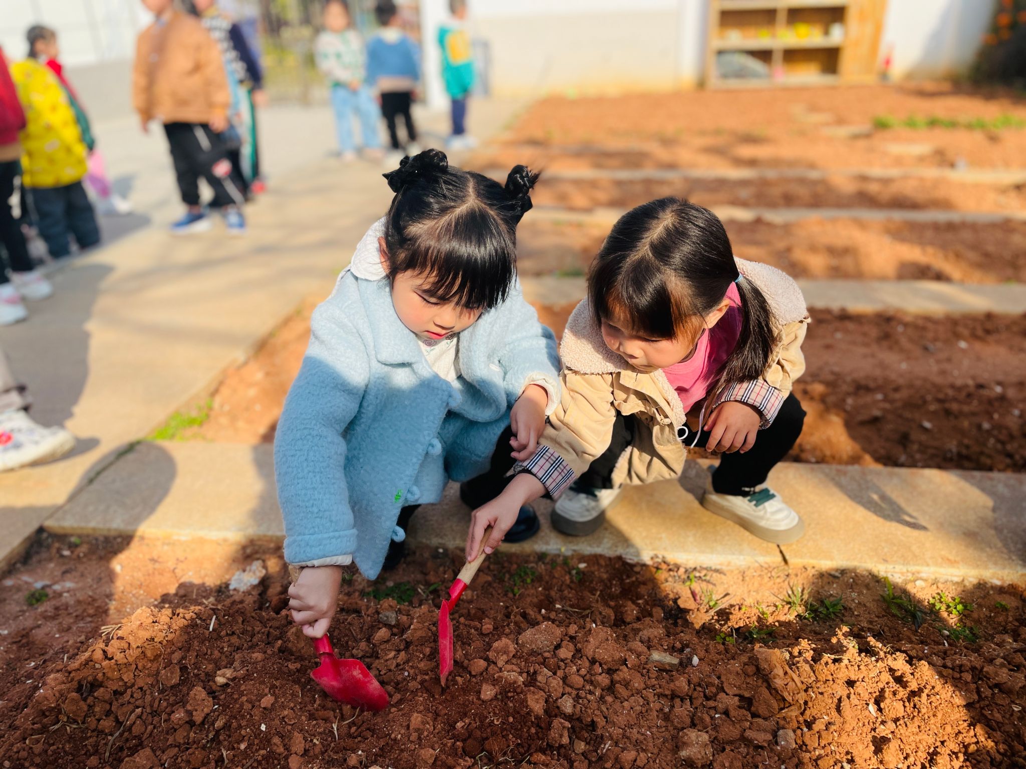 春天是播种的季节。瞧,孩子们在菜地里松土,挖坑,准备播种向日葵啦。希望向日葵小种子在孩子们精心照顾下,能快快发芽,开出美丽的花朵哦。