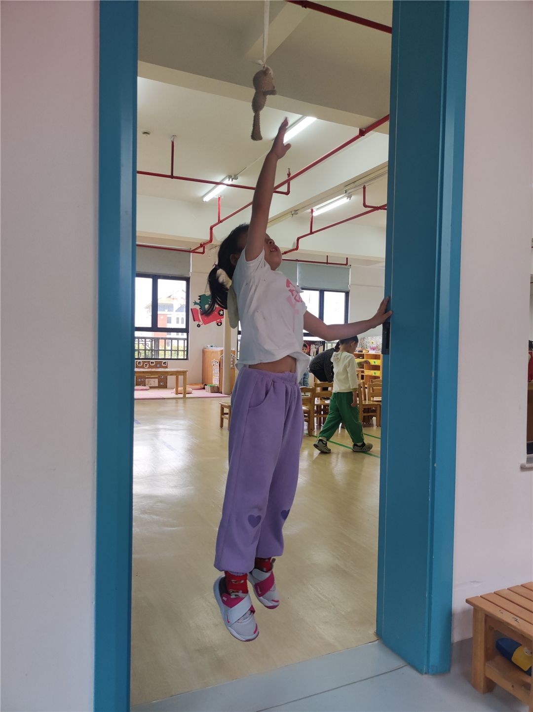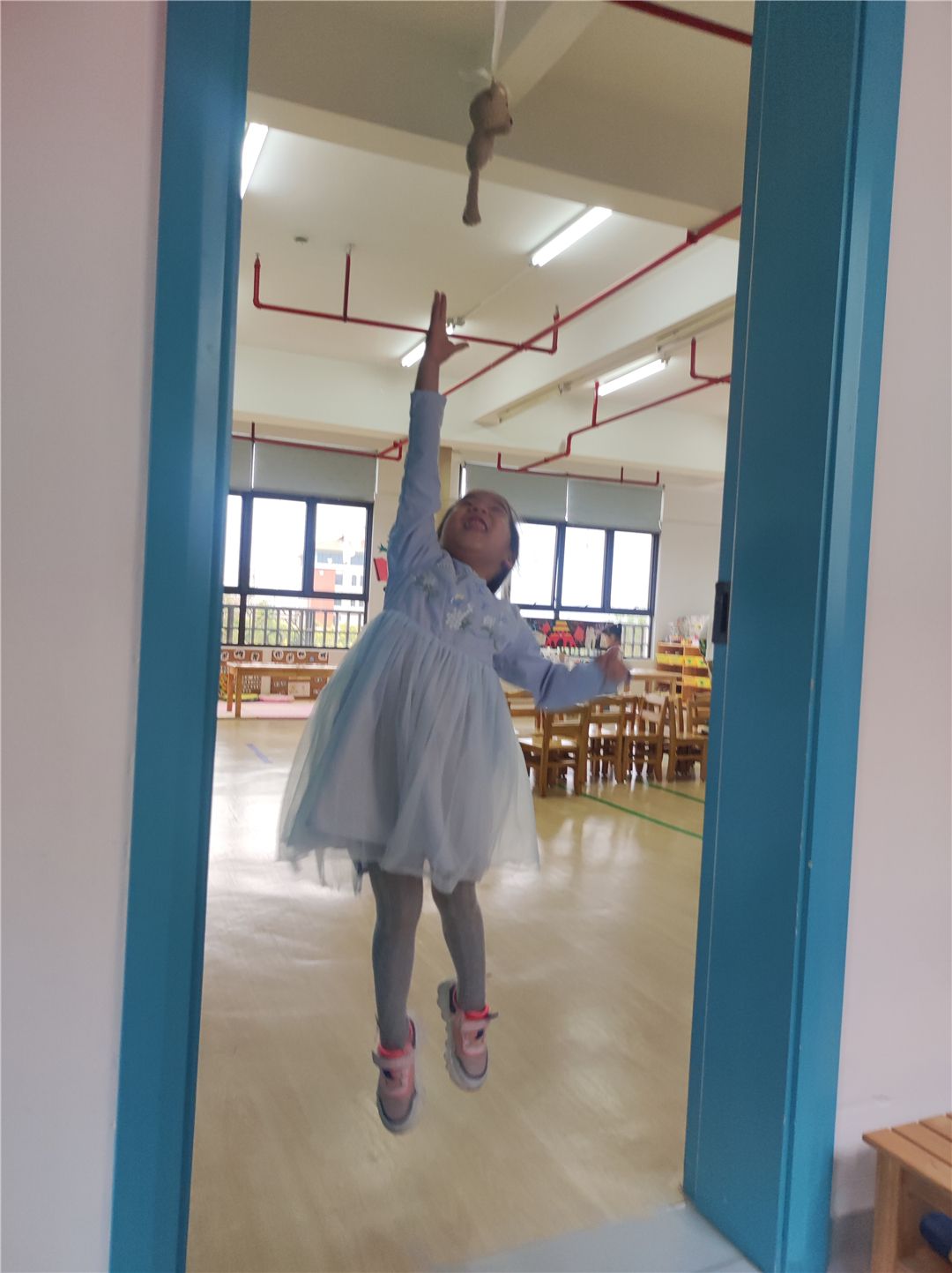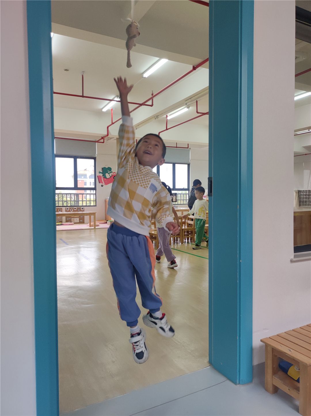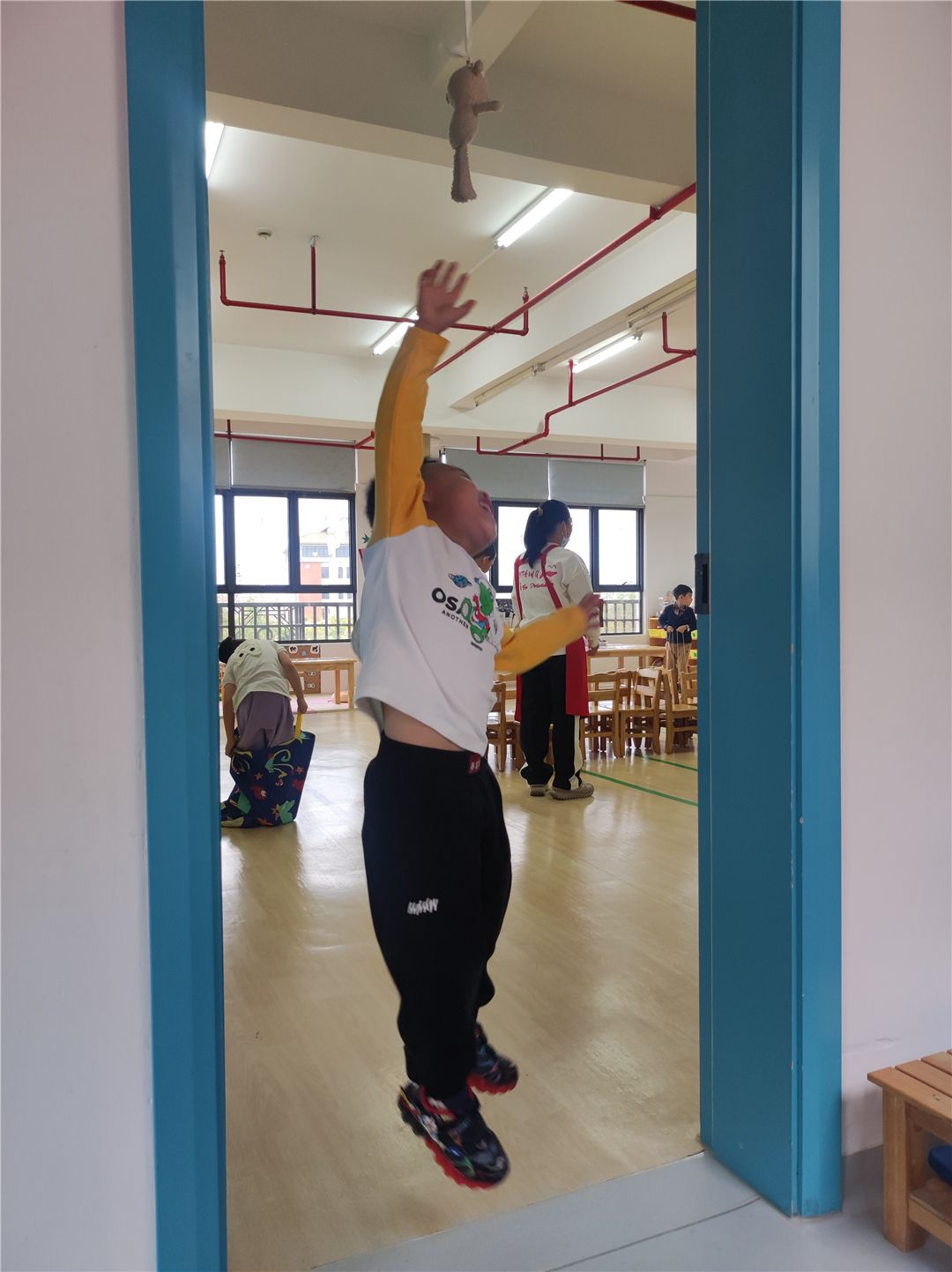 瞧,萌娃们精神抖擞的跳过一道道的障碍物,然后,奋力一跳,去碰触用绳子悬挂的兔子,这是进入密道的开关。