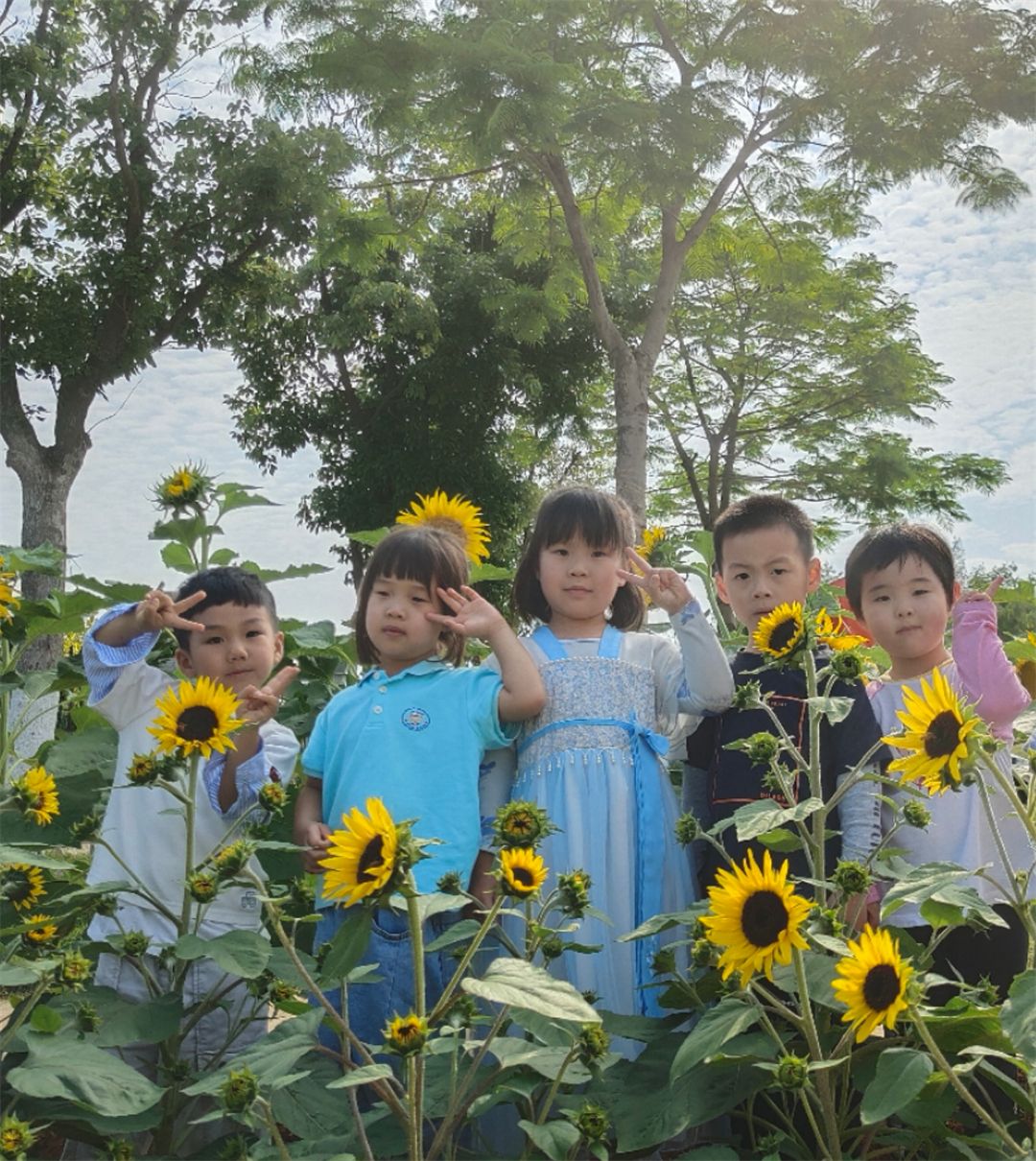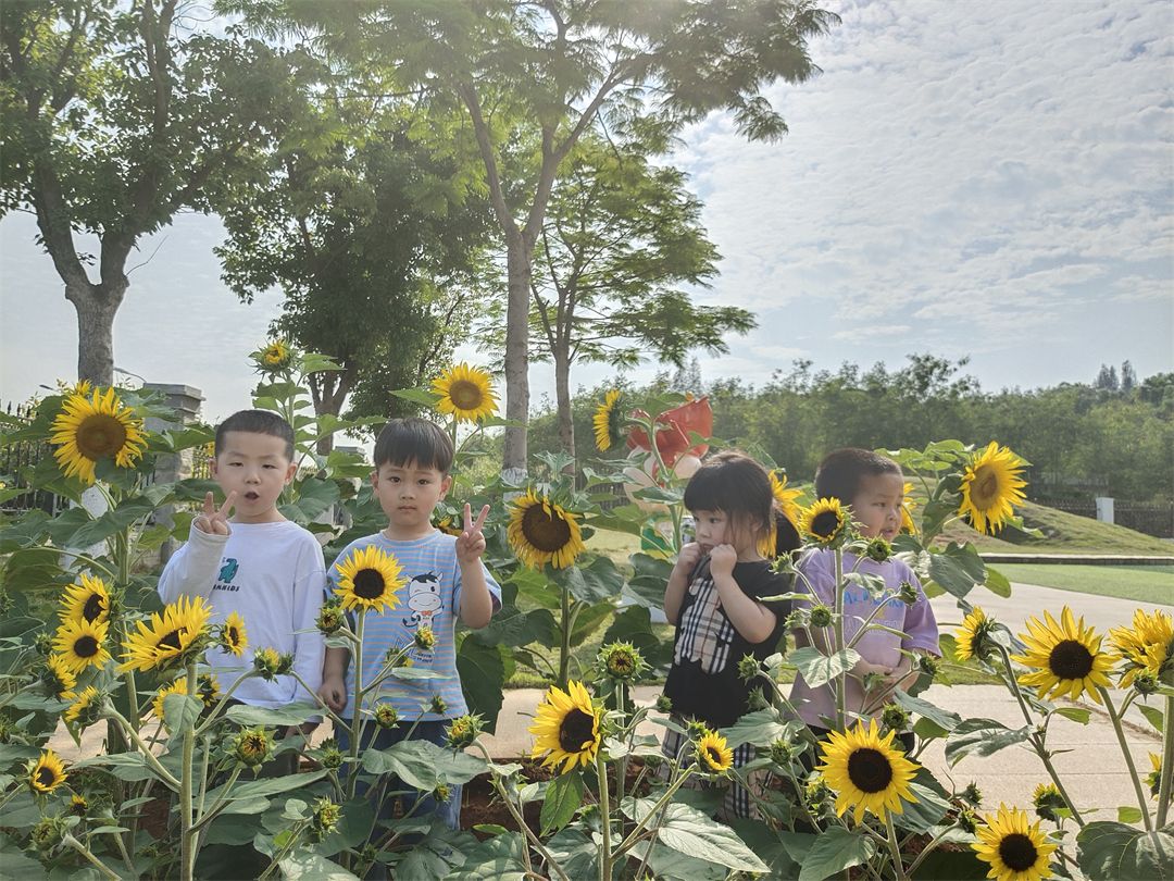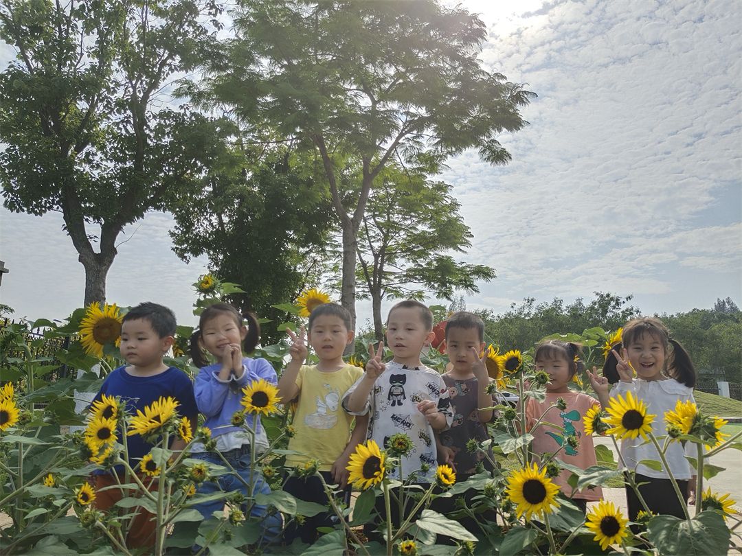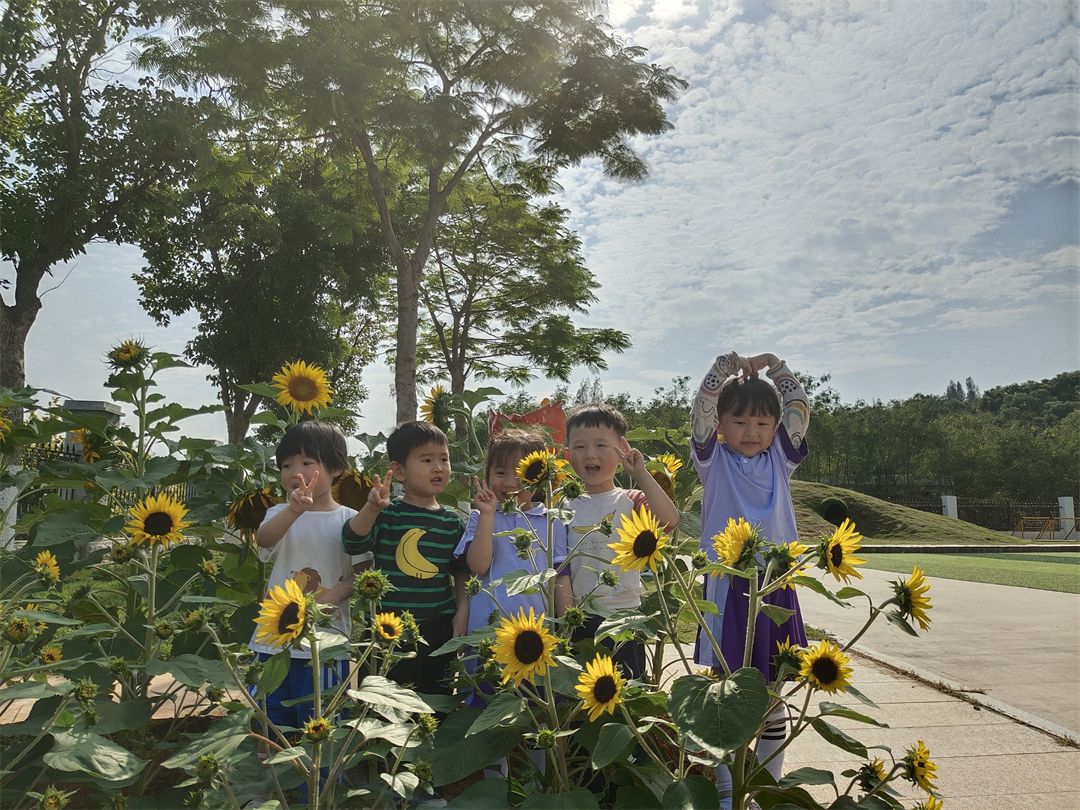 在这个美好的月份,我们春天的播种终于迎来了花开。让我们一起来感受一下孩子们在向日葵的枝头下欢乐的气氛吧~