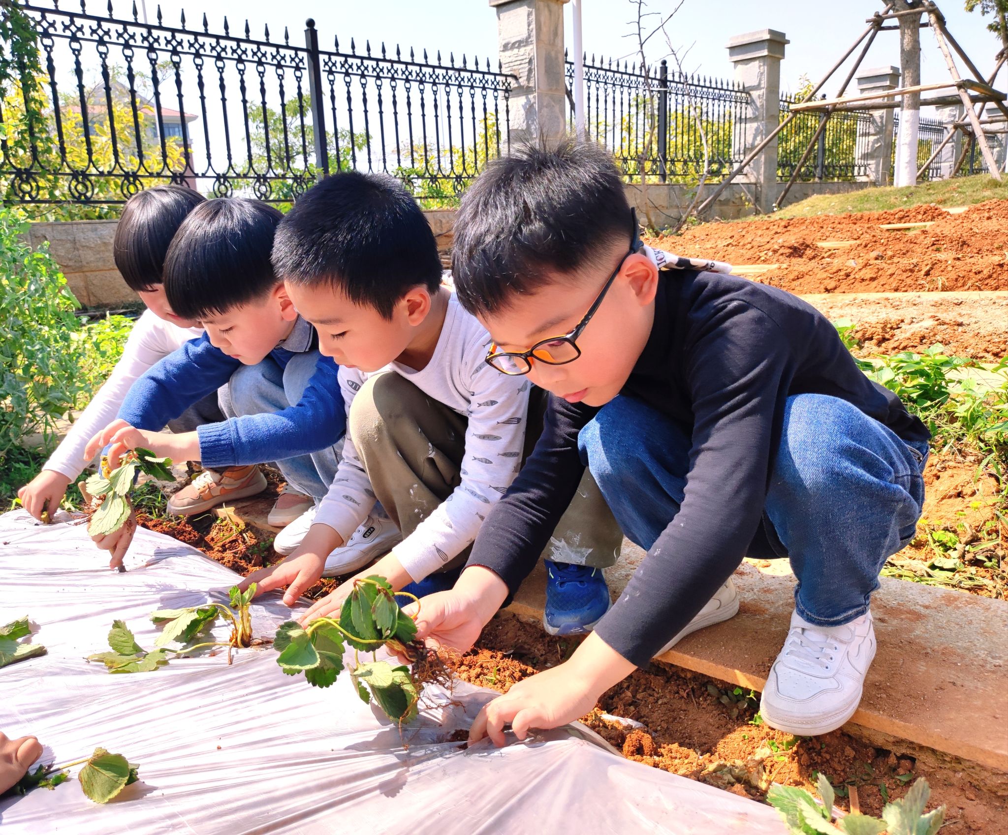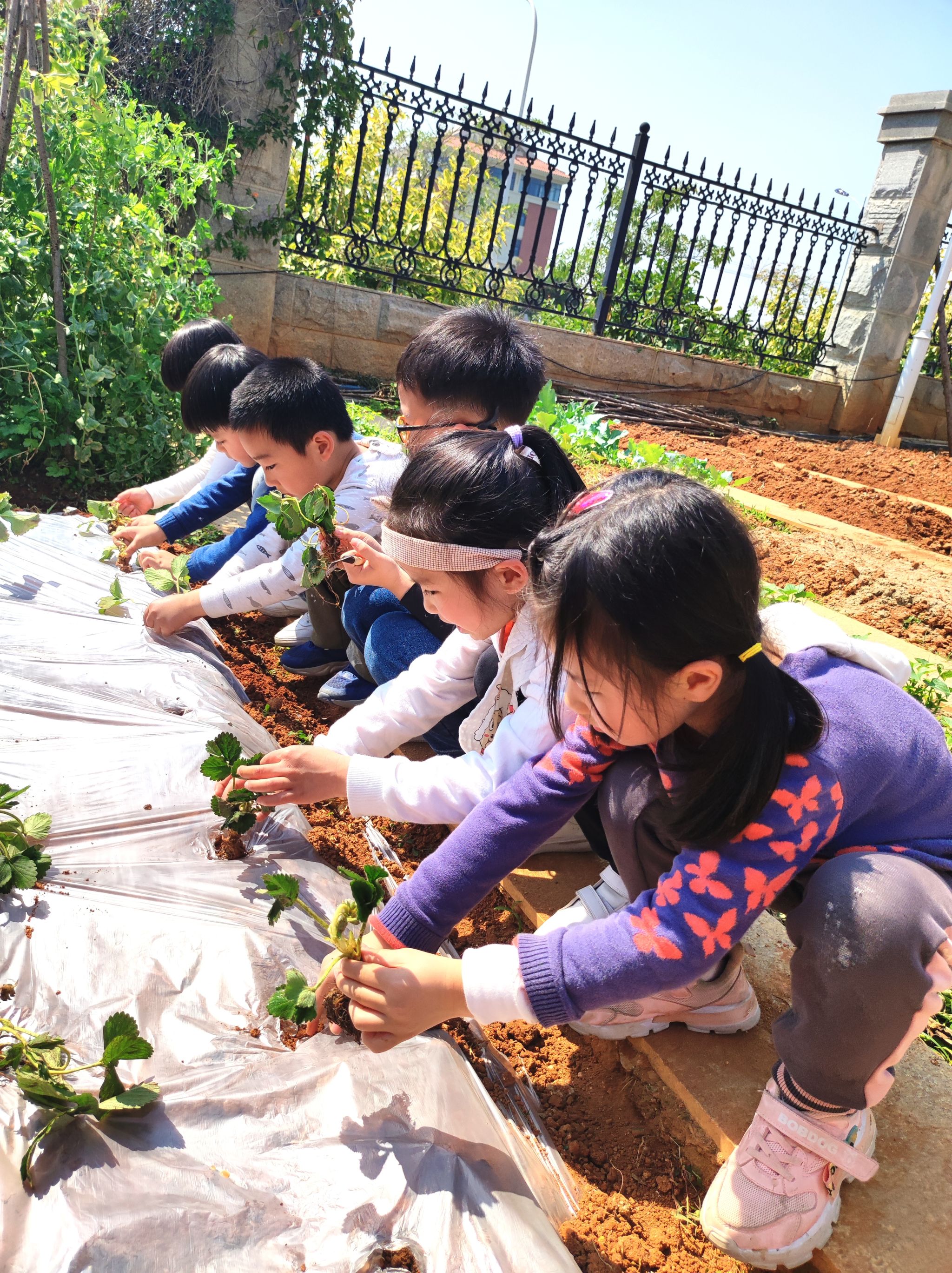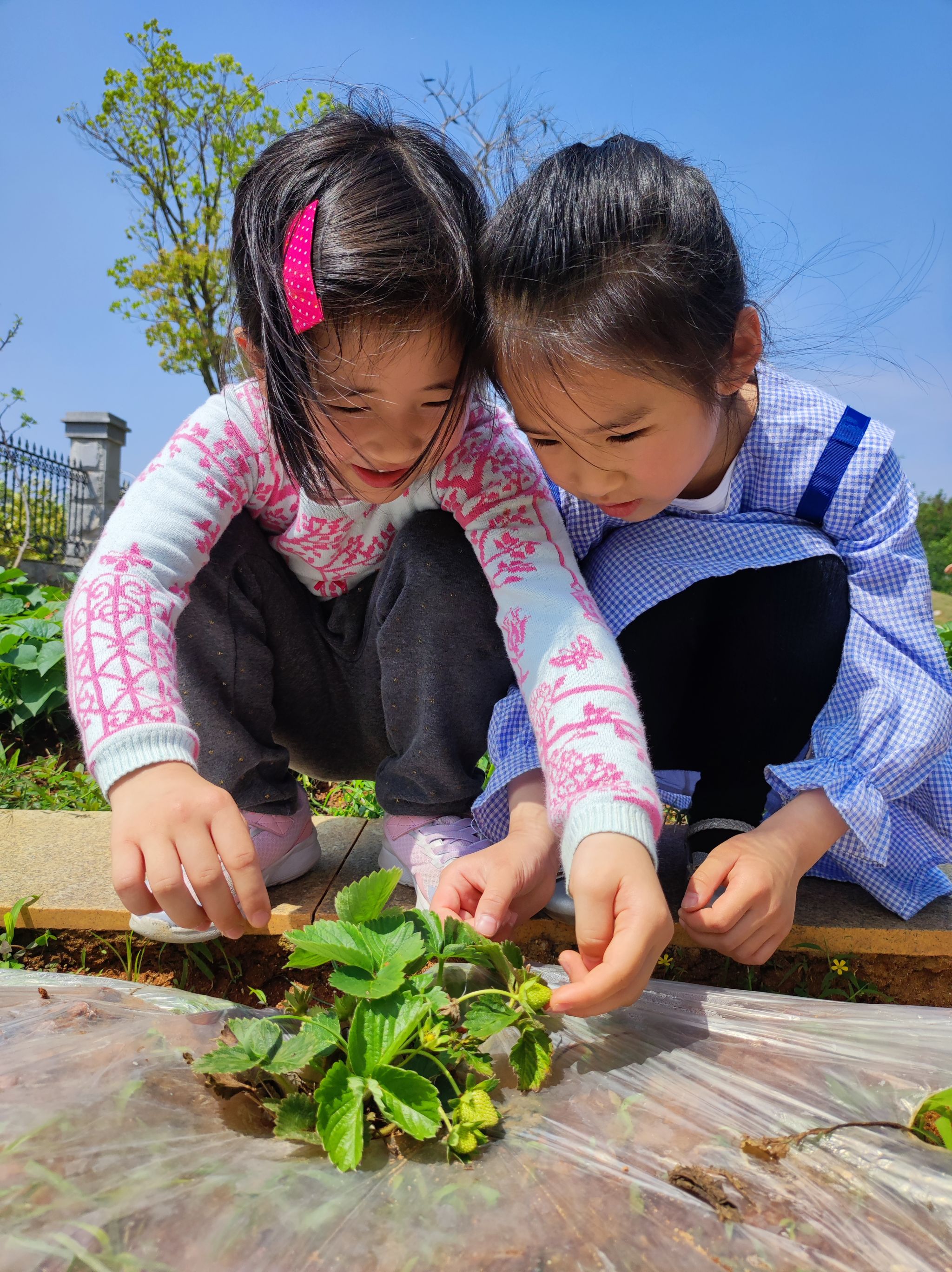 春回大地,万物复苏,遇见美好!孩子们来种草莓啦!一起动手挖坑、栽苗等,共同期待草莓开花结果吧!