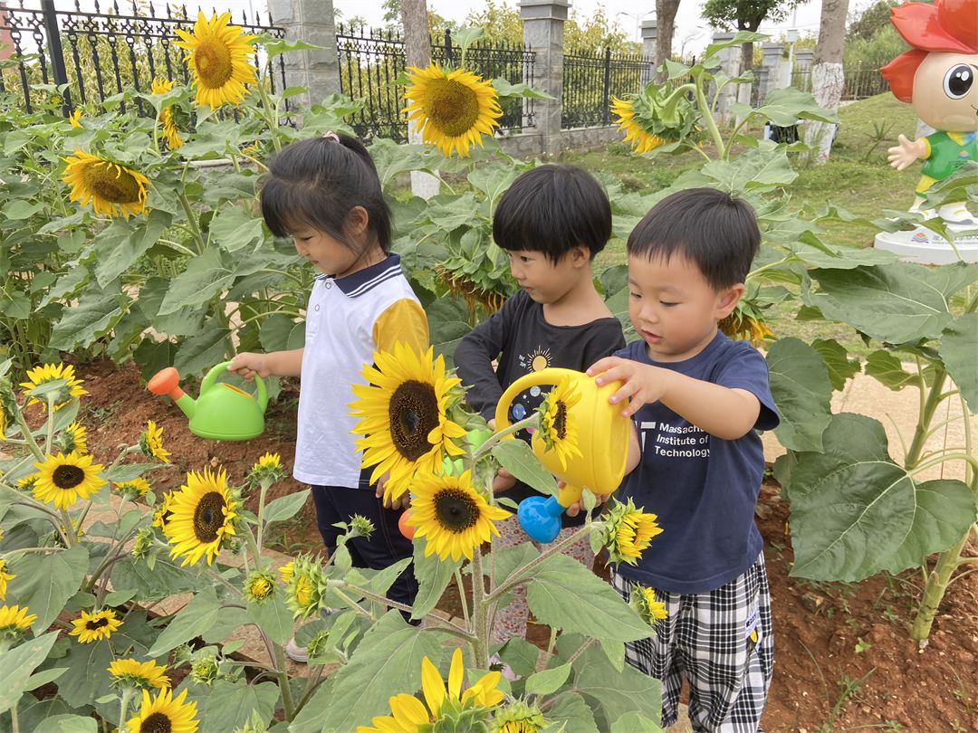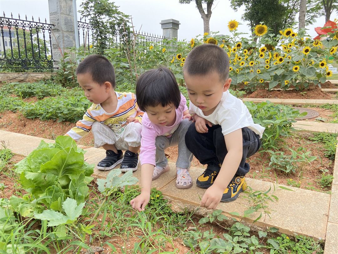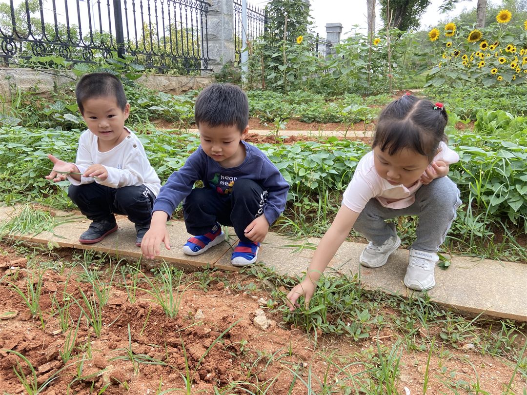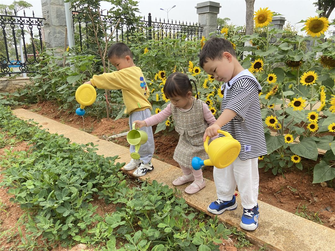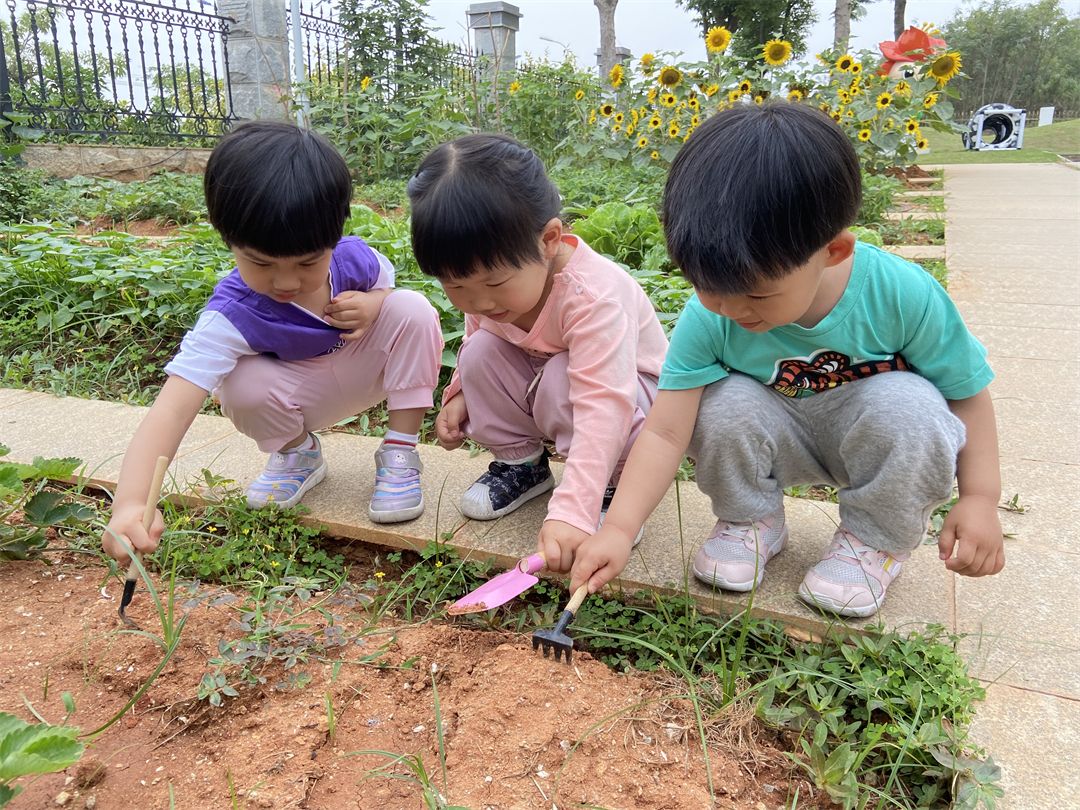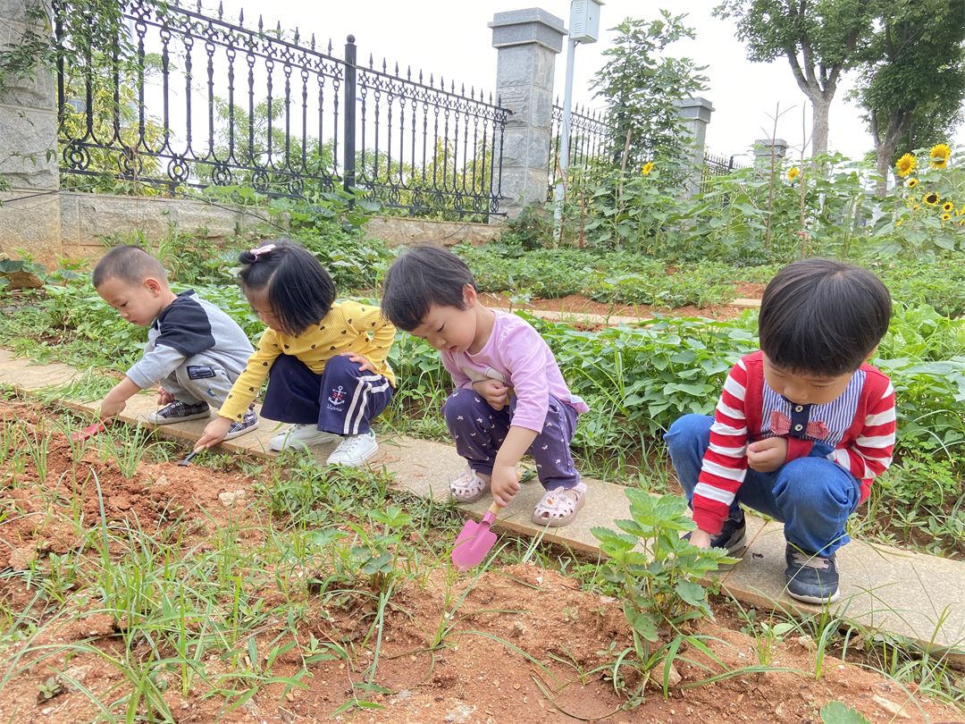宝贝们还带上了小水壶、小铲子、小耙子来给我们的小菜园浇浇水、松松土、拔拔杂草,用他们能干的小手保护我们的小菜园。