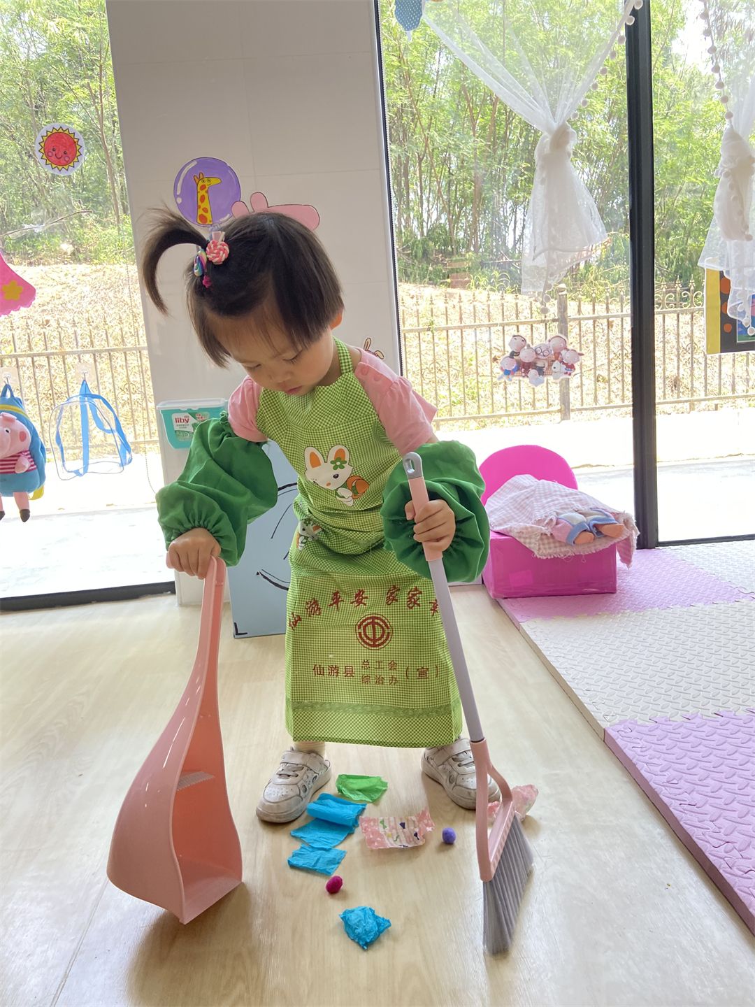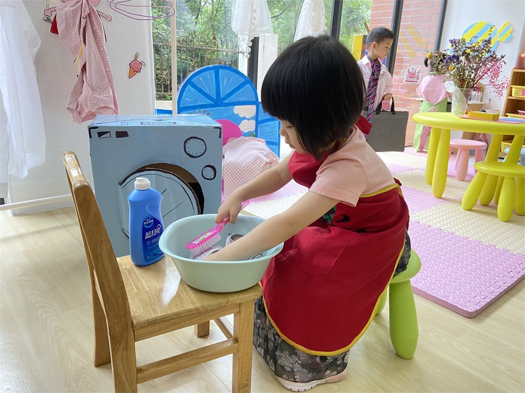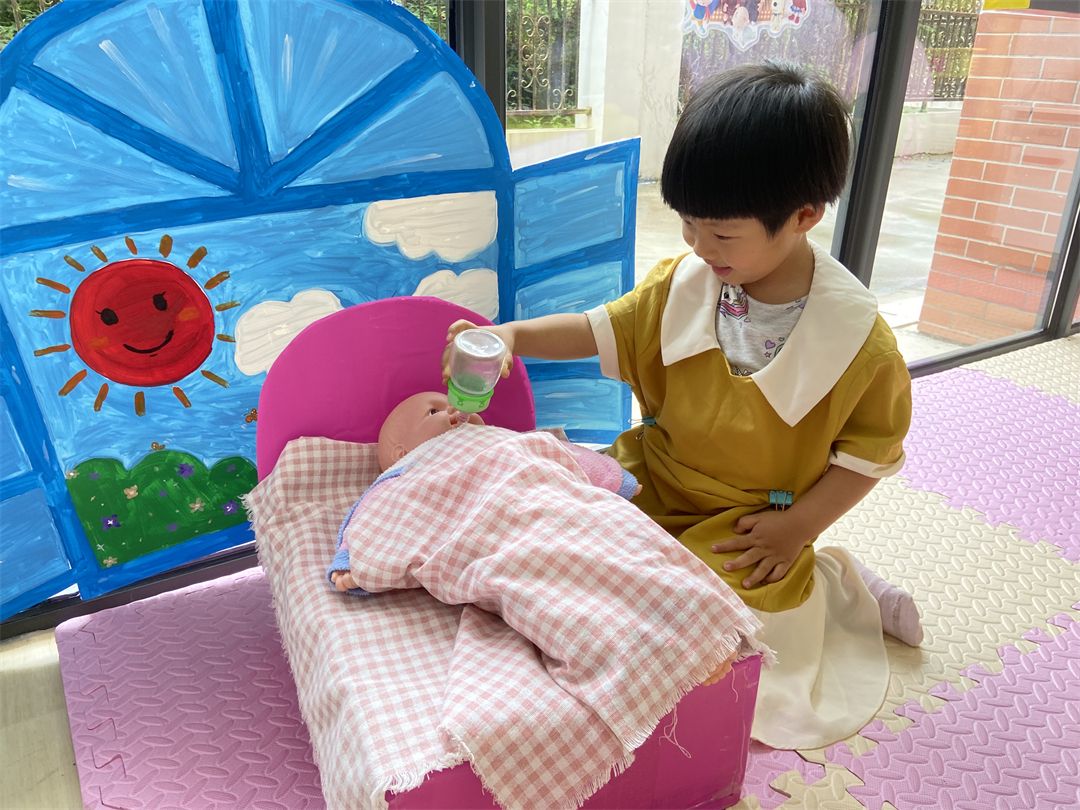 在玩区域游戏时,宝贝们玩得也是有模有样的,像个小大人一样当起了爸爸妈妈,给宝宝喂奶、煮饭、打扫卫生等等。