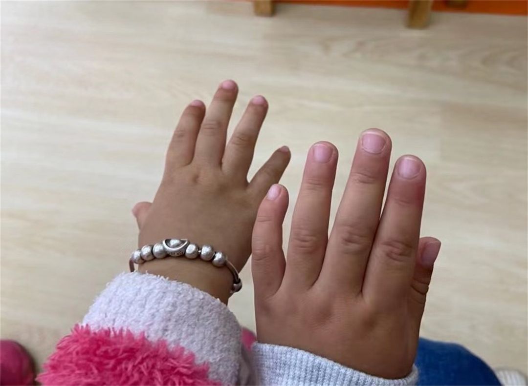 “我们的小手长得不一样哦,你白白的,我黑黑的。”