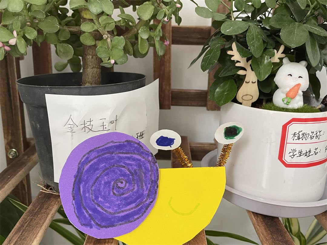 孩子们想到了一个好办法,我们可以把蜗牛放在植物角进行装饰。