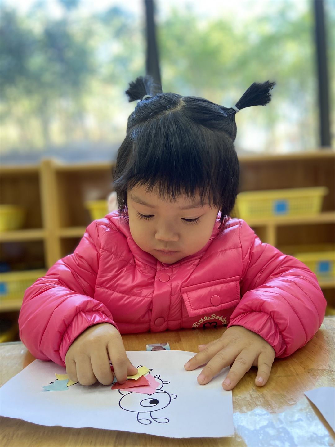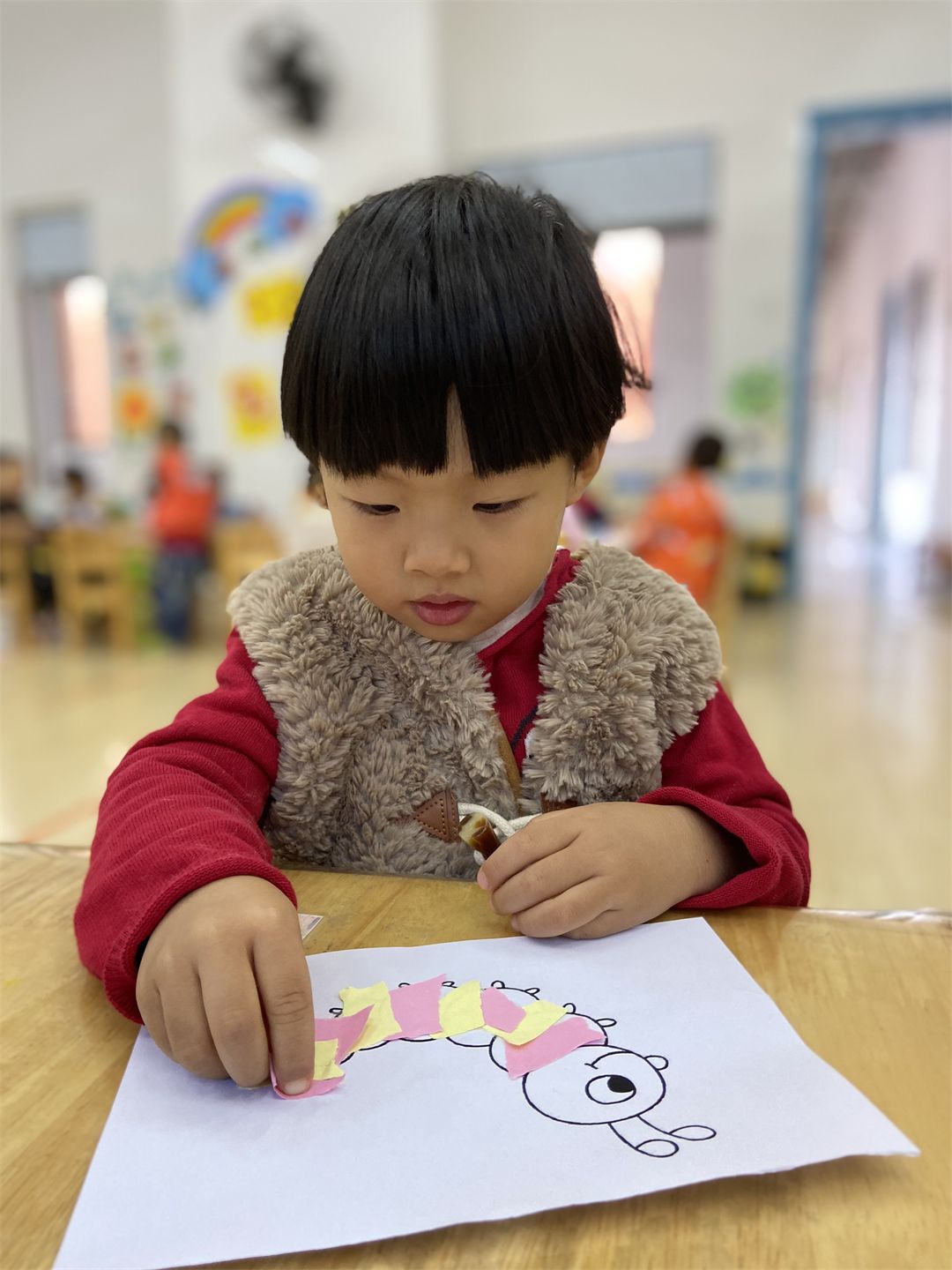 在一双双巧手的操作下,五颜六色的大纸片转眼间变成了装饰品。