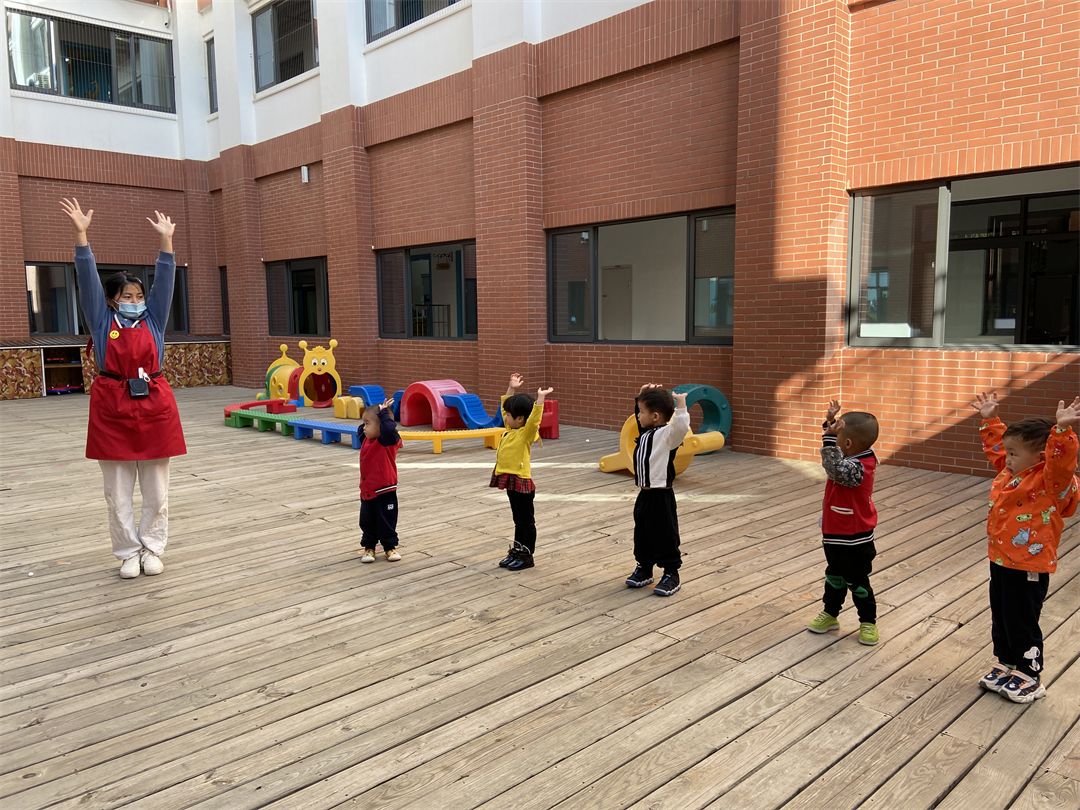 “举起双手,跳一跳....”在中庭里响起欢快的音乐声,宝贝们快乐的跟着老师一起做热身运动!