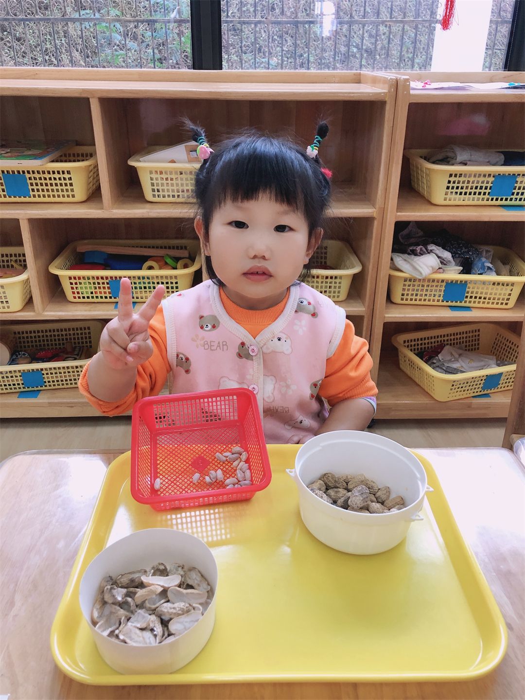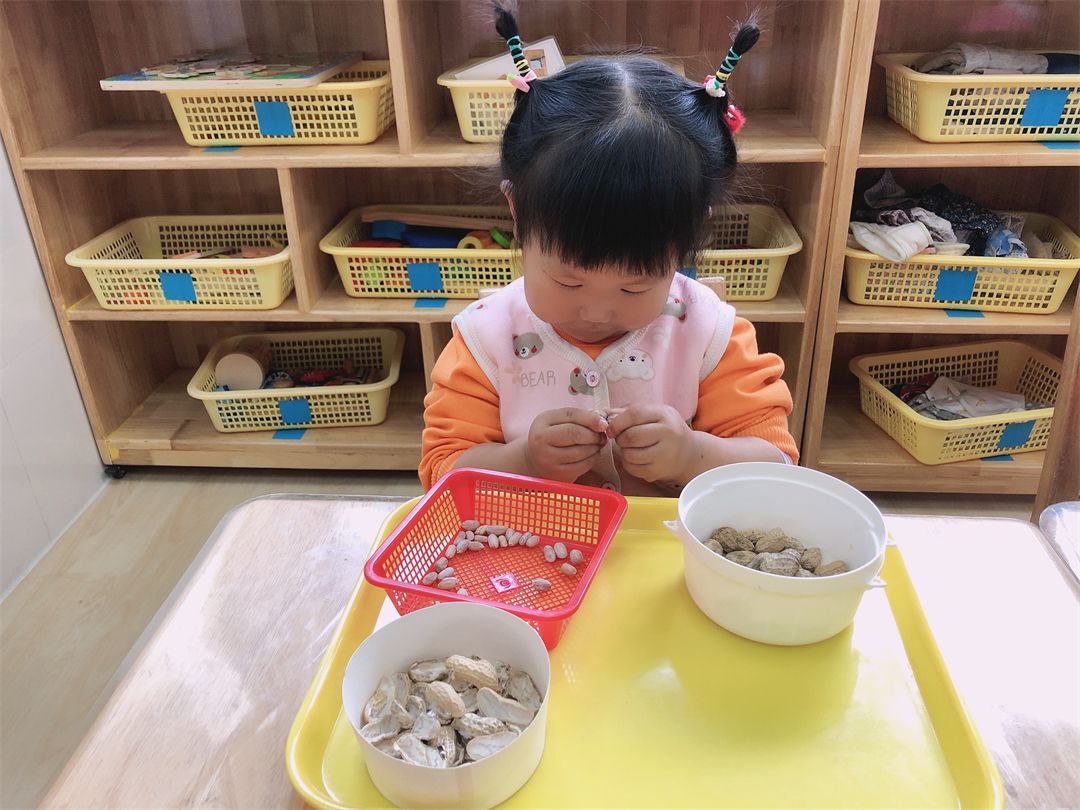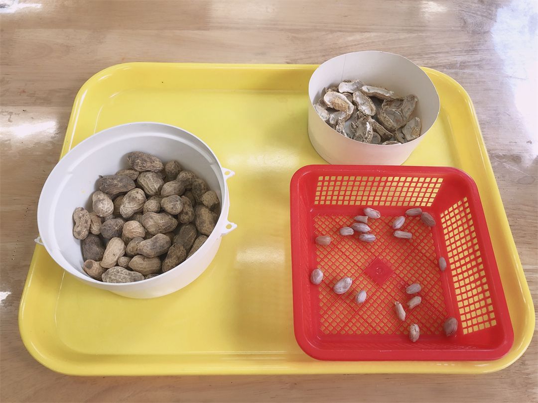 小手用力捏一捏,“哇,花生壳打开啦!”一盘壳儿,一盘花生,小宝贝们的巧手可真能干。瞧!孩子们看着自己剥出来的一颗颗花生,笑得多开心啊!