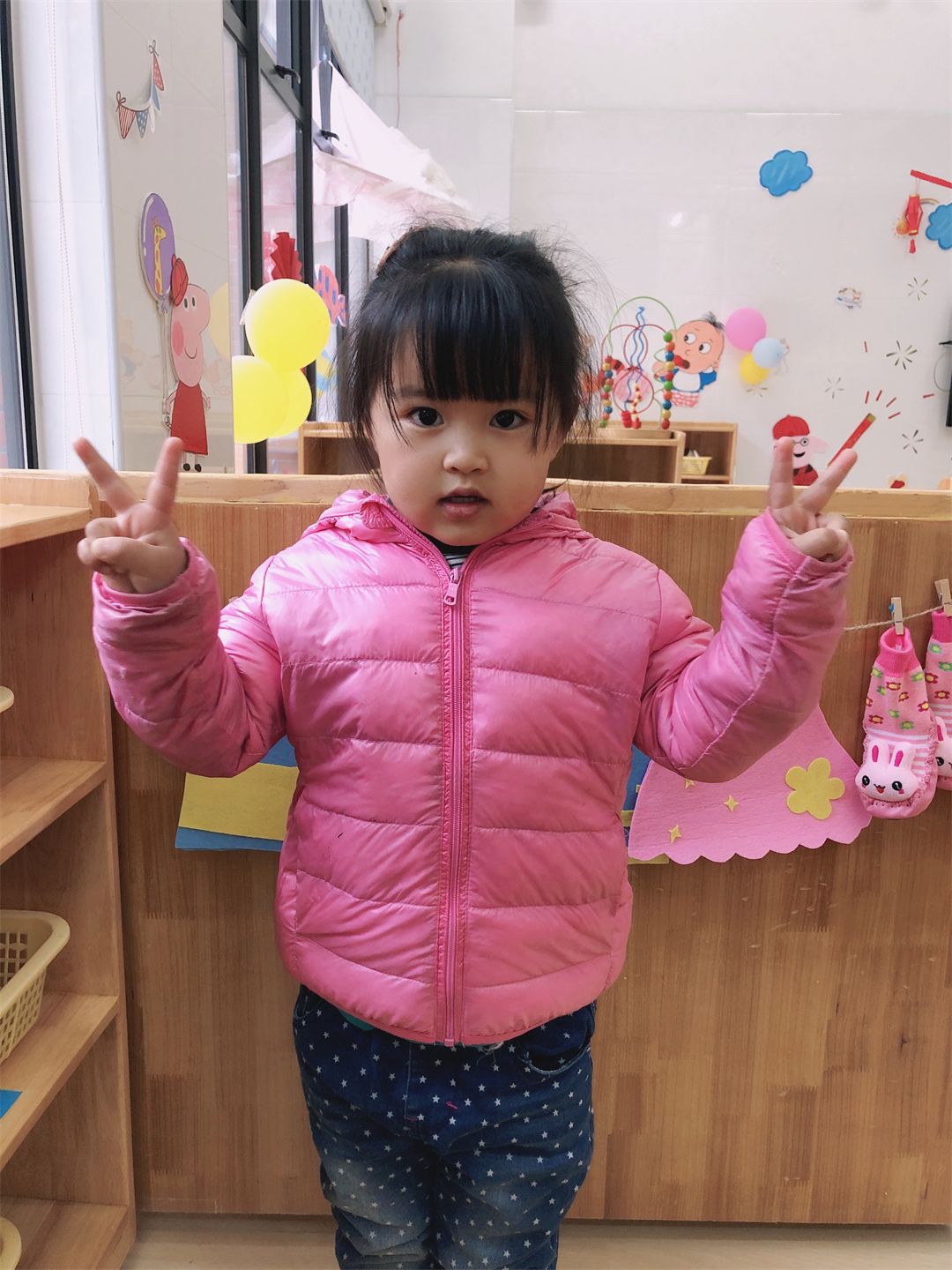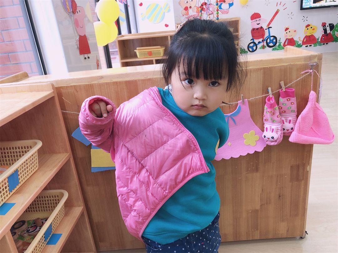 “小领口,对肚子,左钻钻,右钻钻,咻~小手举高,我的衣服穿好了!穿衣小达人就是我啦!”