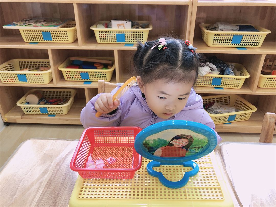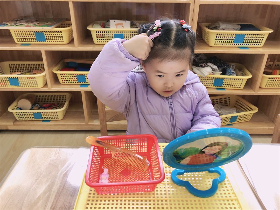 “我的两个辫子在镜子里可真好看呀,用小梳子再把头发梳整齐吧!呼——”